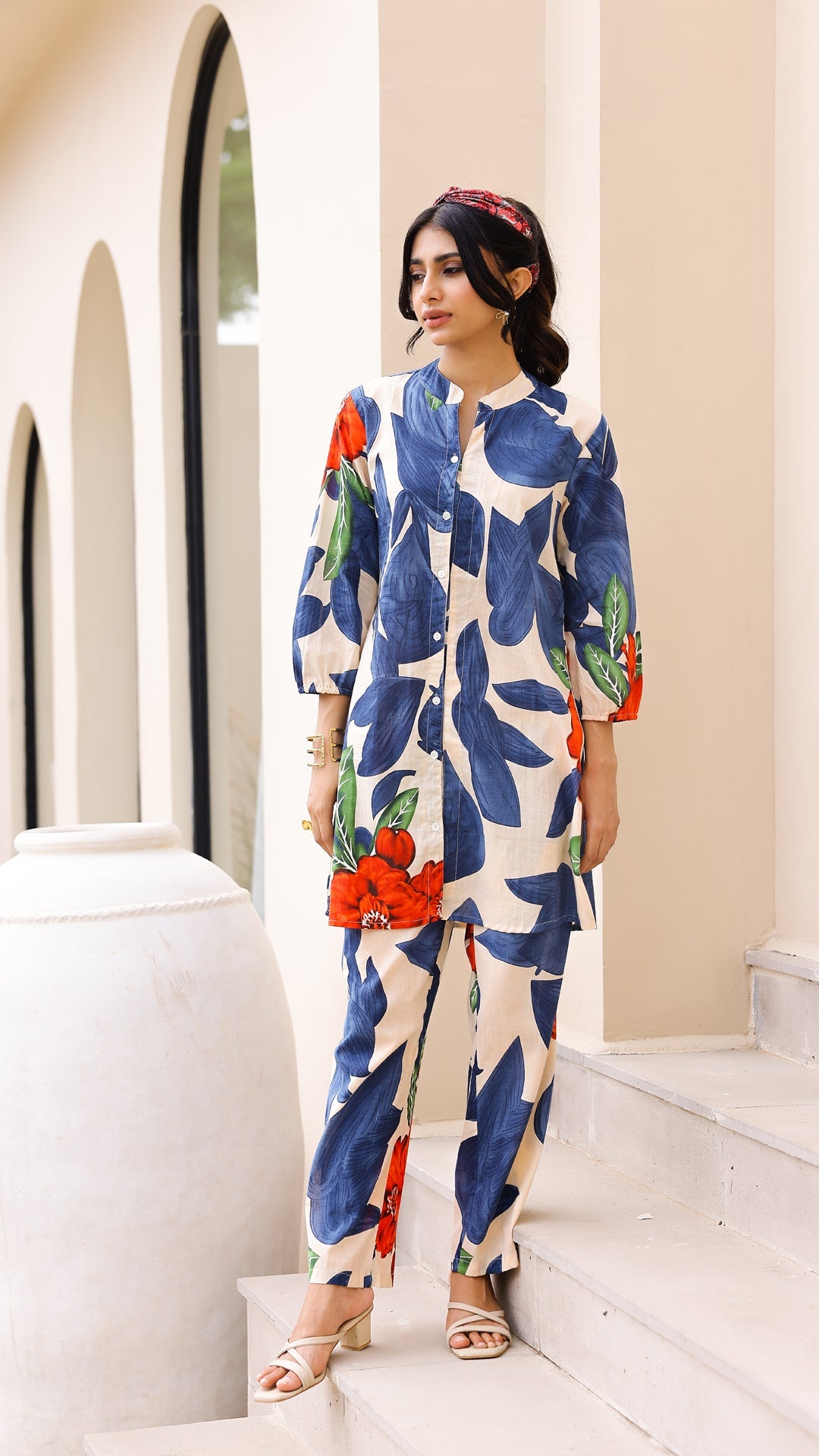Turn heads with this ivory co-ord set featuring bold blue leaf prints and vibrant red...