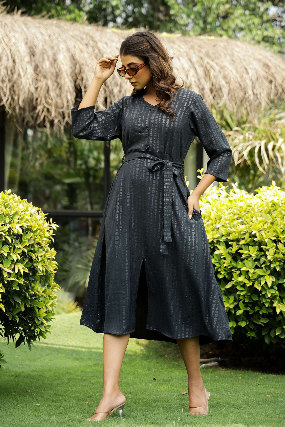Charcoal Black Belted Midi Dress with Subtle Dot Print