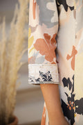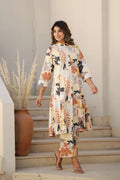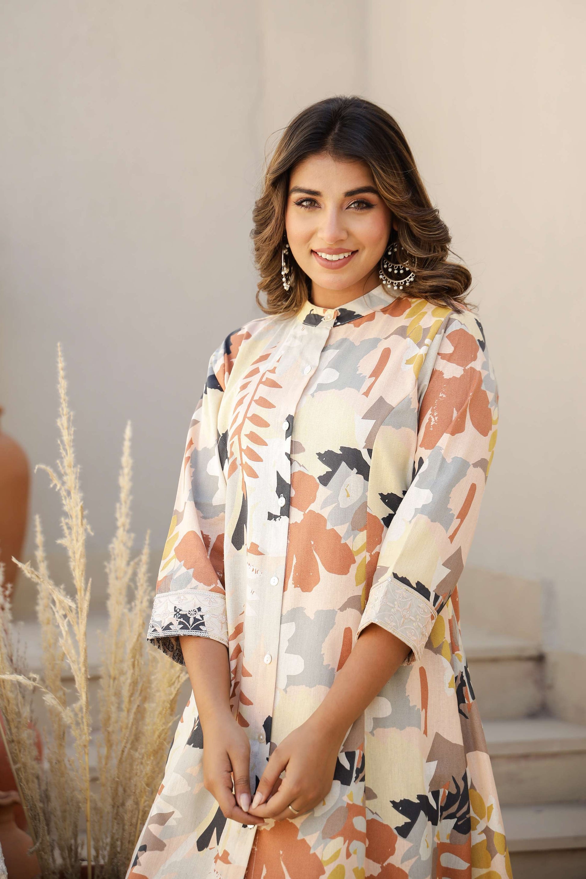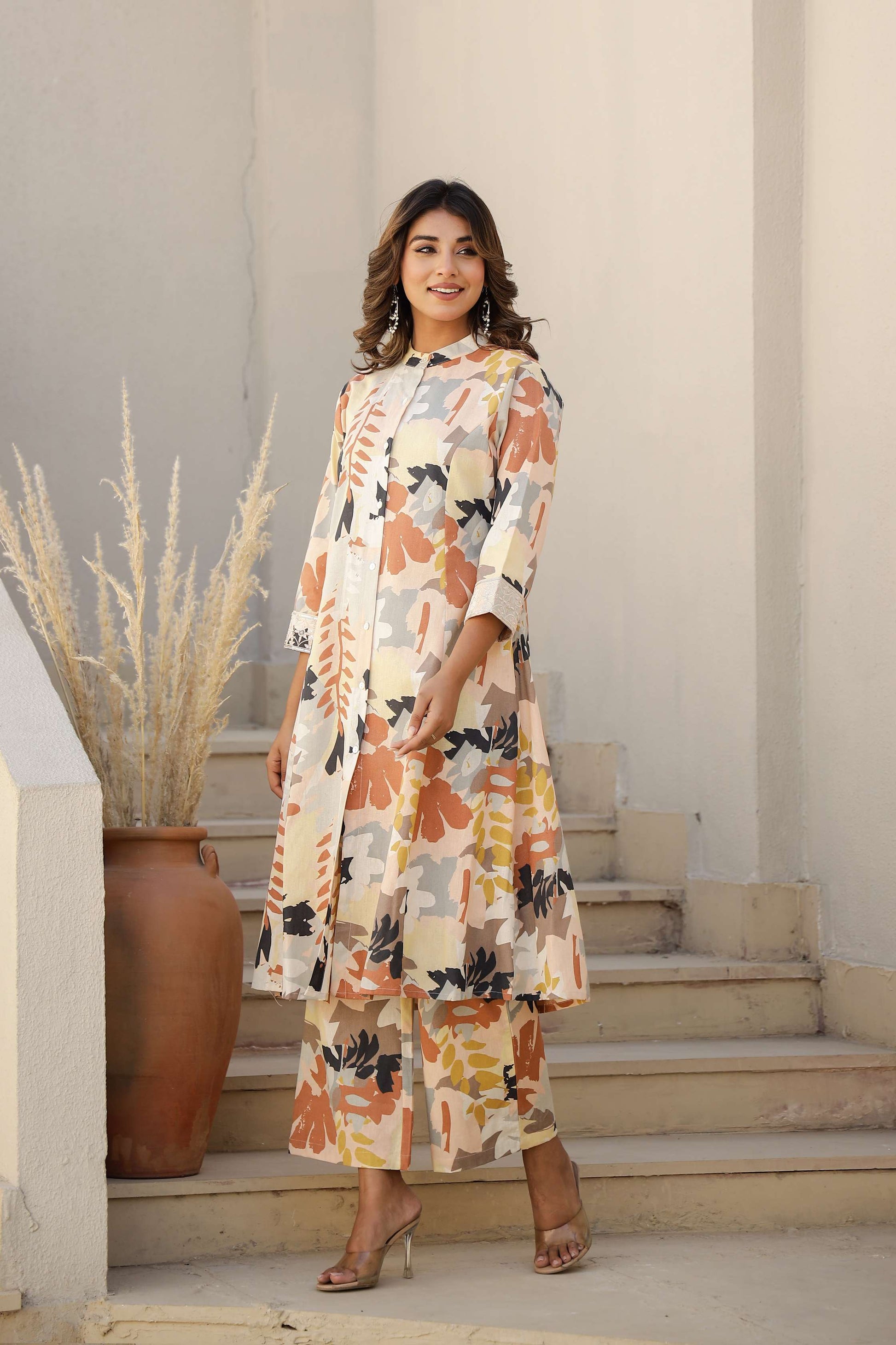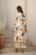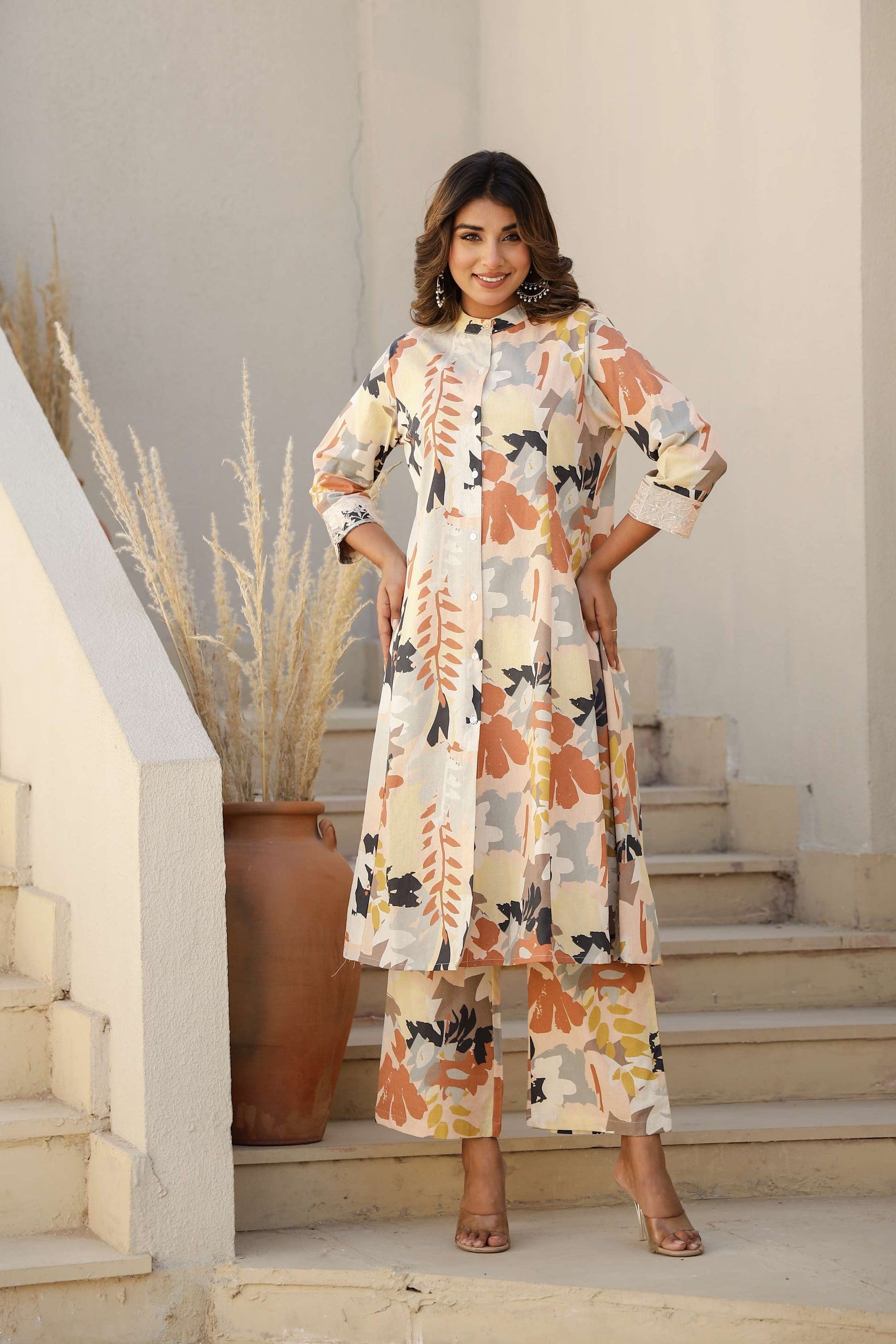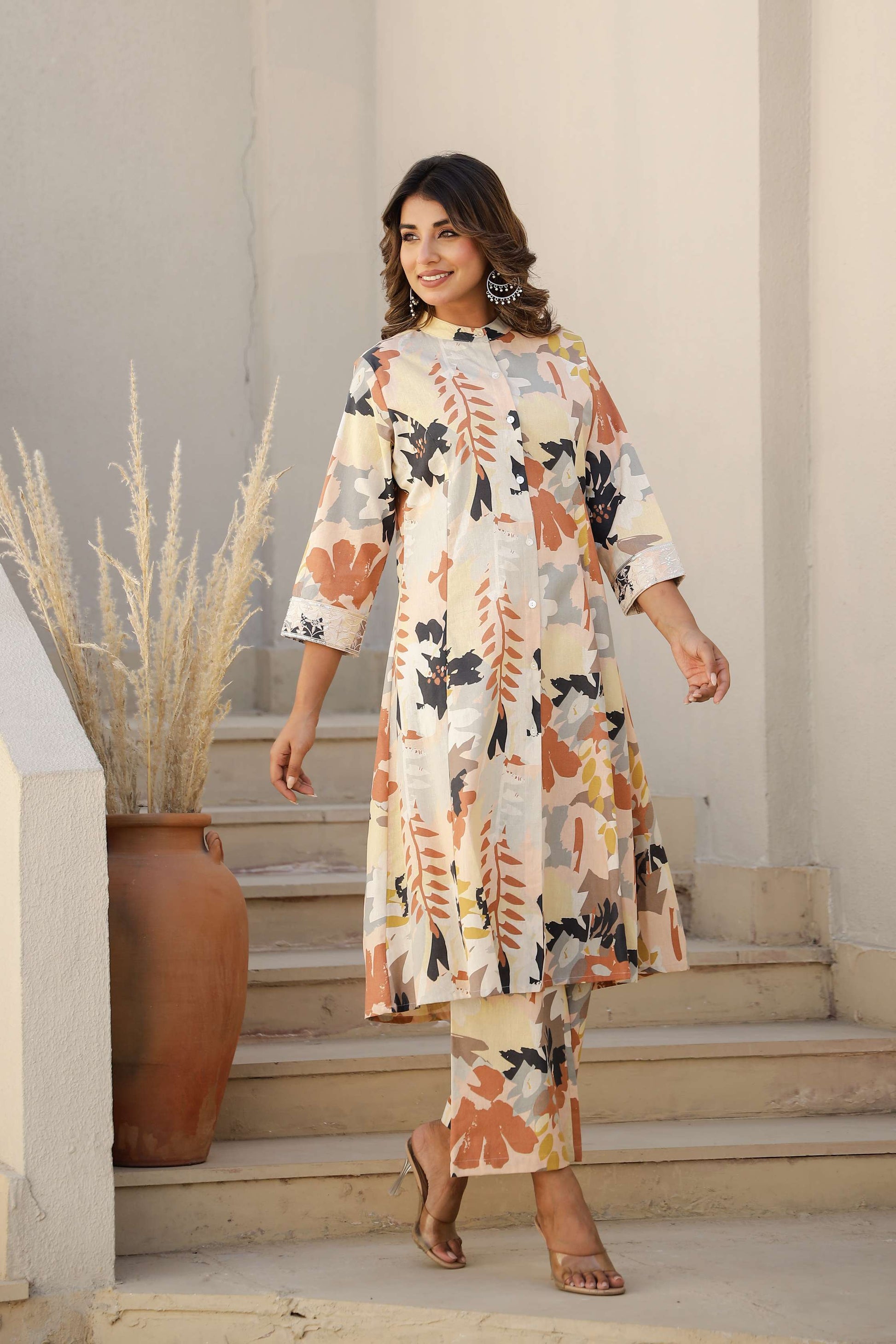 Bring effortless elegance to your everyday style with this Cotton Flax A-line Kurta Set. Designed with a button-down silhouette, this co-ord set features a soft off-white base enhanced by black & rust floral abstract prints. The intricate handcrafted embroidery on the sleeve cuffs adds a refined ethnic charm. Perfect for festive occasions, casual outings, or work wear.