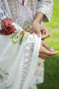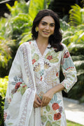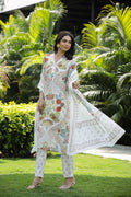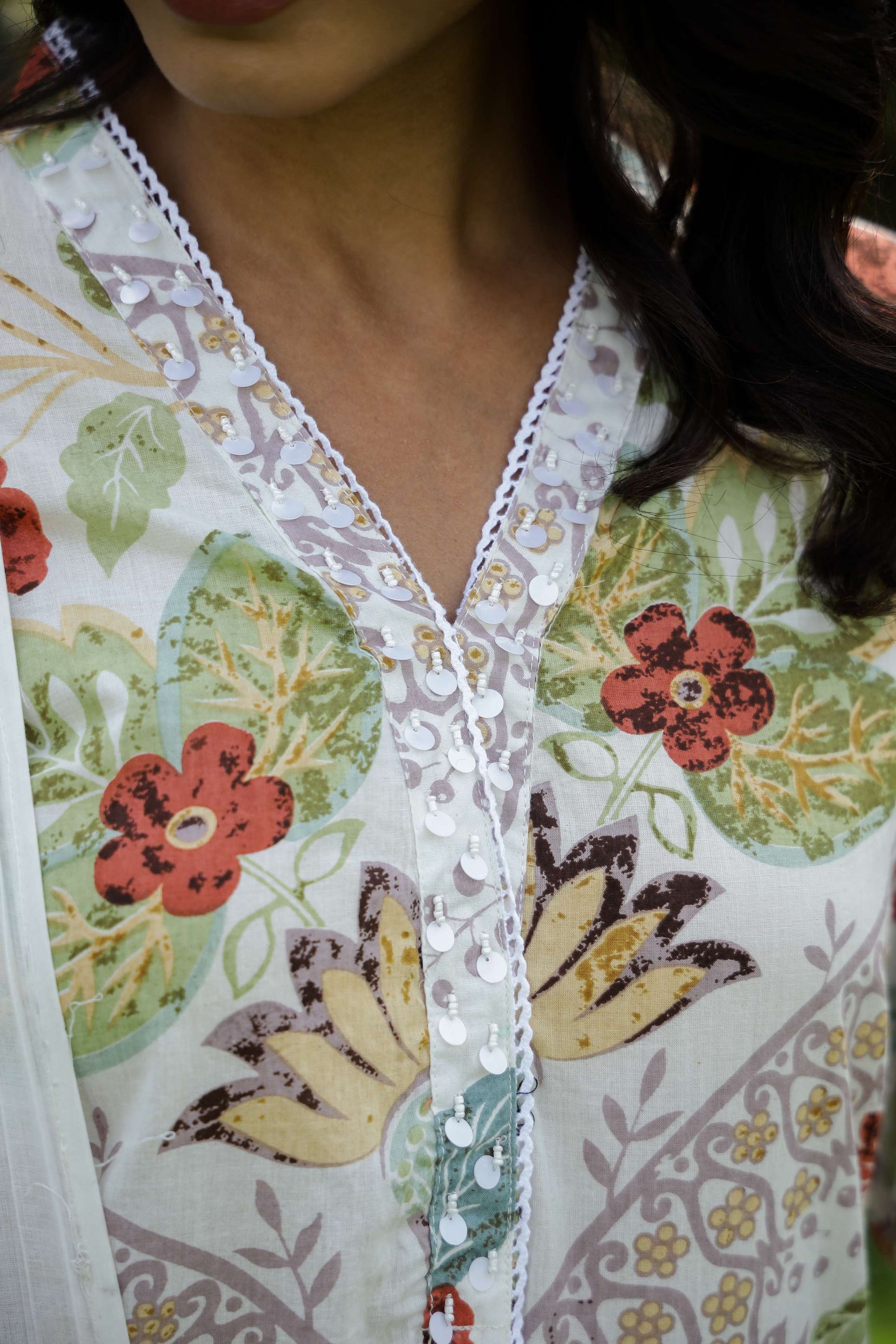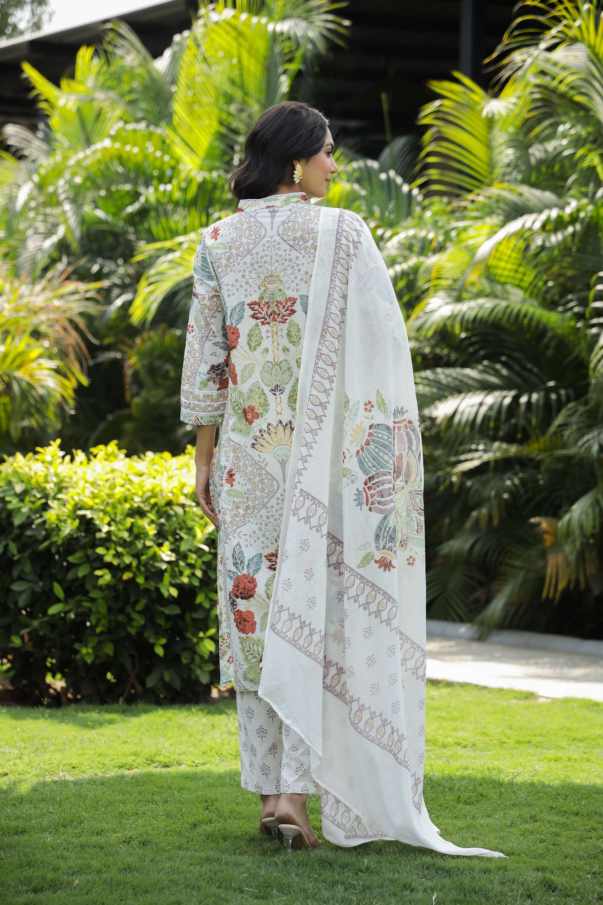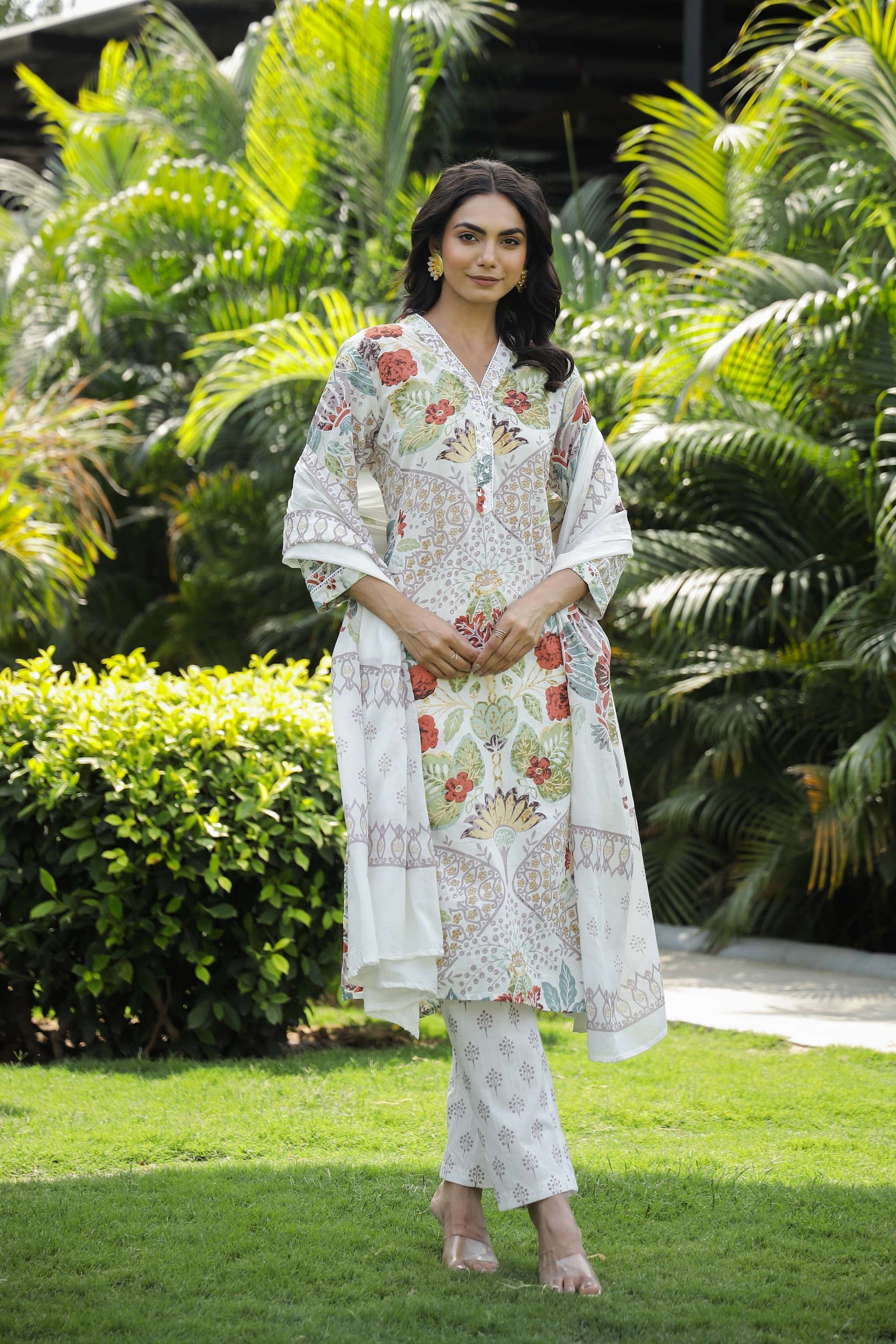 White Floral Printed Cotton Kurta Set with Dupatta & Pants