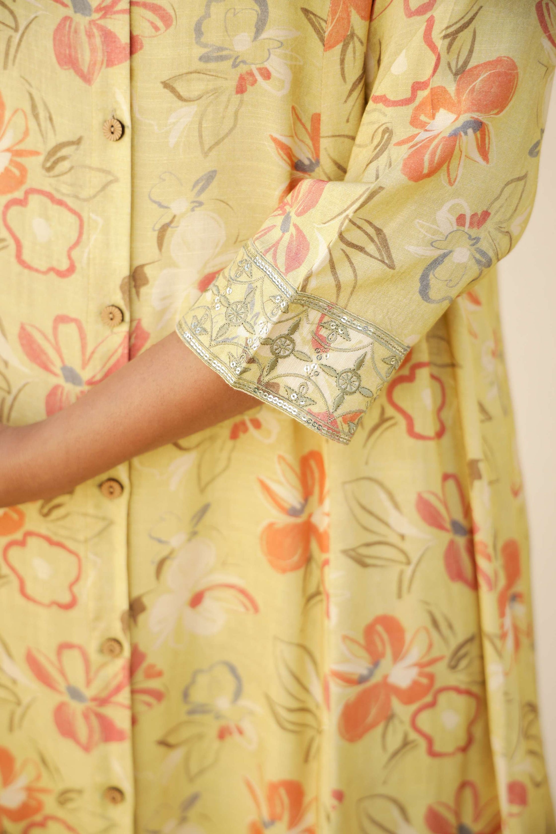 Brighten up your look with this yellow floral printed kurta set. Made from soft cotton, it features a button-down kurta with vibrant floral motifs and matching straight pants. A cheerful outfit for festive occasions, casual gatherings, or office wear.