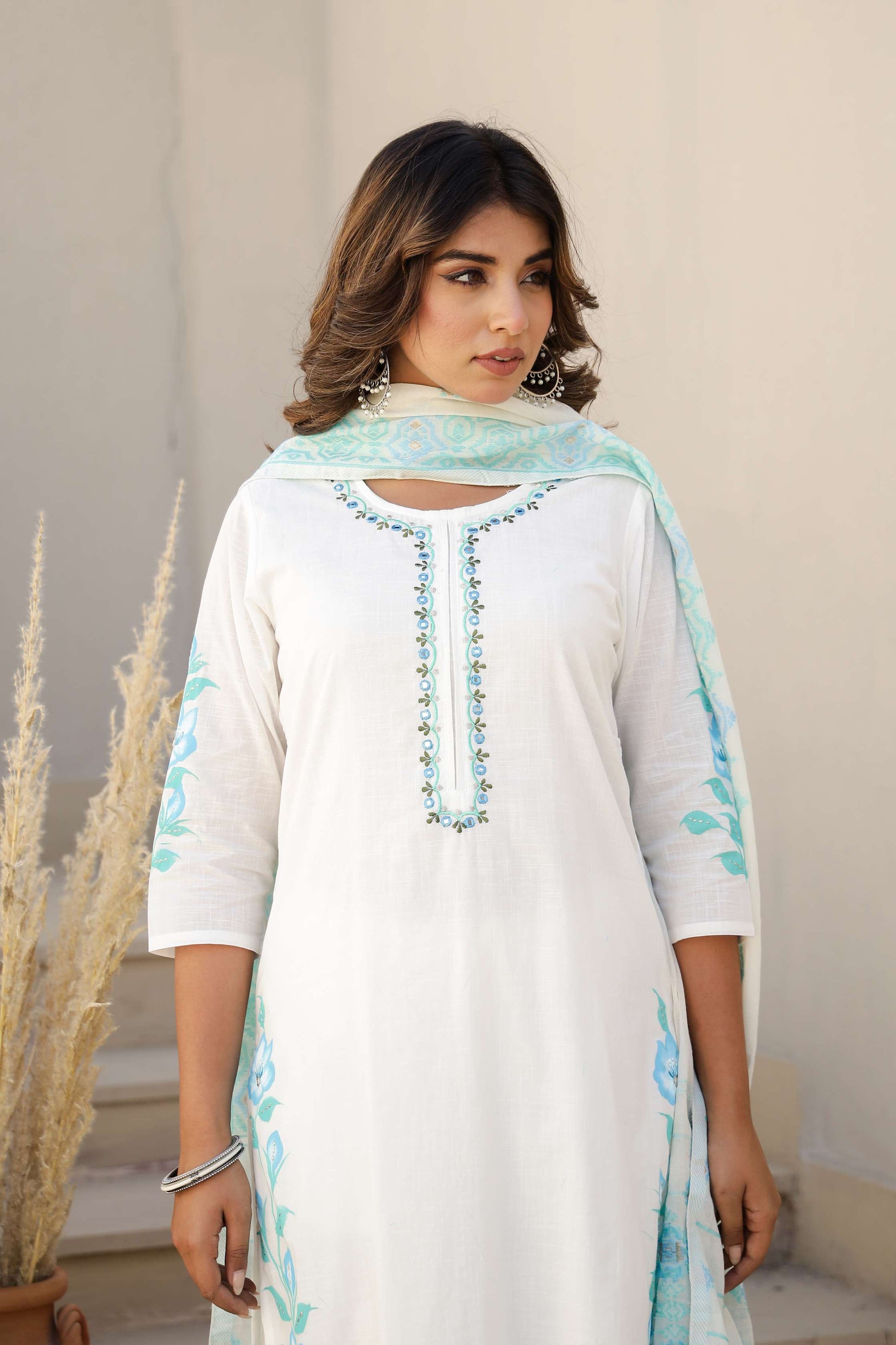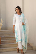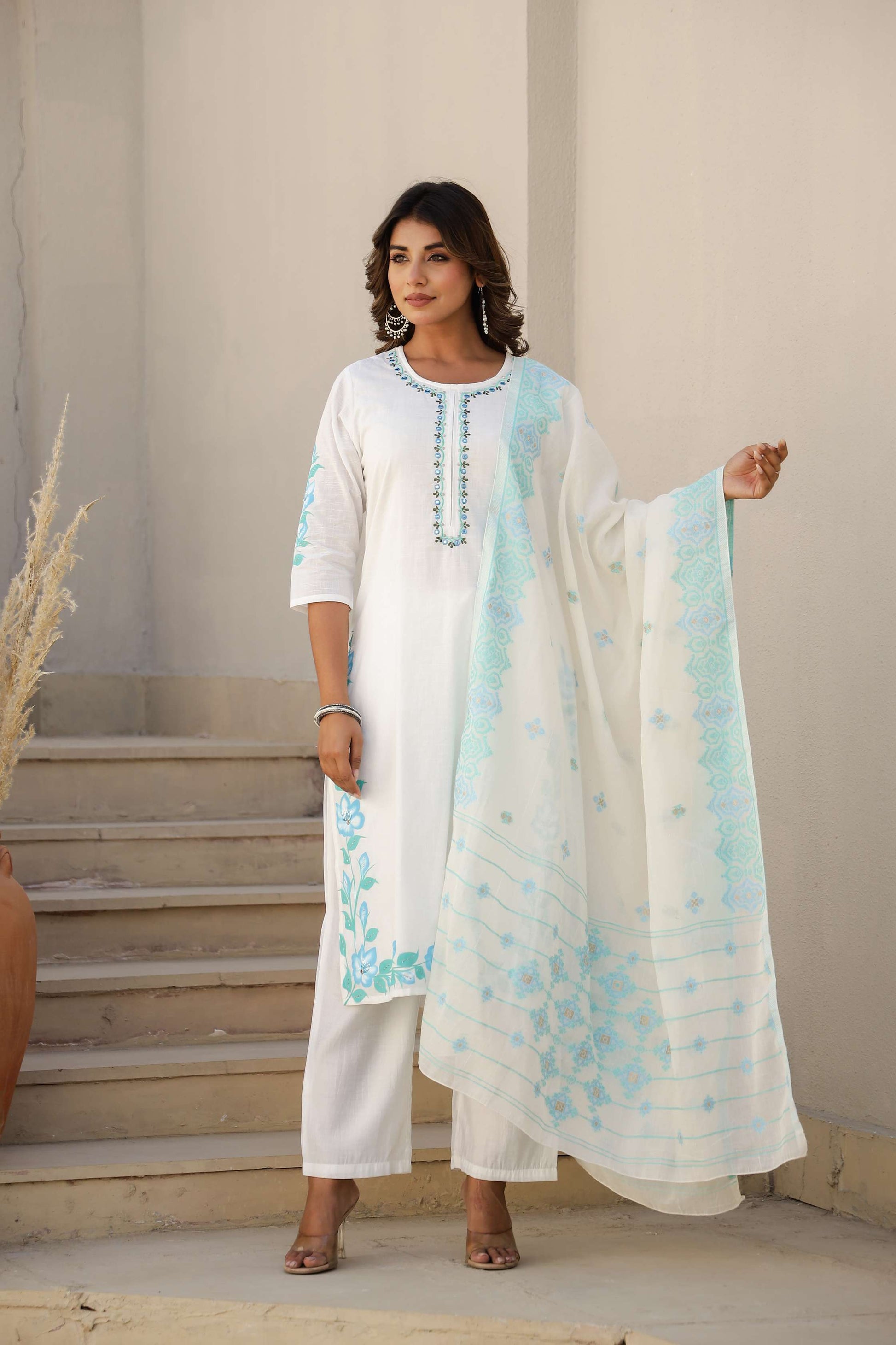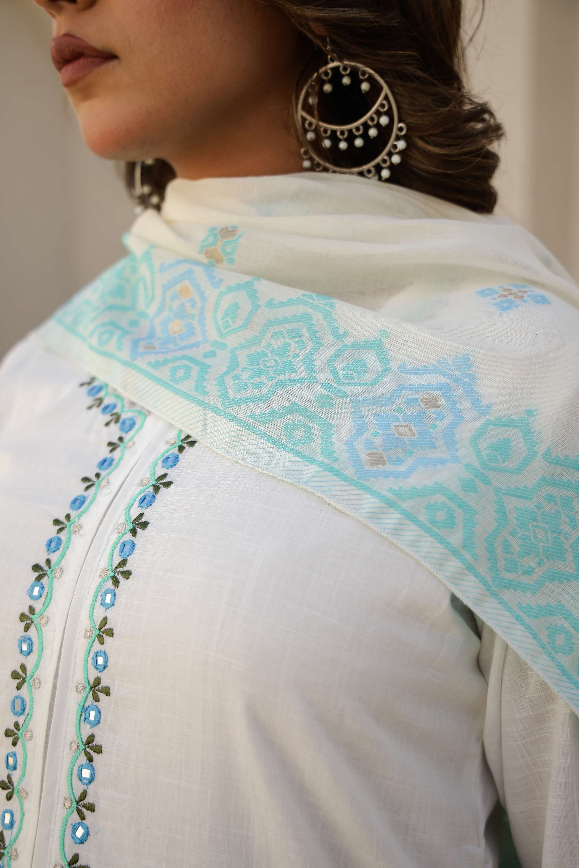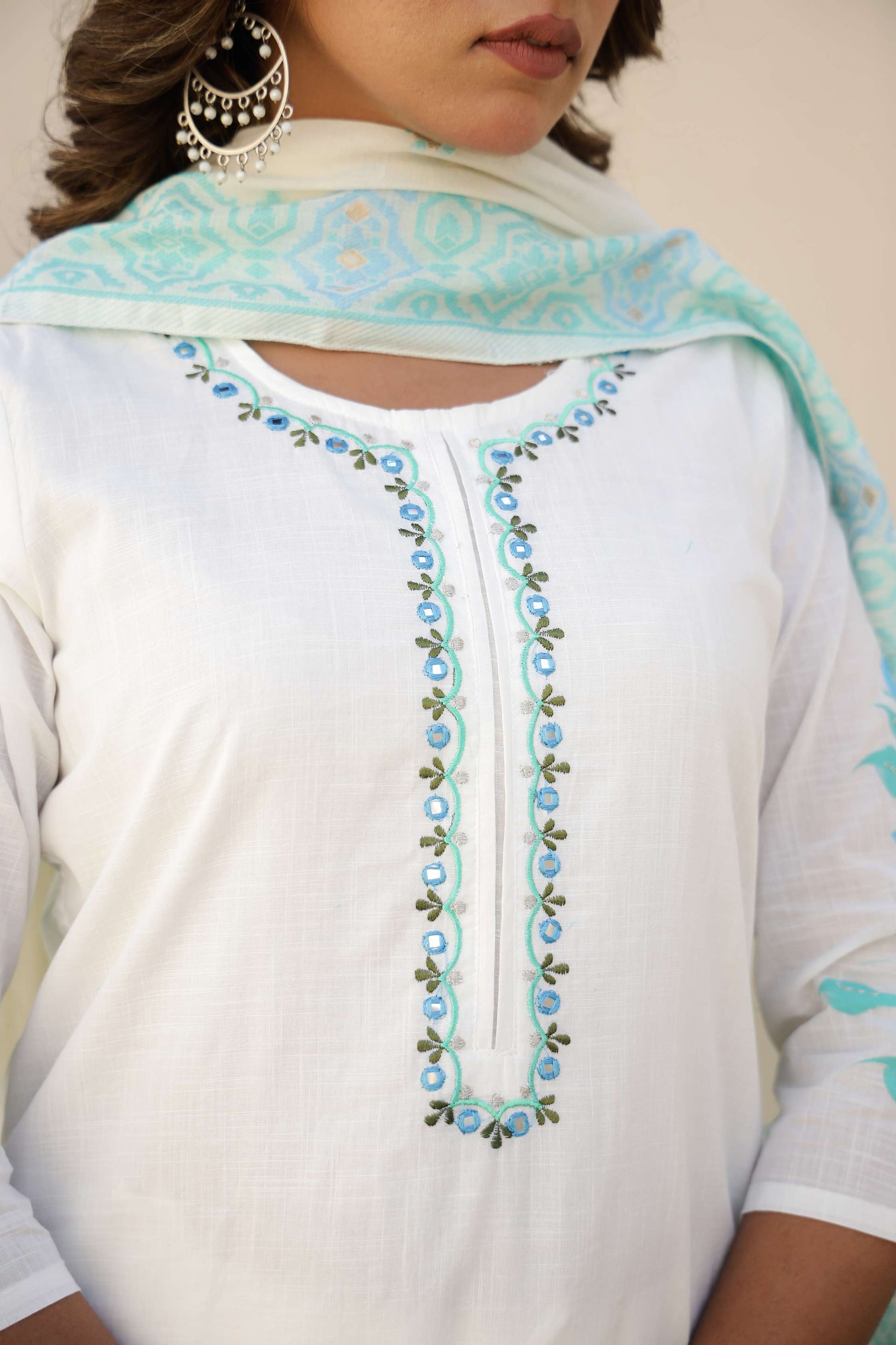 A perfect blend of elegance and comfort, this white cotton kurta set is enhanced with delicate sky blue embroidery. Its refreshing color palette makes it a graceful choice for festive events, office wear, and summer outings.
