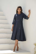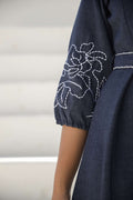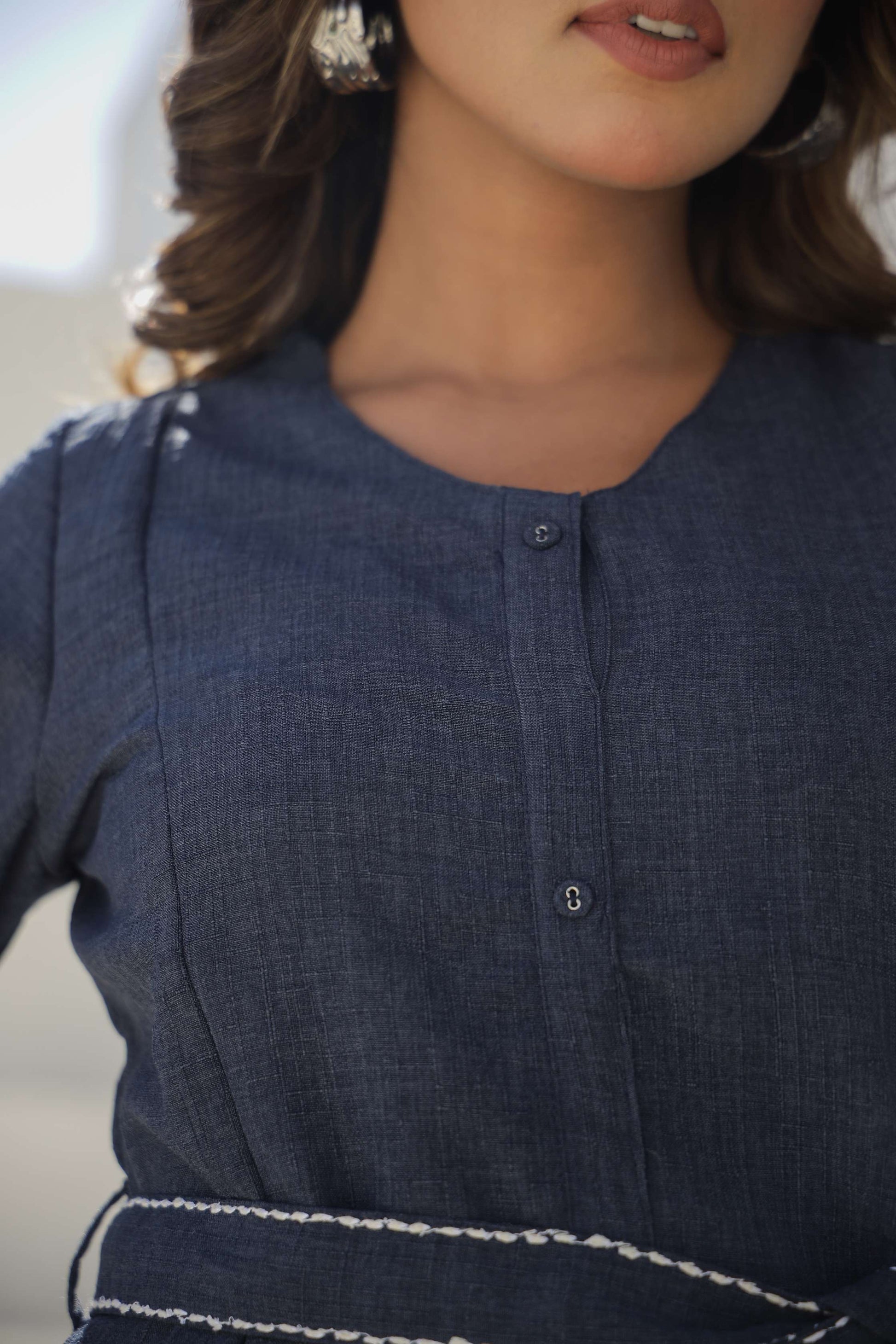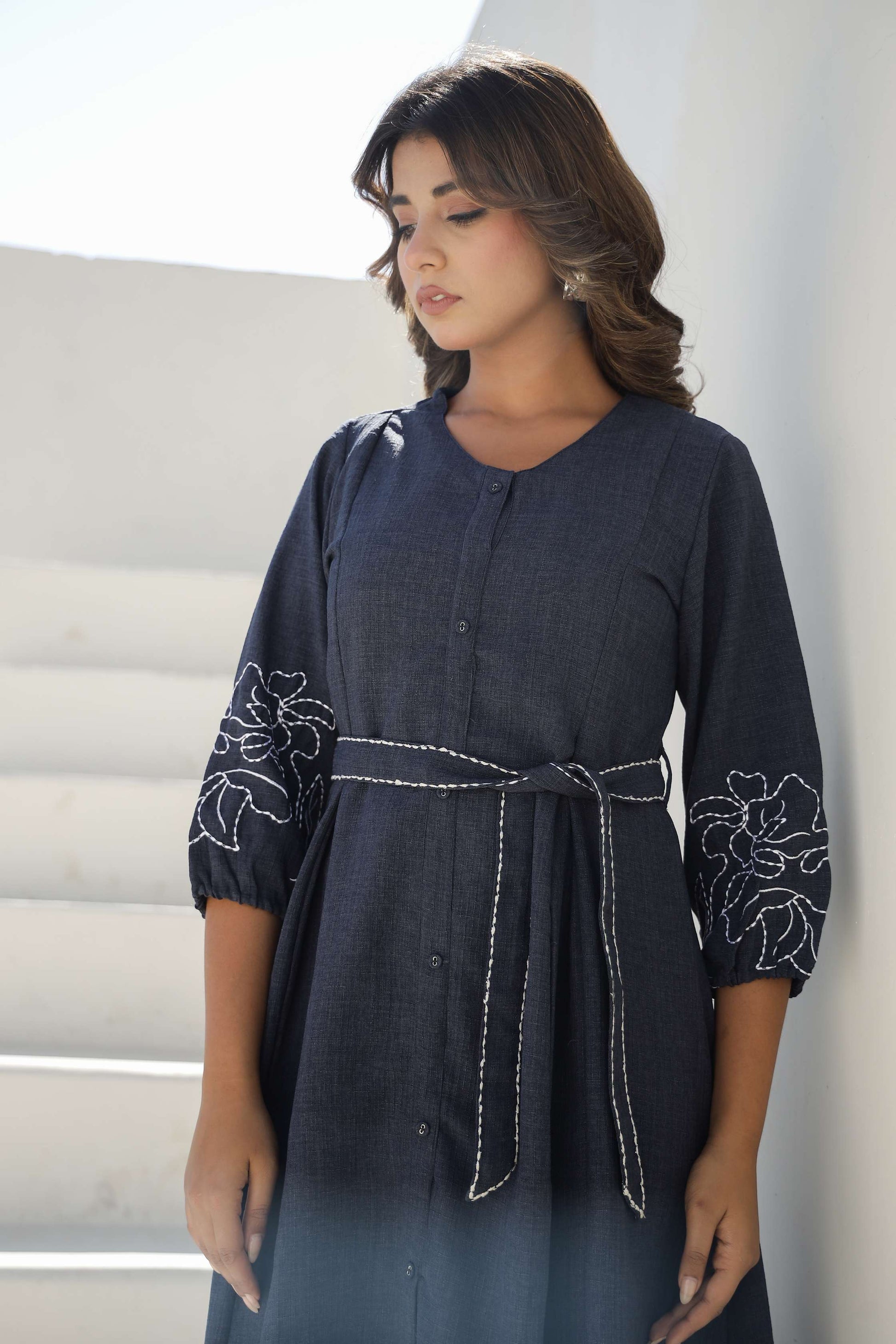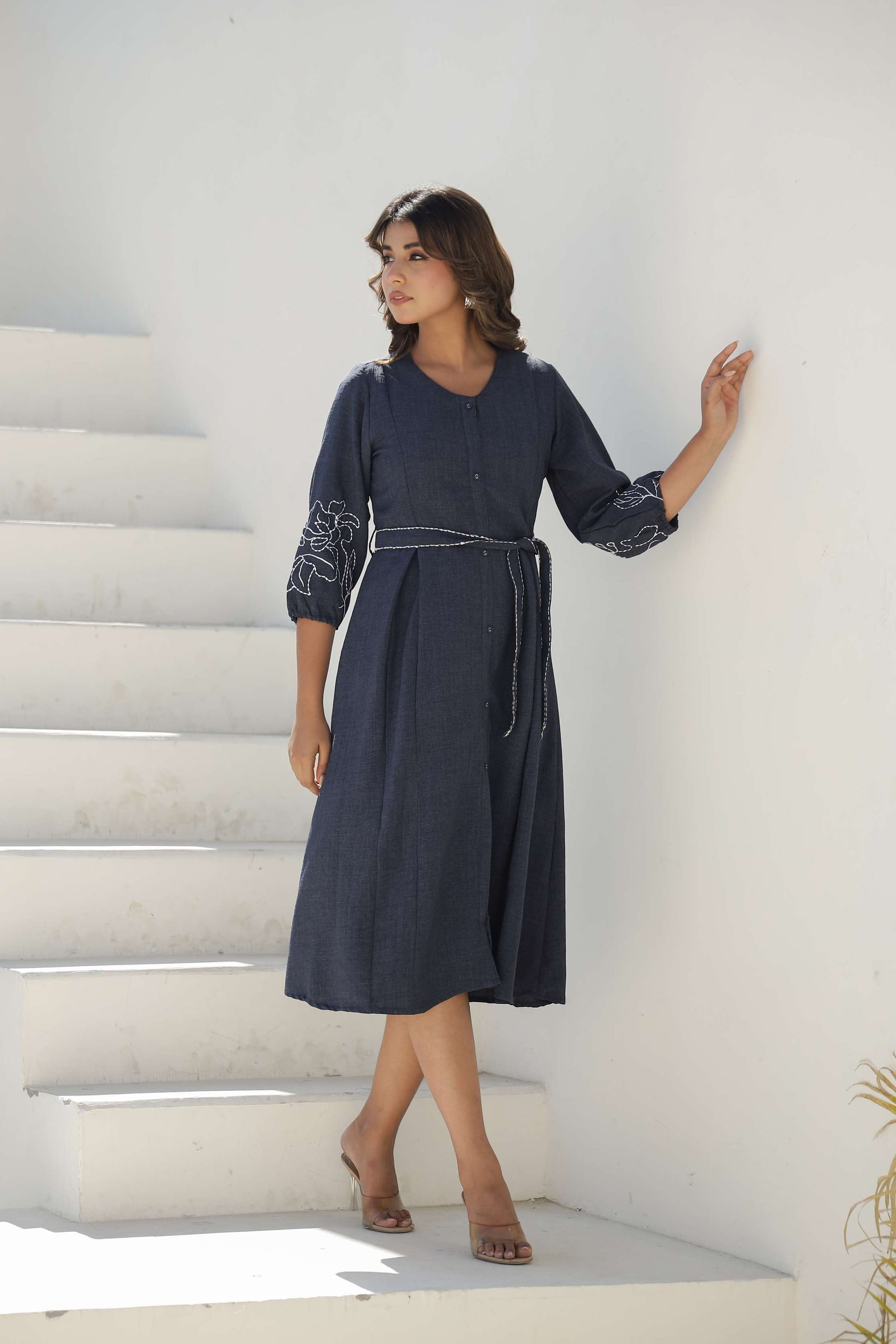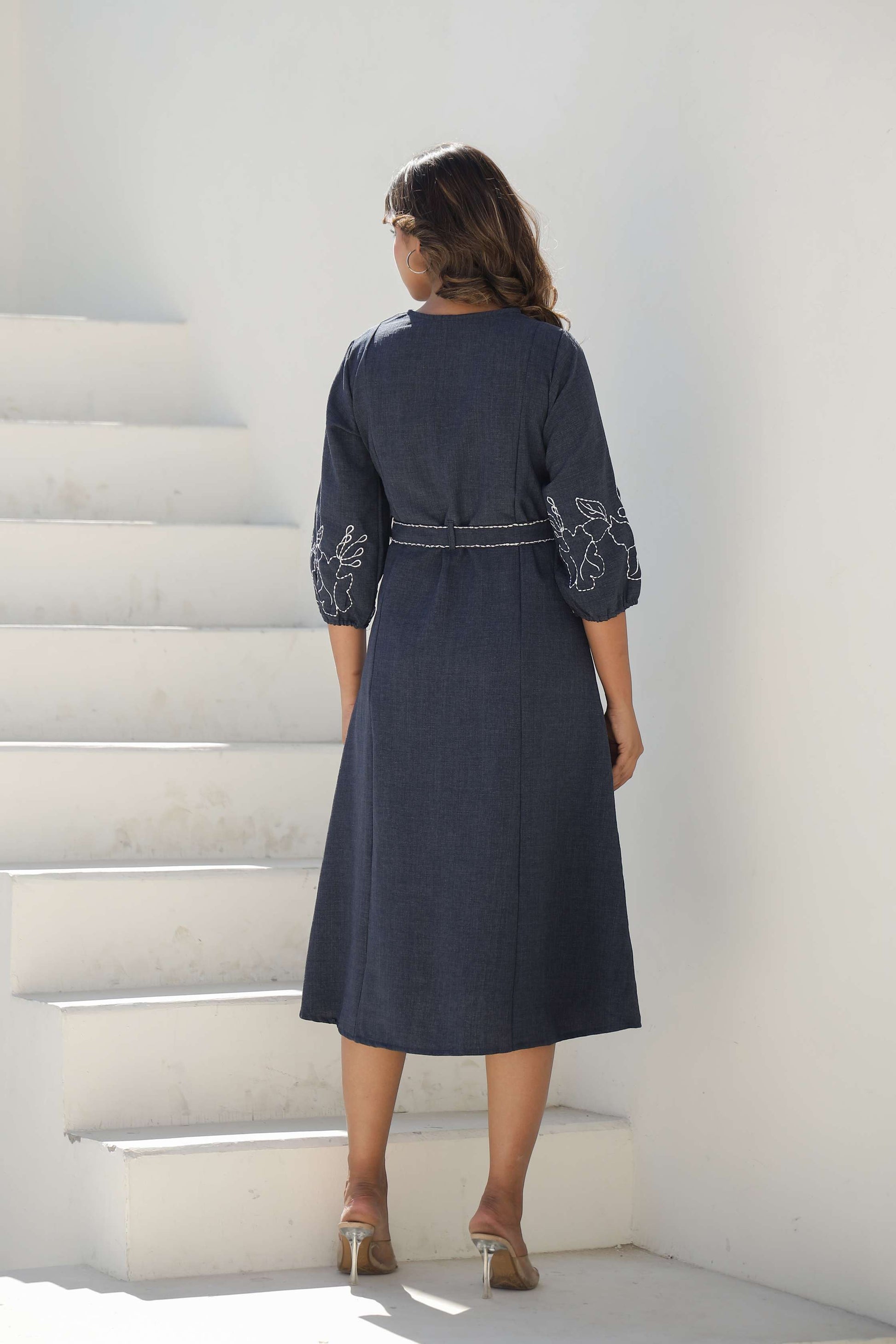Chic Denim Blue Embroidered Cotton Dress with Belt