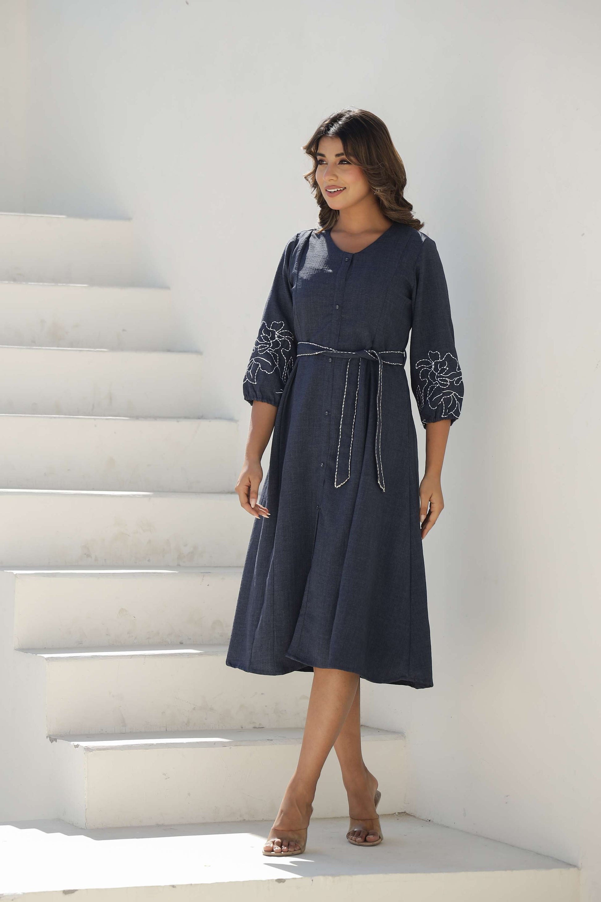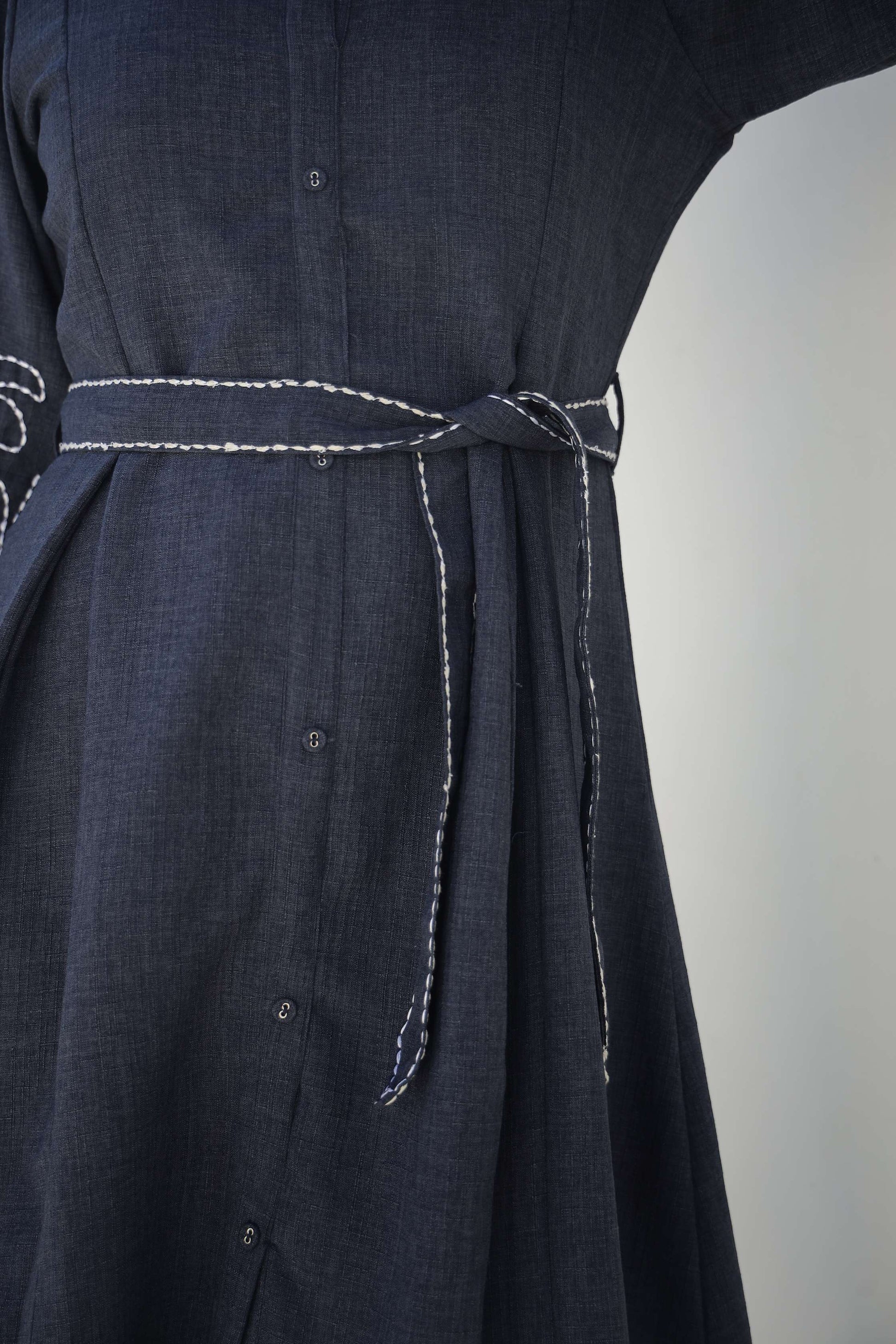 Work: Tonal floral thread embroidery on sleeves, fabric belt with edge detailing