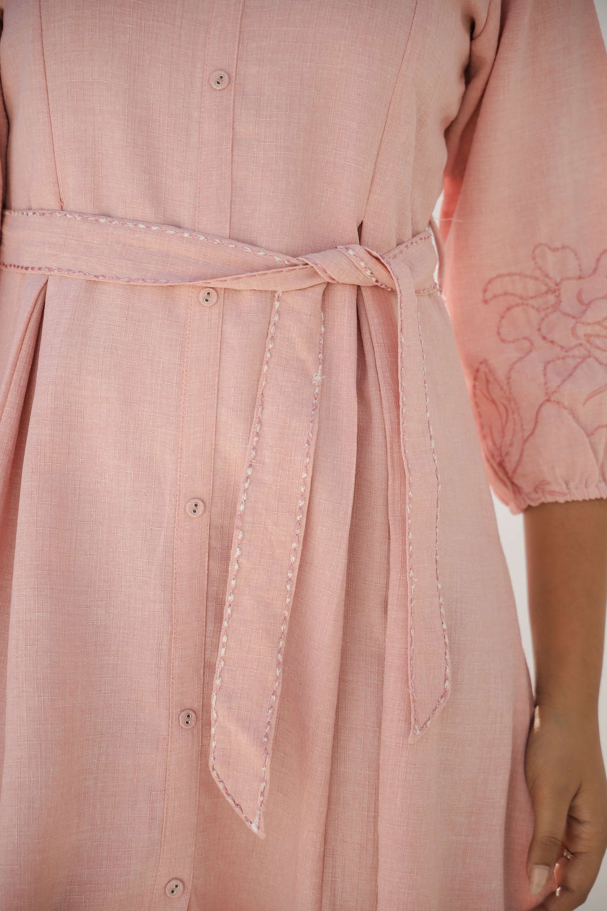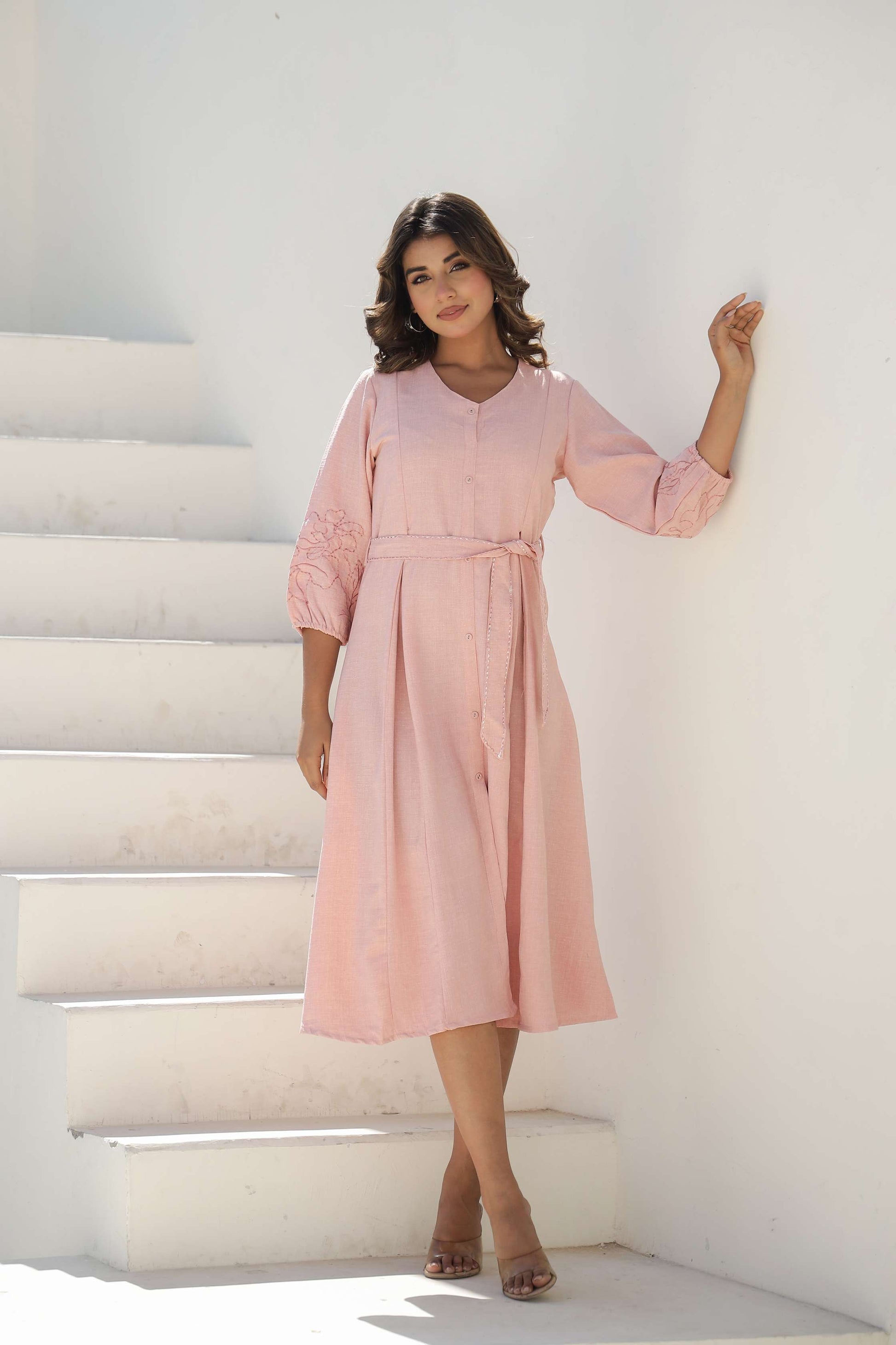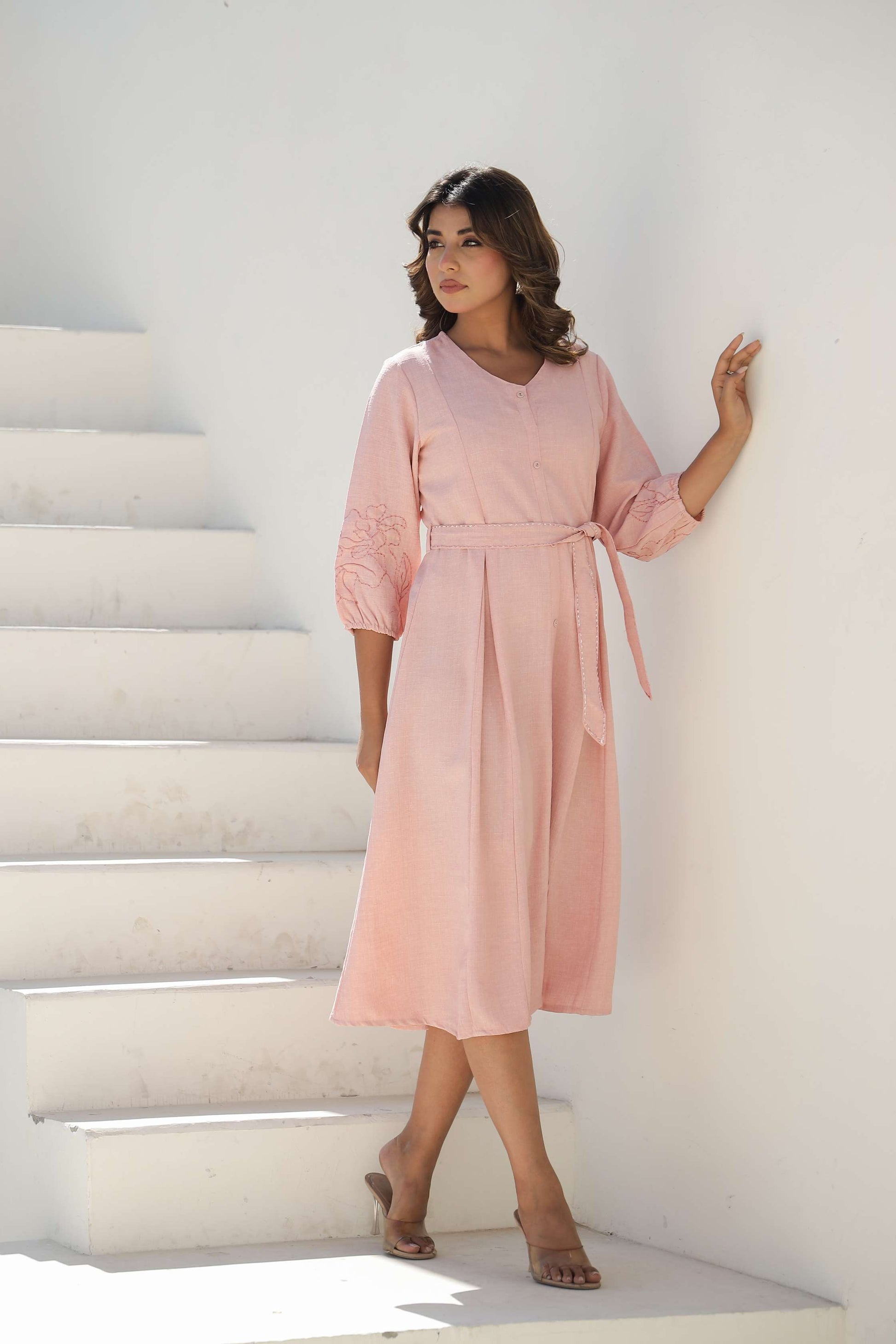 Soft Blush Pink Embroidered Cotton Midi Dress