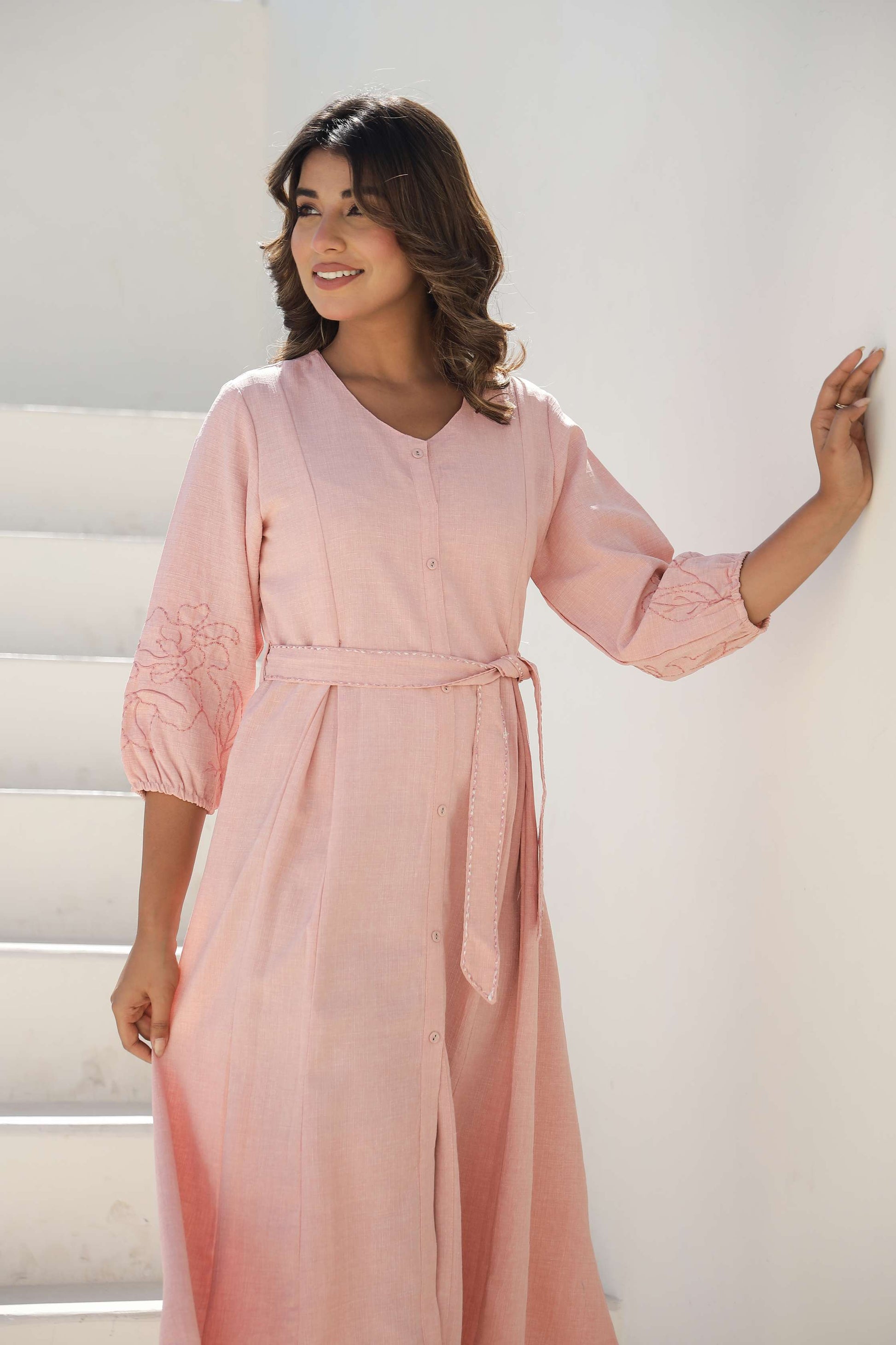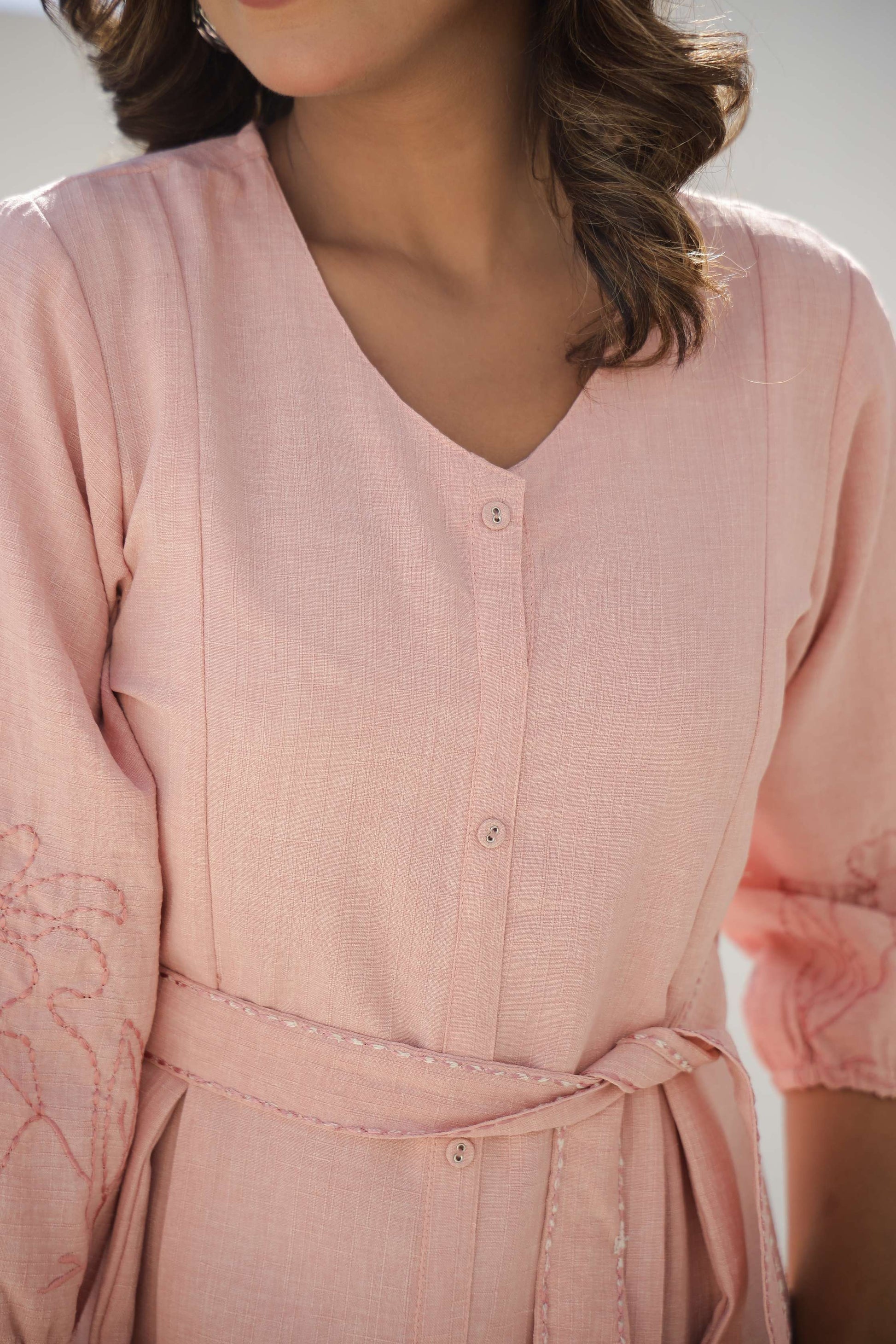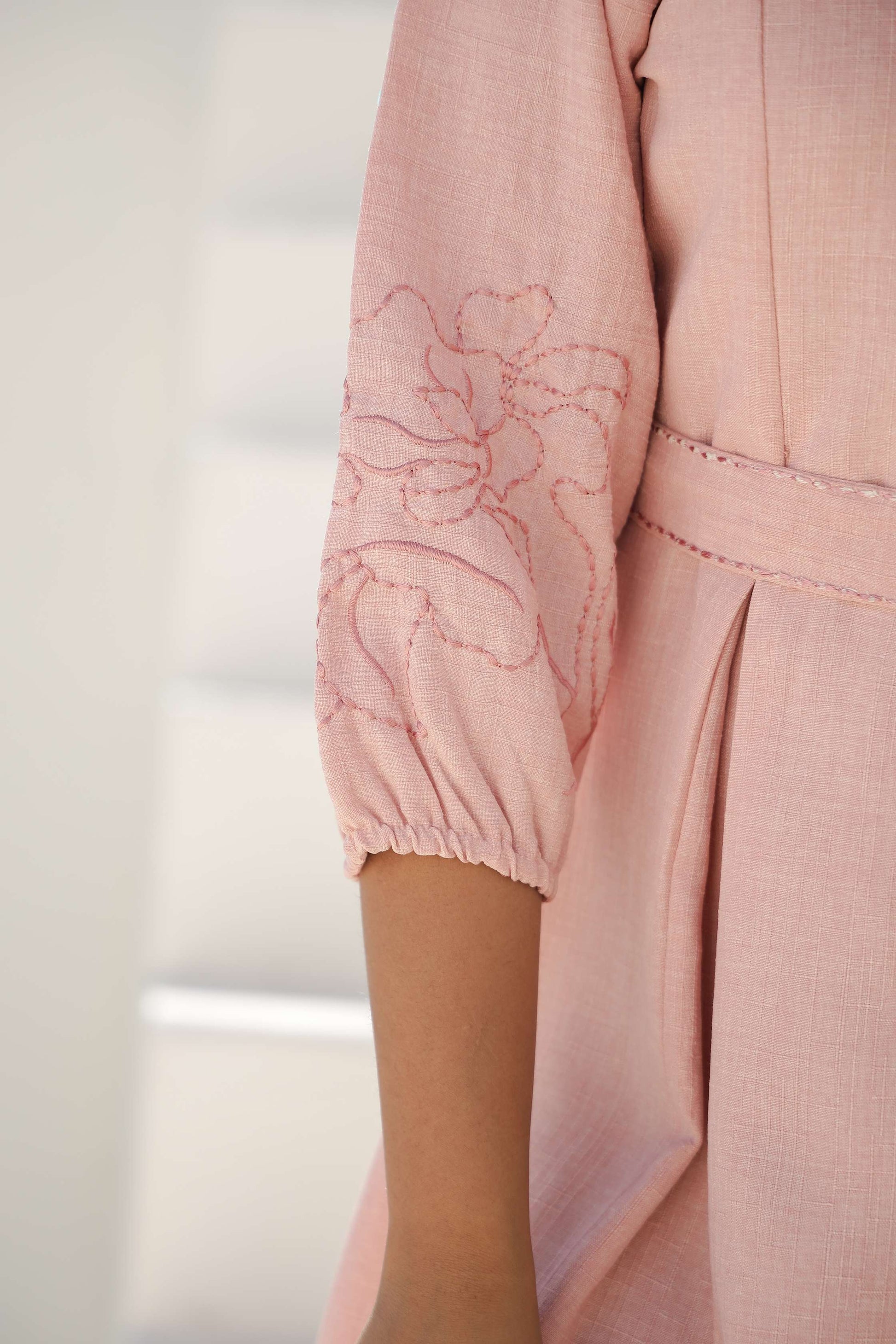 Soft Blush Pink Embroidered Cotton Midi Dress