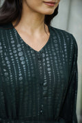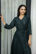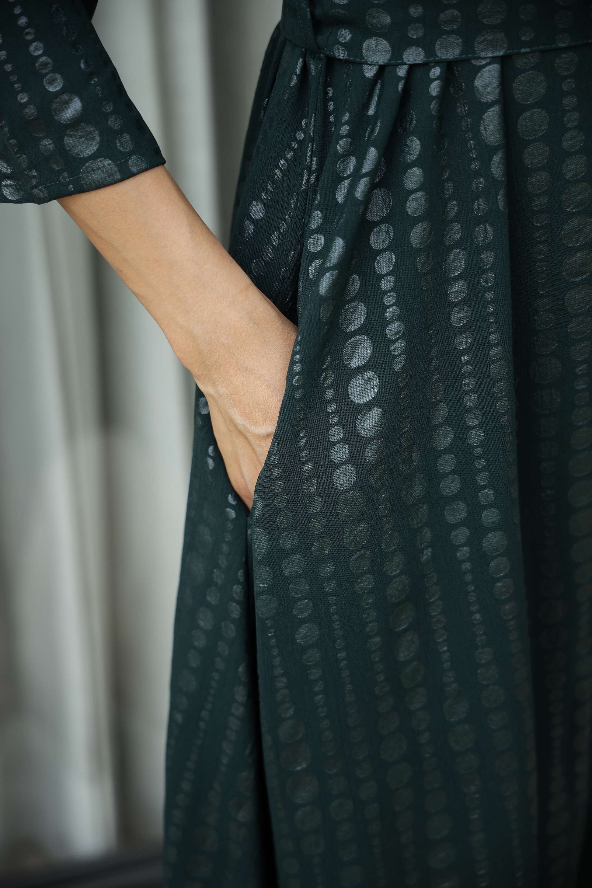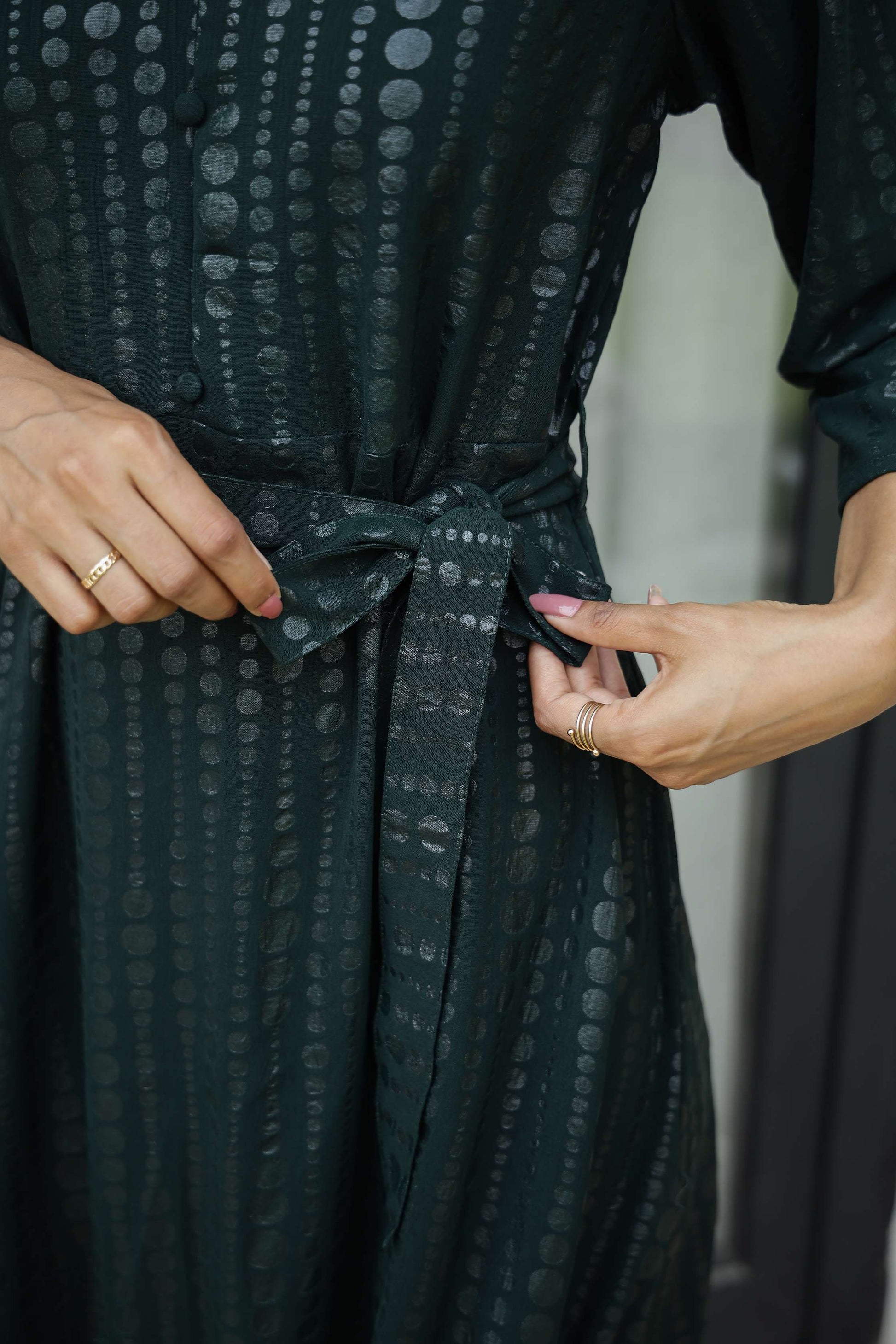 Make a graceful statement in our Bottle Green Midi Dress, featuring a soft dotted texture and a flattering A-line cut. The matching tie-up belt accentuates the waist while the front slit adds a modern edge to this elegant silhouette.
