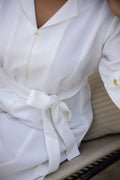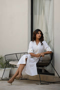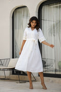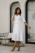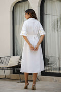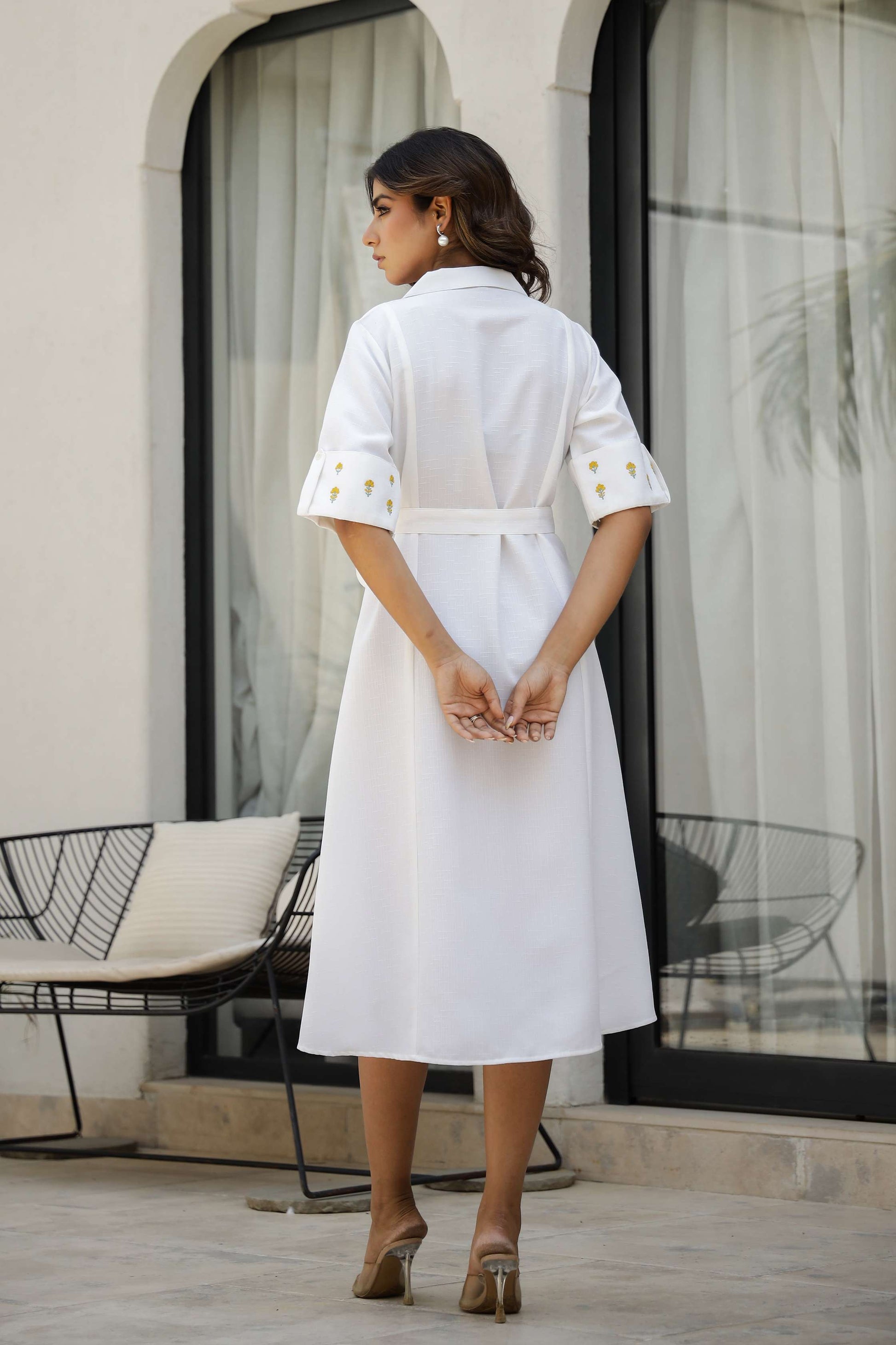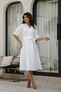 White Cotton Shirt Dress with Embroidered Sleeves and Tie-Up Belt