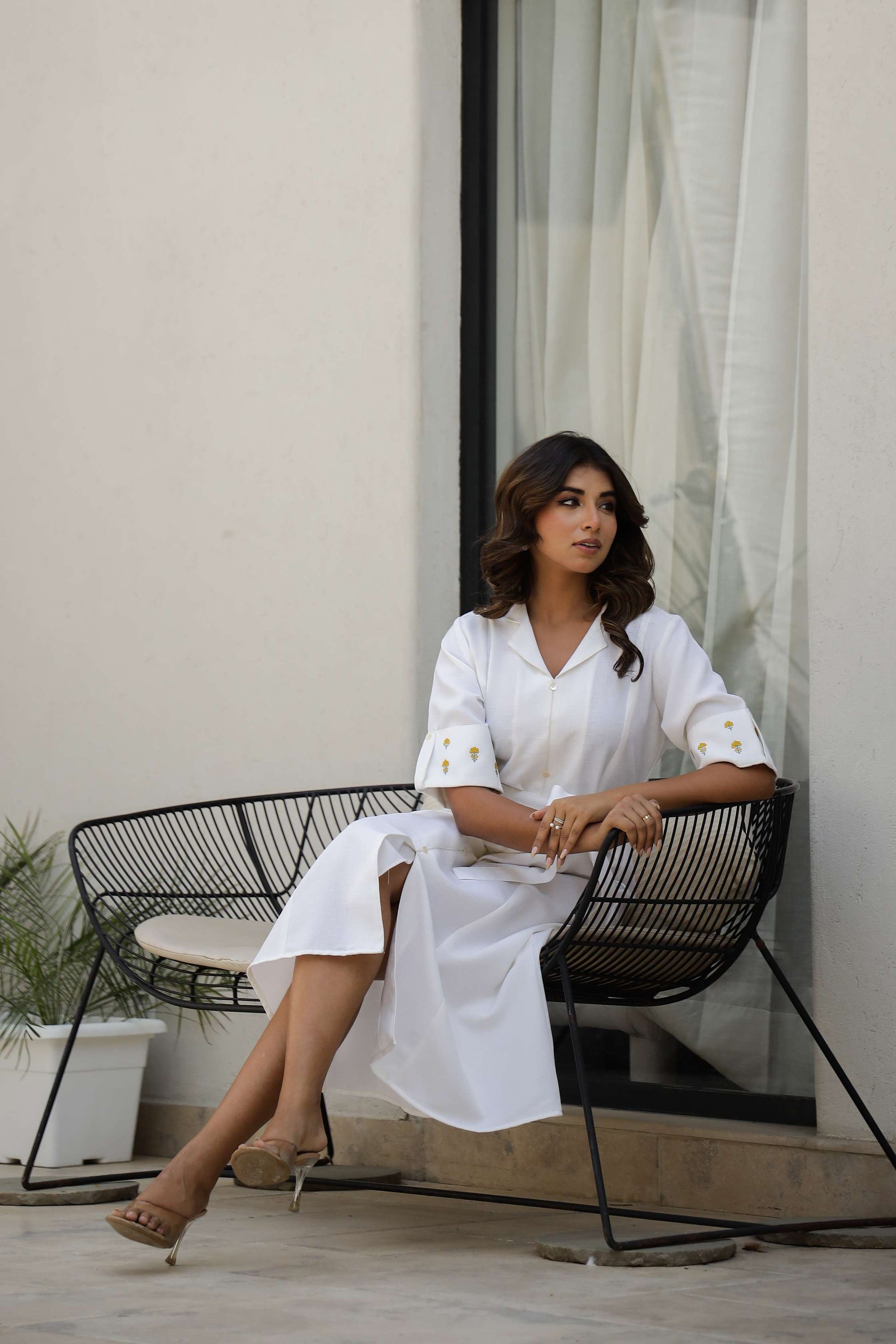 Channel classic elegance in this White Shirt Dress. Tailored from breathable cotton with delicate embroidery on the sleeves, a structured collar, and a belted waist — this outfit is ideal for vacations, workdays, or weekend styling.