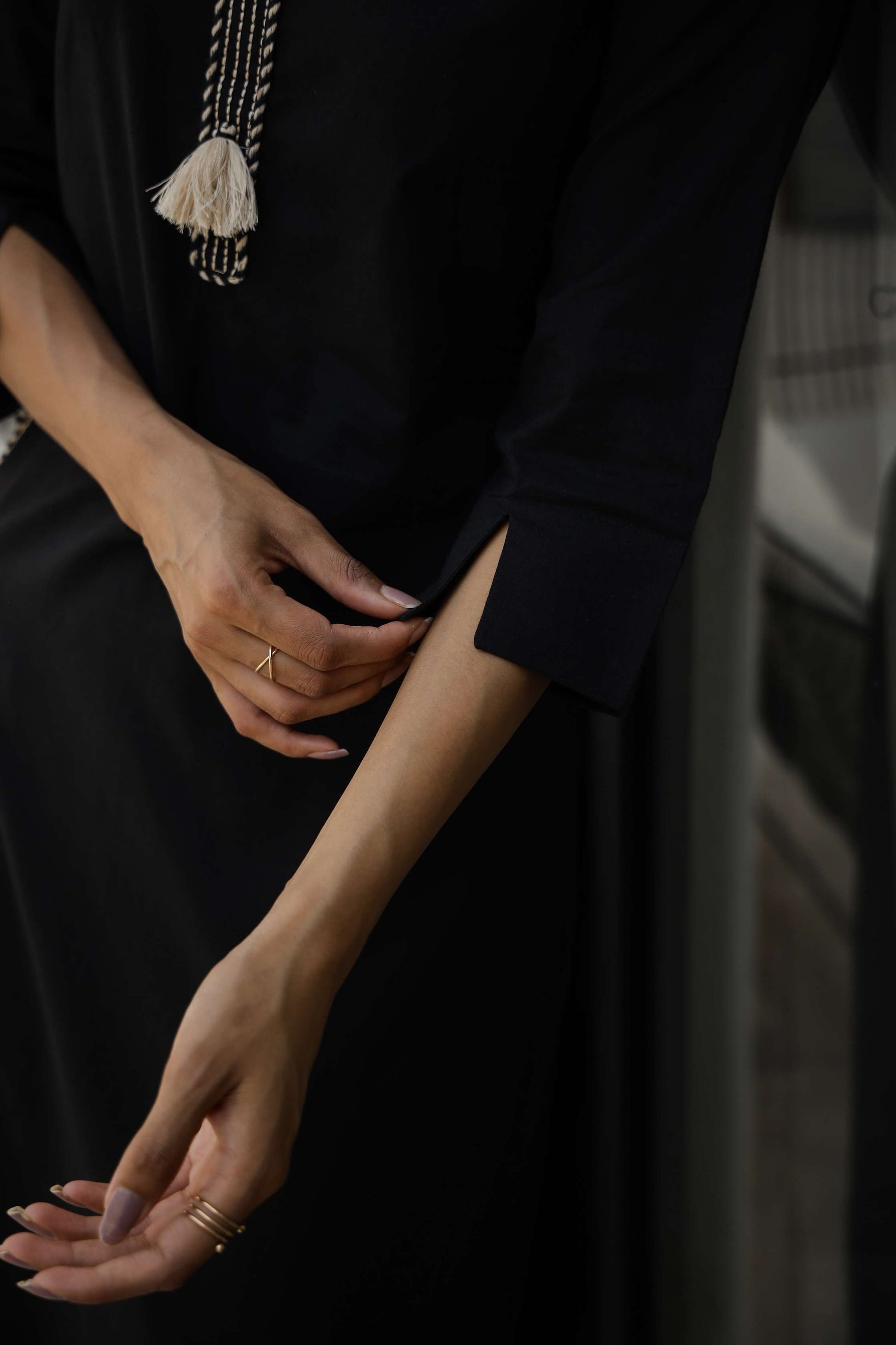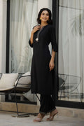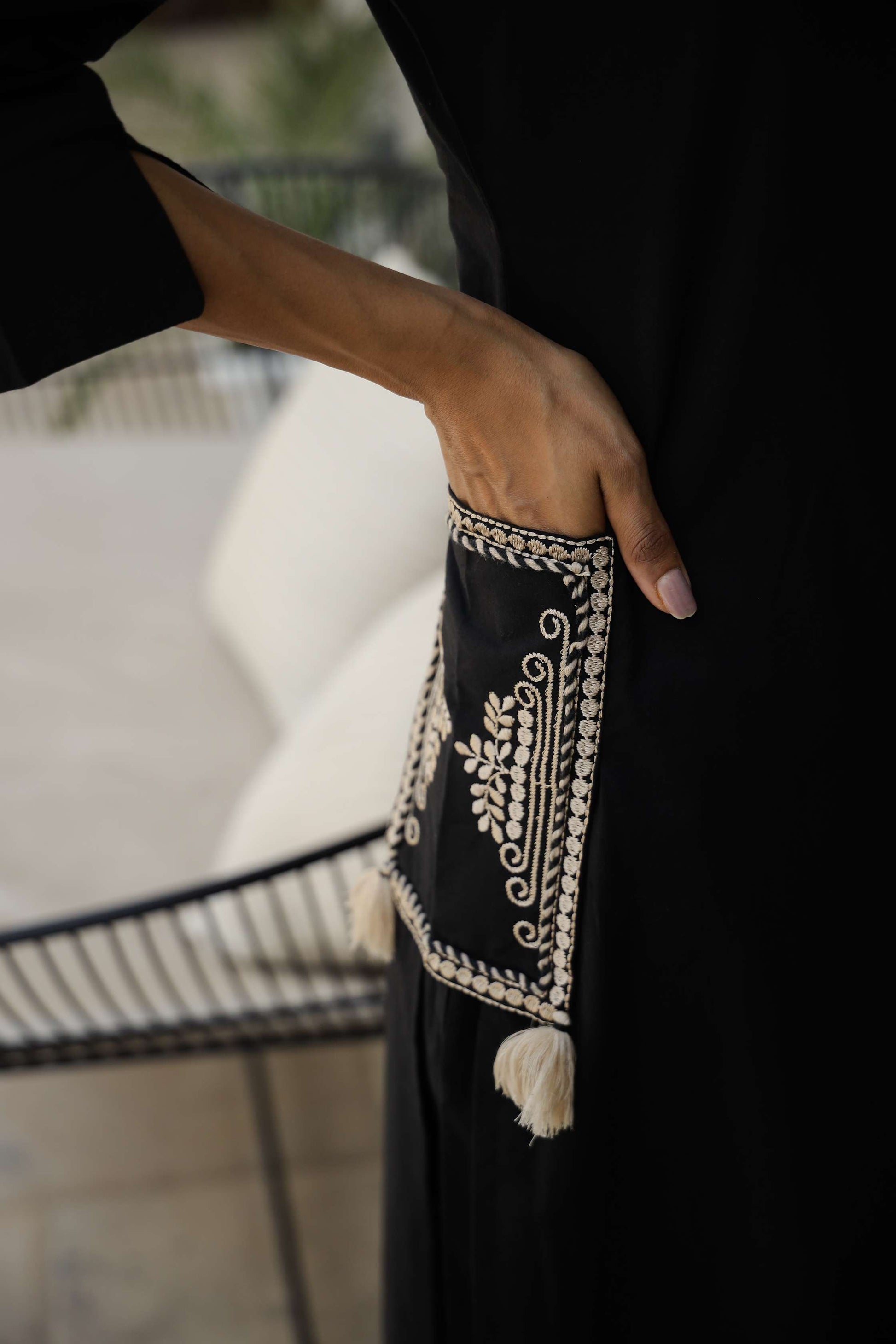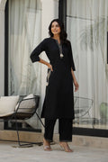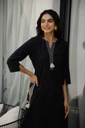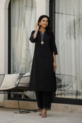 Black Solid Cotton Kurta Set with Embroidered Pocket
