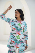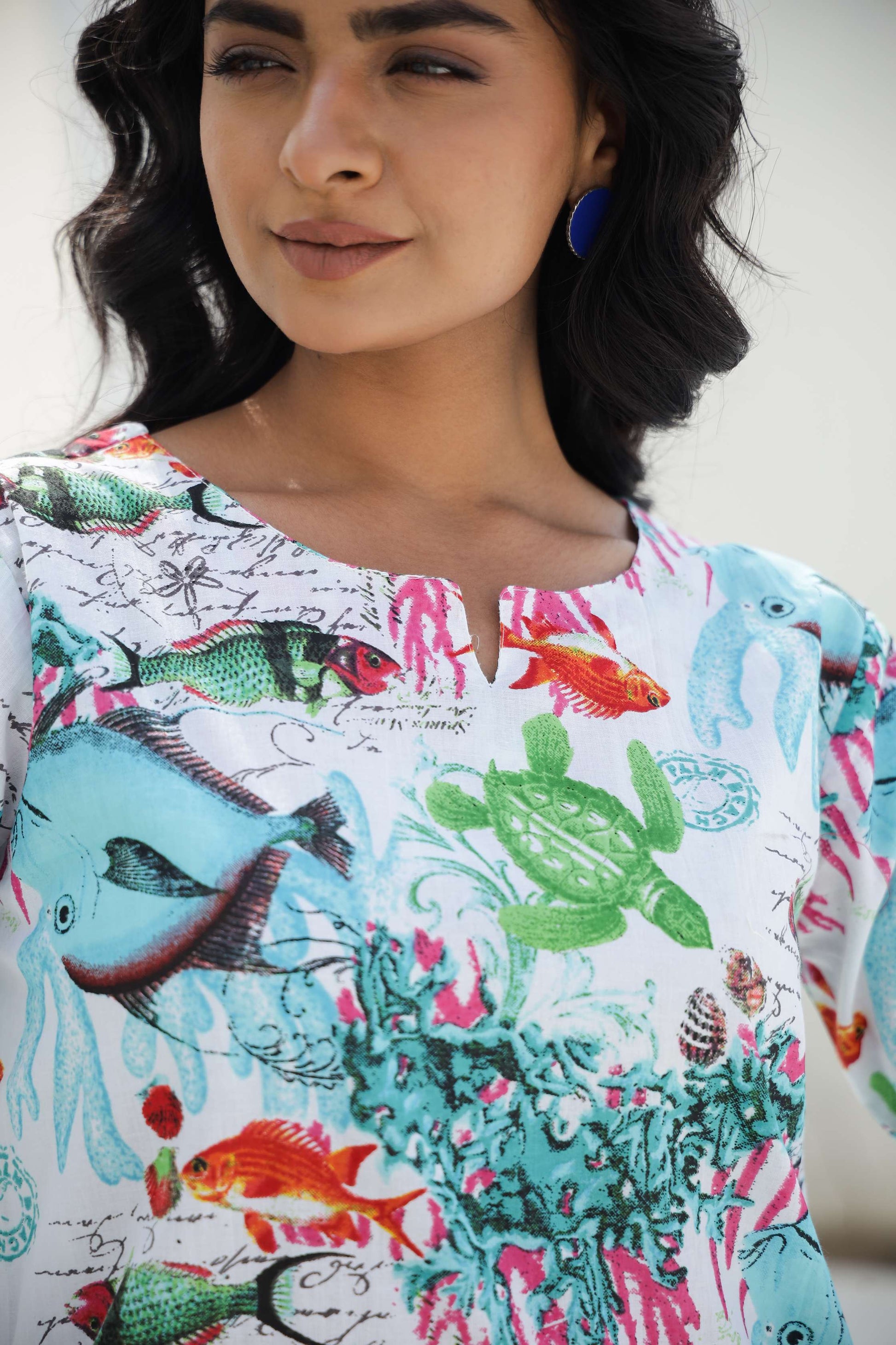 Dive into effortless style with the Aqua Marine Printed Cotton Cord Set, a breezy ensemble featuring a vivid underwater-inspired print. With playful motifs like sea creatures, coral reefs, and tropical plants on a crisp white base, this set brings a refreshing twist to your wardrobe.