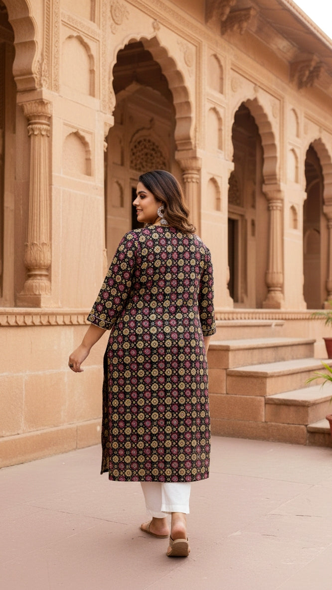 Make a striking statement with this unique Print Kurta. This piece is designed to be a standout addition to your wardrobe, effortlessly blending contemporary art with comfortable fashion.