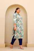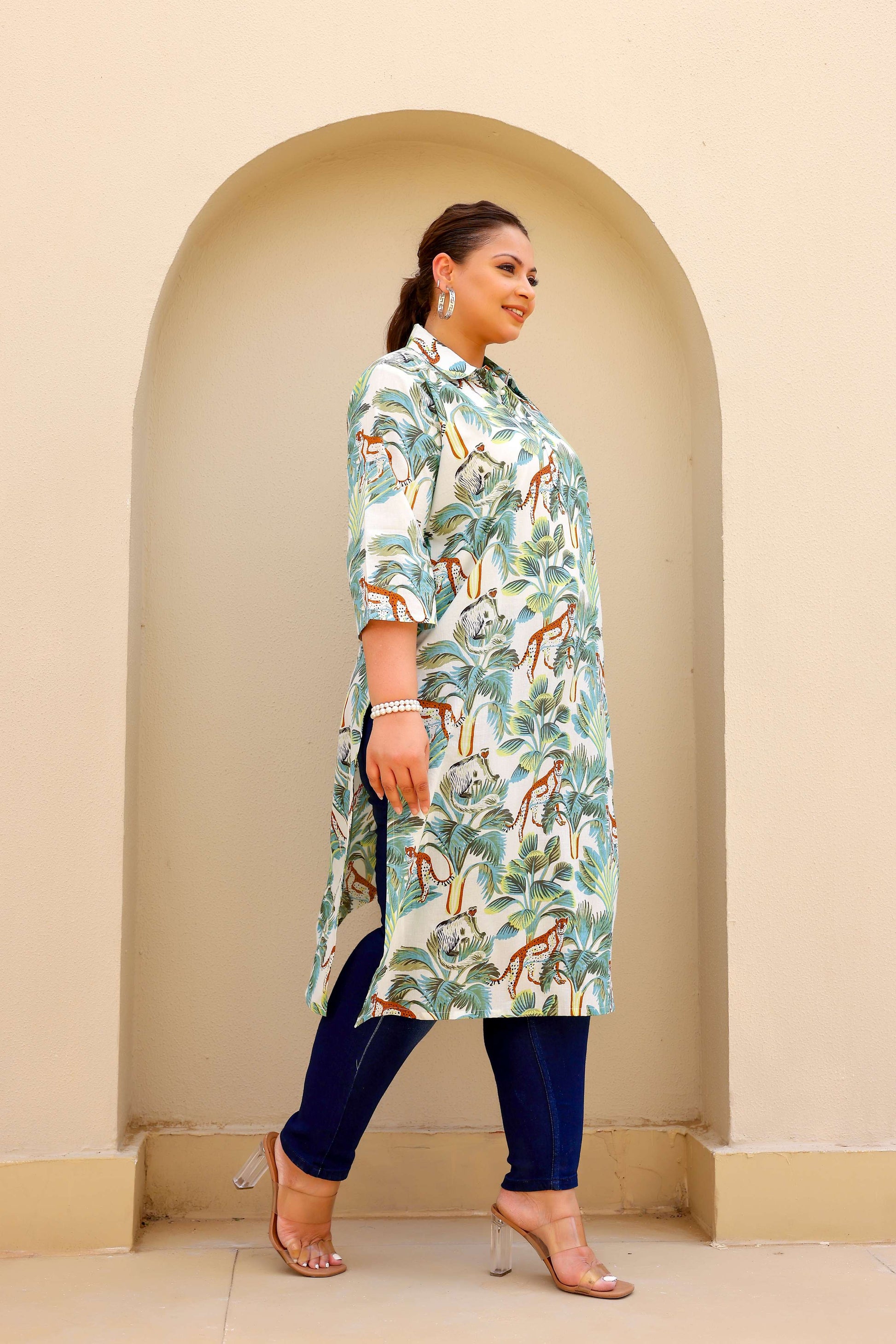 Step into the wild in style with this eye-catching kurti featuring a vivid jungle safari print, complete with giraffes and tropical foliage. This piece effortlessly combines nature-inspired aesthetics with a flattering fit for curvy figures.
