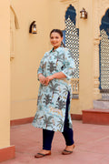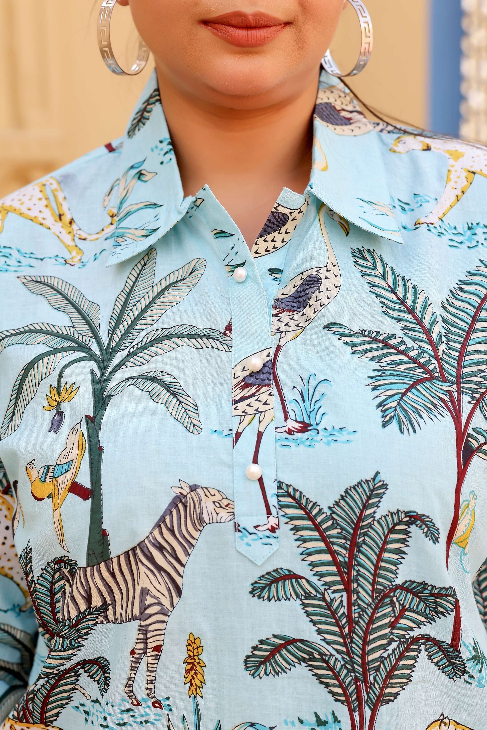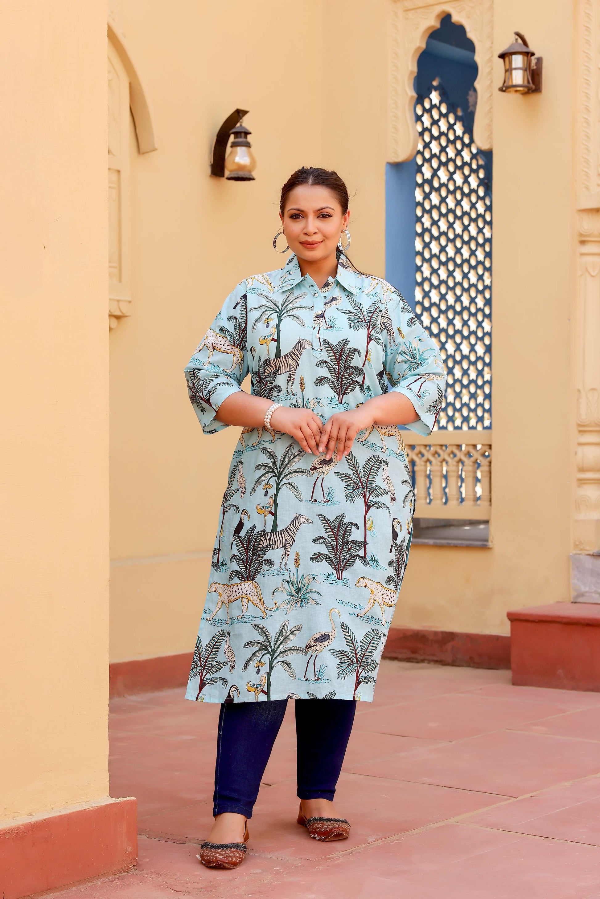 Make a bold yet elegant statement with this sky blue safari-themed kurti featuring playful prints of zebras, cheetahs, birds, and palm trees. Crafted from breathable cotton, this kurti is ideal for casual outings or festive daywear. Pair it with leggings, jeans, or palazzos for a complete ethnic fusion look.