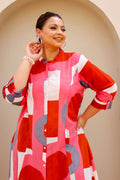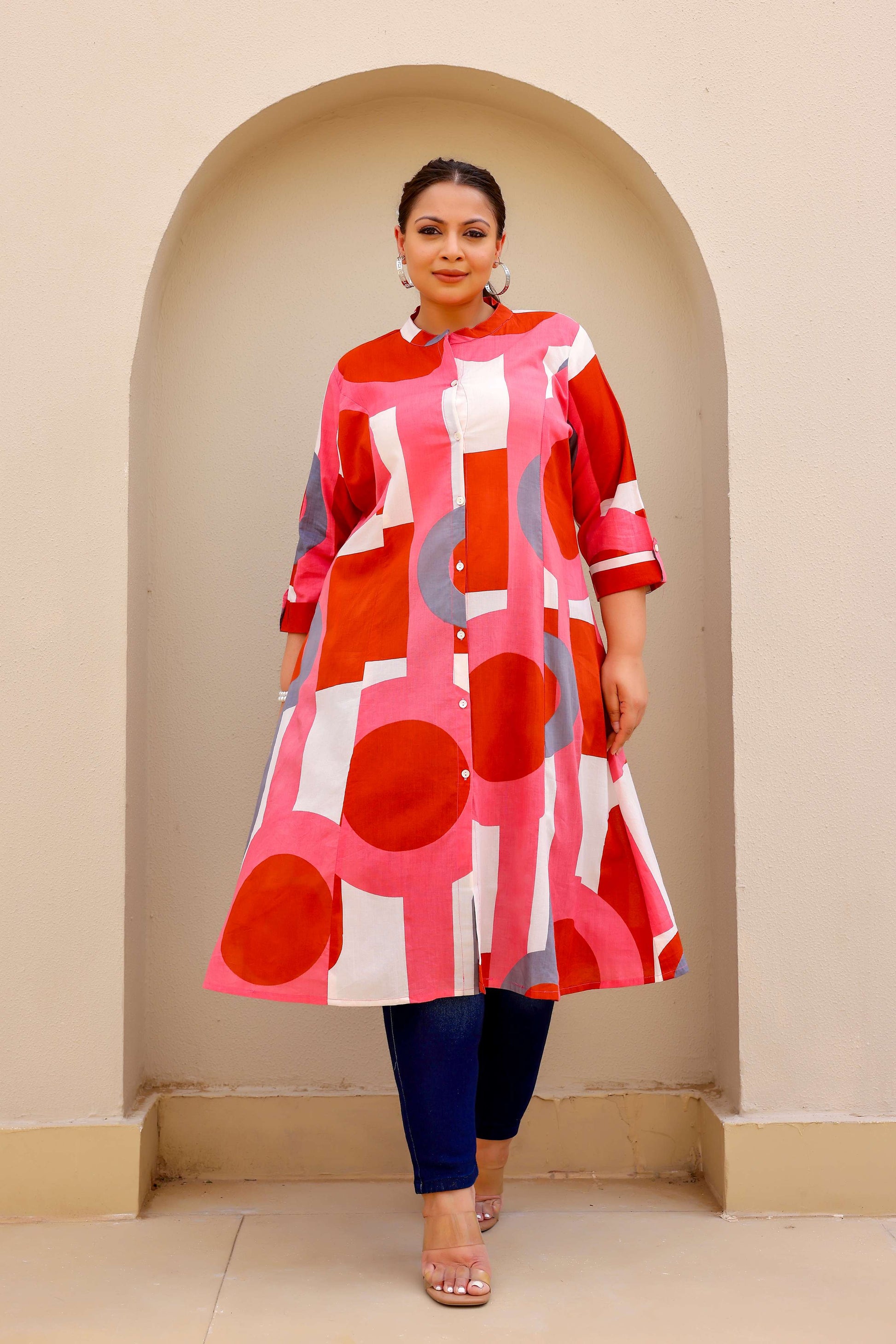Step into contemporary fashion with this striking A-line cotton kurti, featuring a bold geometric pattern in shades of red, pink, grey, and white. Its flowy silhouette and button-down design offer a modern yet comfortable fit, making it ideal for casual brunches or stylish everyday wear.
