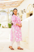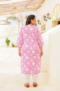 Add a pop of freshness to your wardrobe with this pink plus-size kurti featuring charming white floral motifs. Made from pure cotton, it’s breathable and super comfy for daily wear. The round neckline with delicate button accents and 3/4th sleeves give it a graceful ethnic touch. Pair it with white leggings and you're ready to shine in style and comfort.