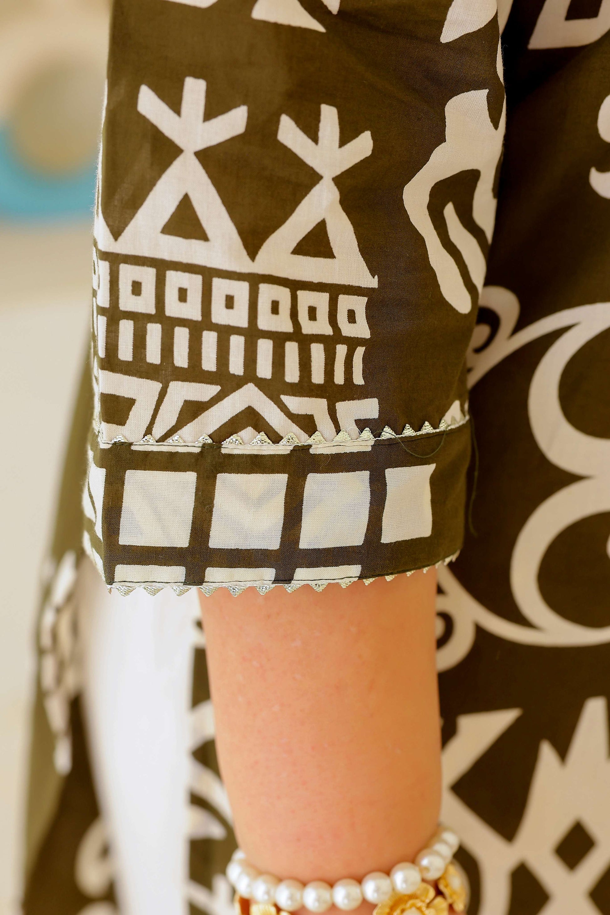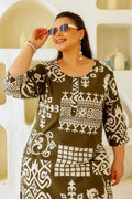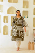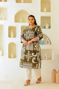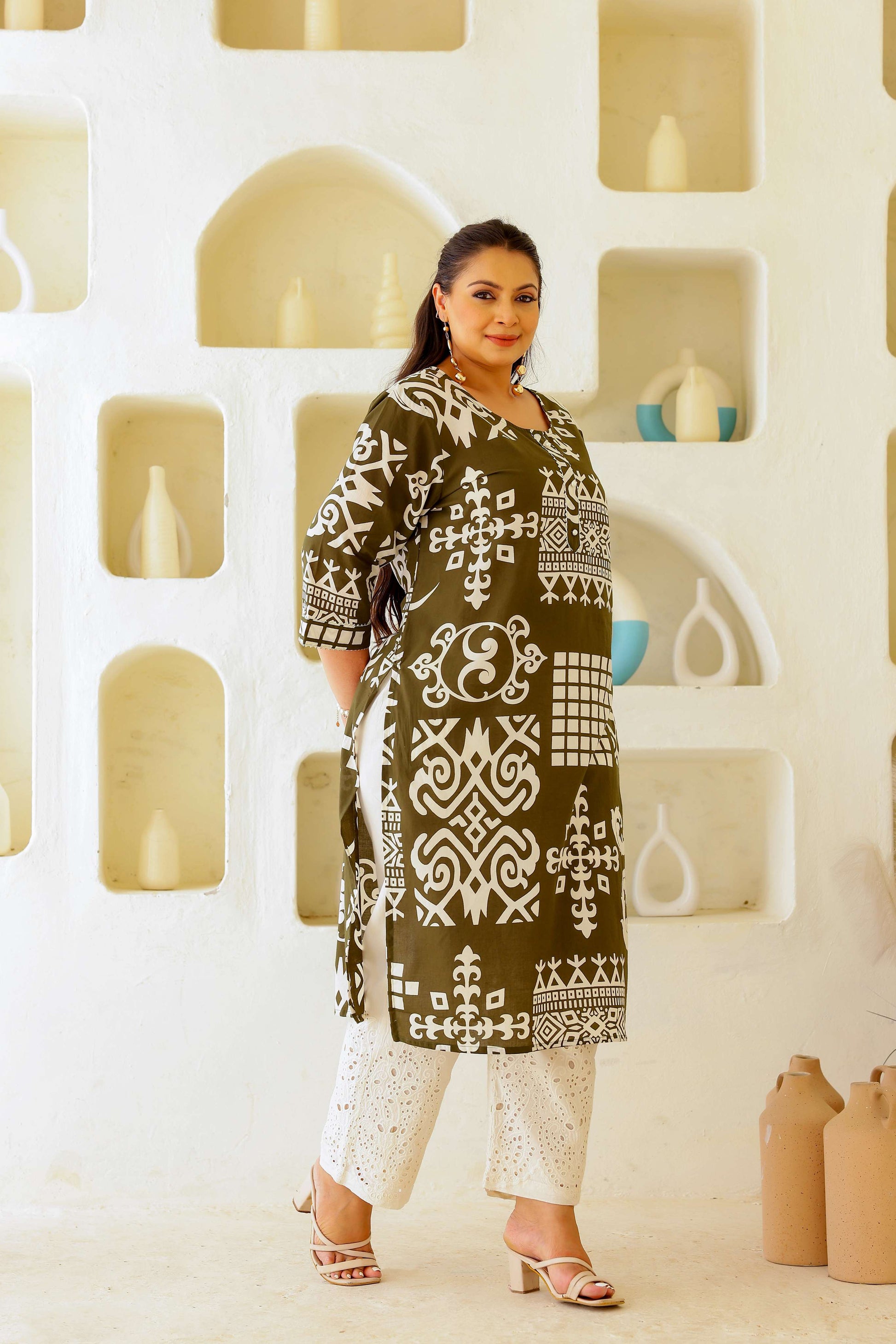 Elevate your ethnic wardrobe with this plus size olive green kurti featuring bold white geometric motifs. Designed to flatter curvy silhouettes, this kurti brings together structure and comfort effortlessly. Crafted from soft cotton, it features a round neckline, 3/4th sleeves, and front button accents. A modern yet ethnic vibe makes it a standout choice for everyday wear or relaxed get-togethers.