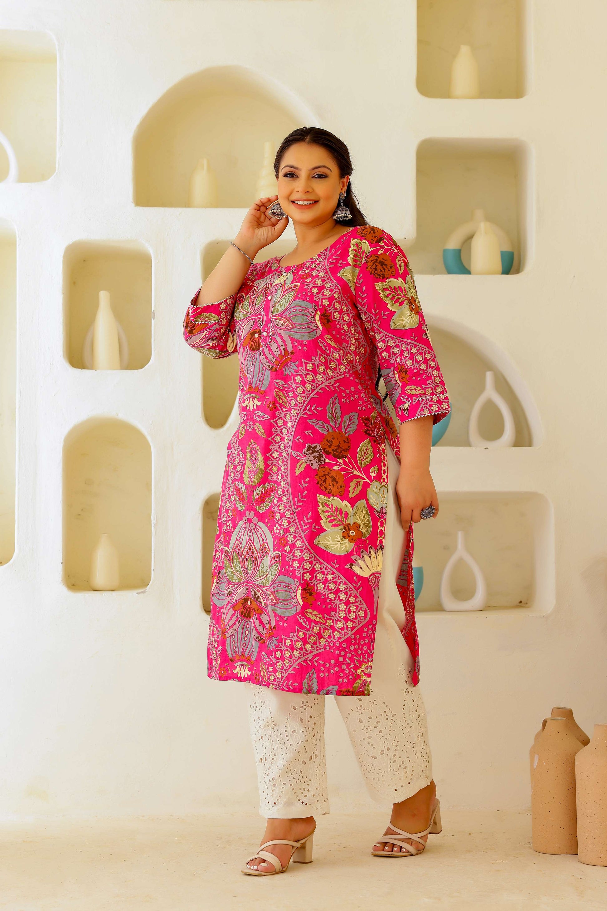 Brighten up your ethnic collection with this plus size pink kurti adorned with a striking mix of floral and paisley patterns. The vibrant pink base is perfectly complemented by multicolored artistic prints, making it ideal for festive occasions or daytime events. Designed with a round neck, 3/4th sleeves, and flattering straight cut, this kurti ensures both comfort and style.