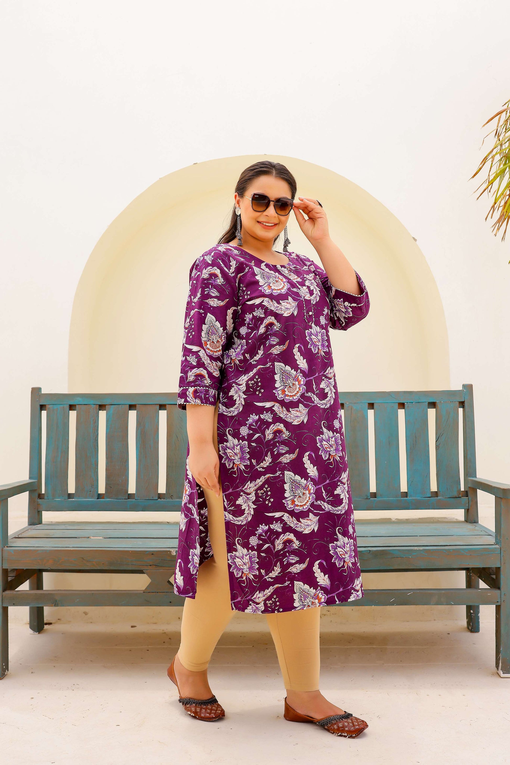 Infuse your look with a pop of regal color with this lavender floral kurti made for plus-size women. With a flattering A-line shape and charming print, itβs both stylish and easy to wear. The cotton fabric keeps you cool and comfy all day, making it perfect for office, home, or outings.
