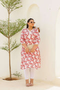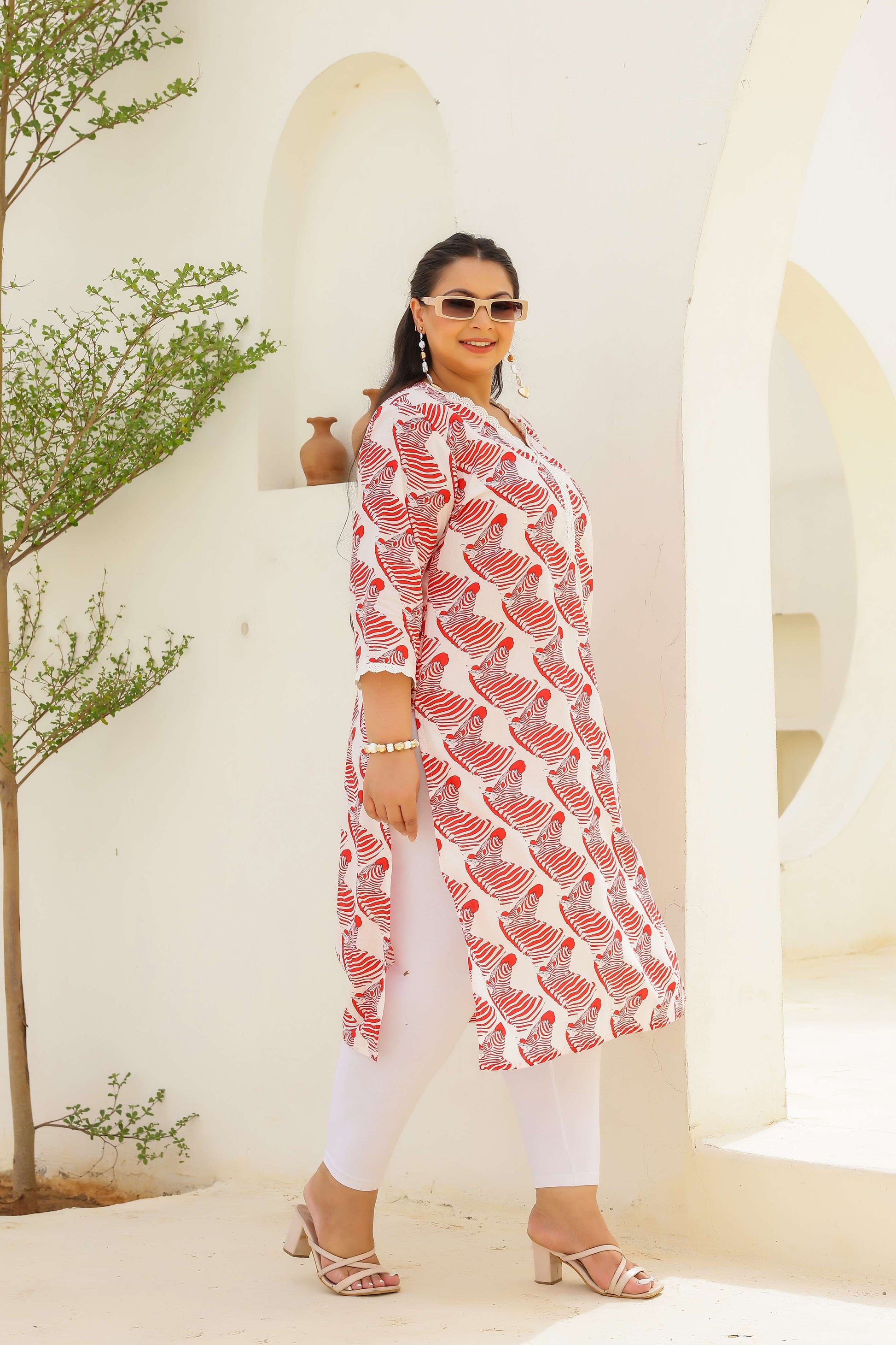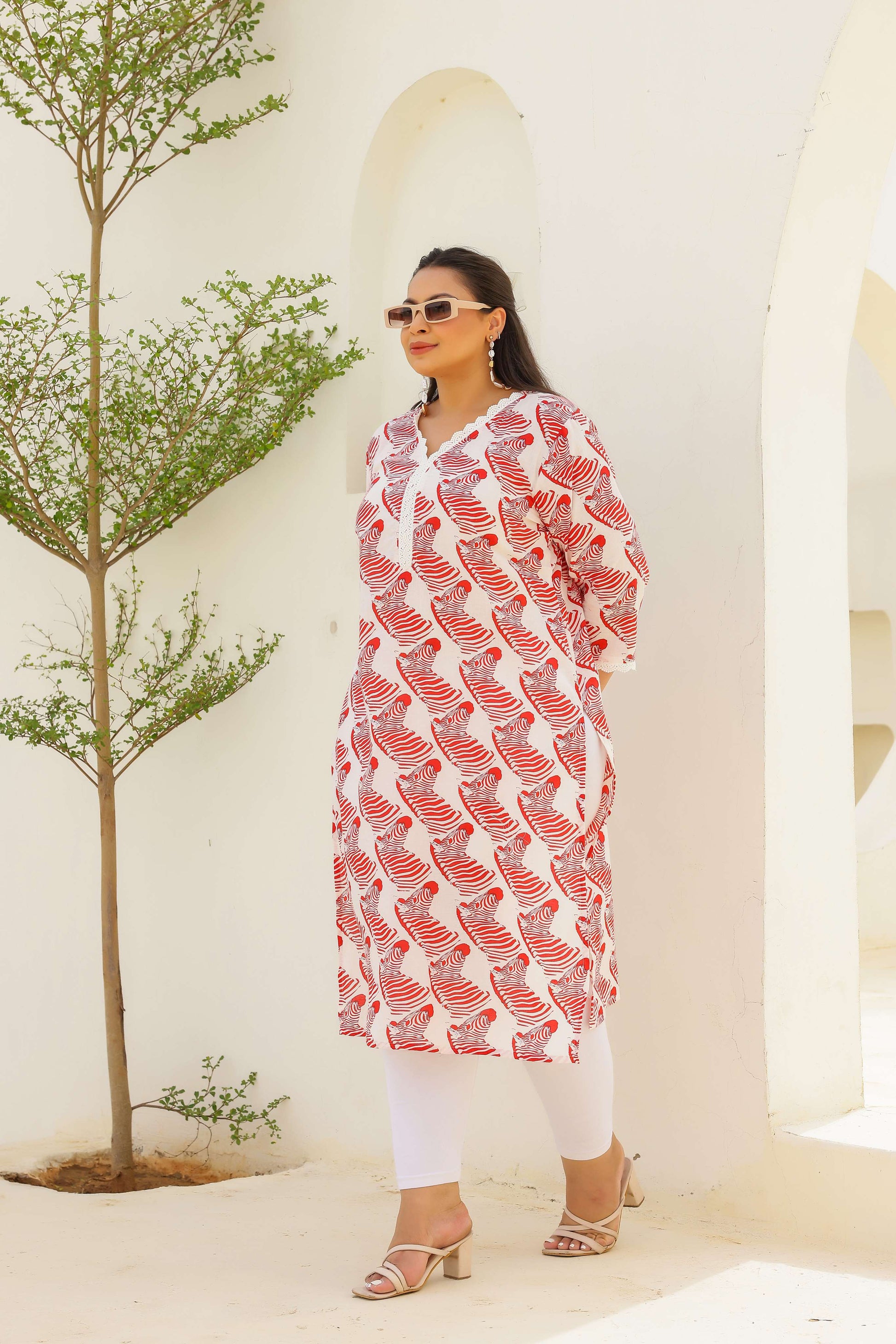 Make a bold and breezy statement in this vibrant red abstract printed kurti, crafted in soft, breathable cotton for all-day comfort. Tailored for plus-size women, it combines a flattering relaxed silhouette with playful prints to elevate your everyday style.