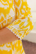 Bring sunshine to your wardrobe with this eye-catching yellow ikat printed kurta. Crafted in a relaxed silhouette with 3/4th sleeves and soft gathers under the yoke, this piece is both flattering and functional. Pair it with white leggings or pants for a chic ethnic look perfect for casual outings, office wear, or festive gatherings.