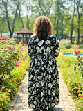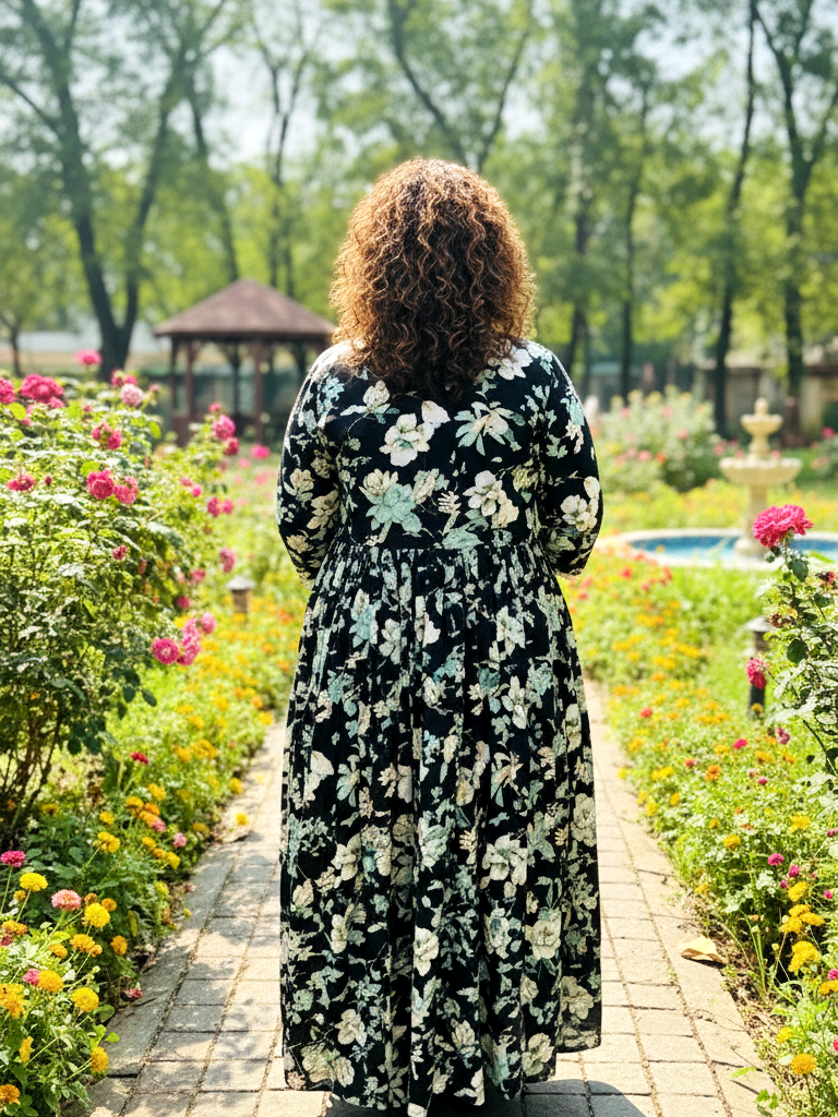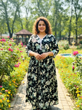 A perfect mix of modern style and traditional comfort, this Floral Print Maxi Dress features a flattering gathered waistline and a comfortable flow. The bold, large-scale floral motif print is striking, and the V-neckline is accented with delicate lace or crochet trim on the neck and sleeves. Available in sophisticated shades like Classic Black and cheerful Bright Pink, this is your go-to dress for garden parties, brunches, or a stylish holiday look.