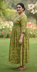 Green Cotton Comfort Plus-Size Gathered Ethnic Dress