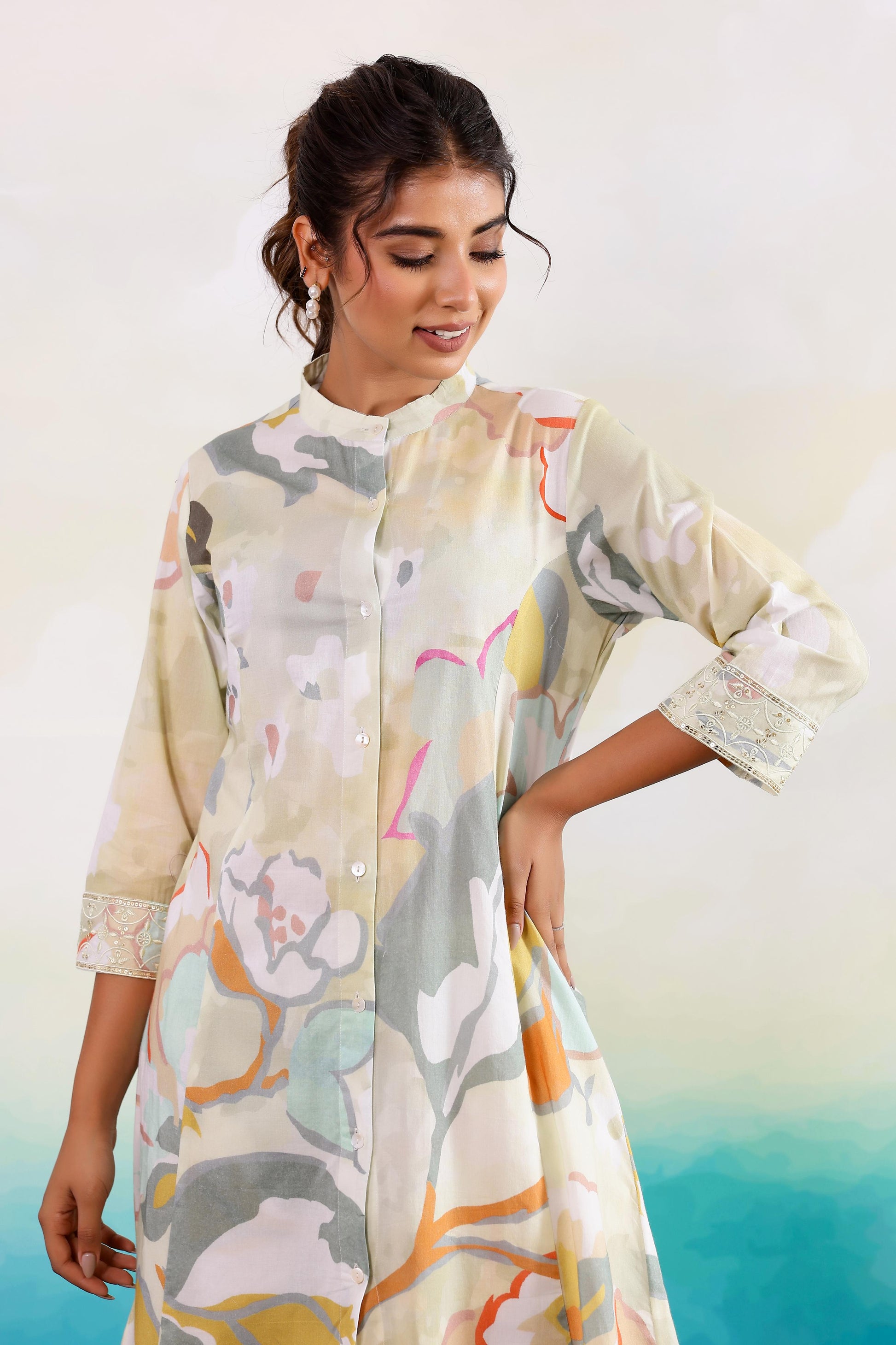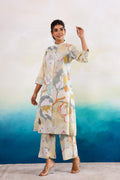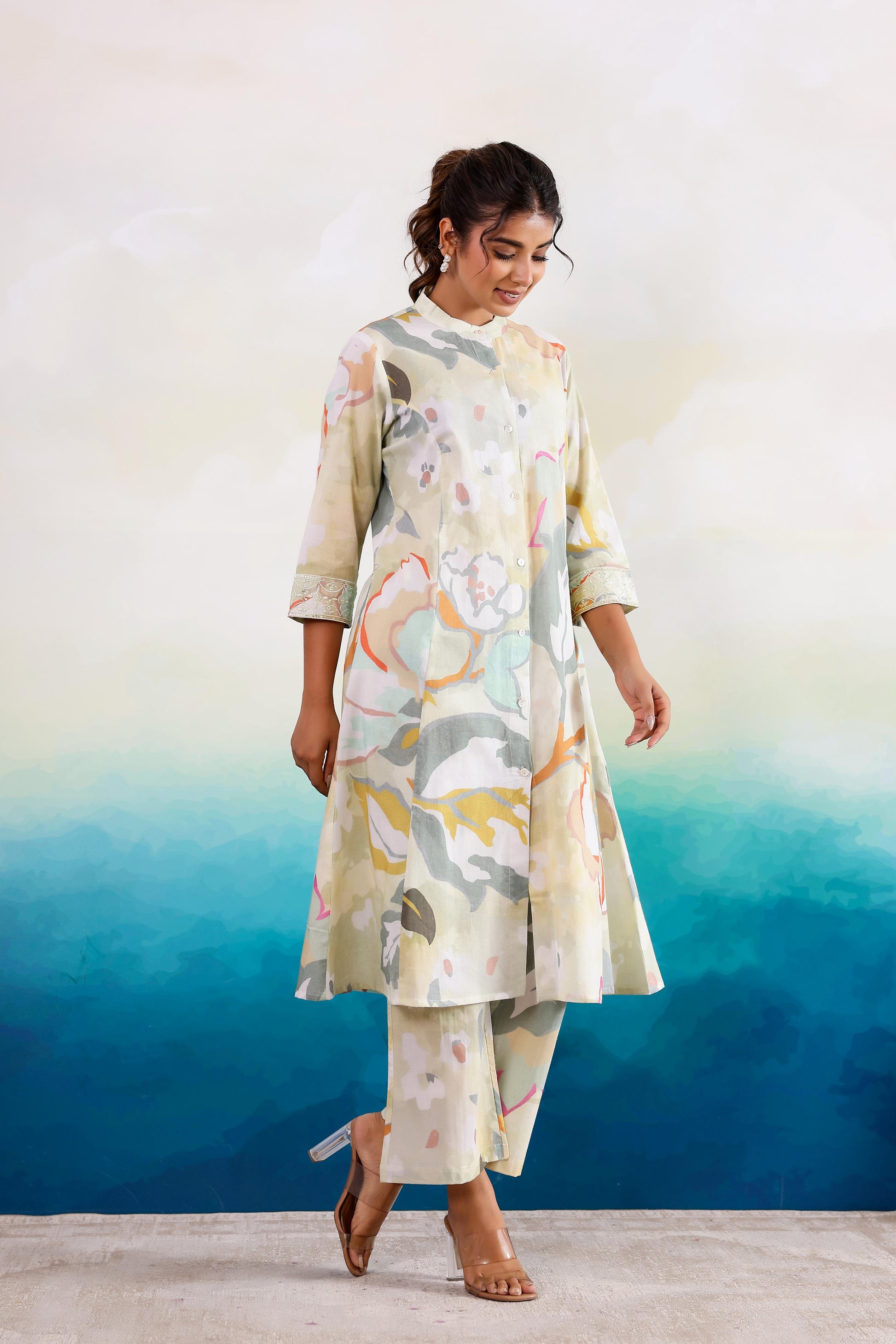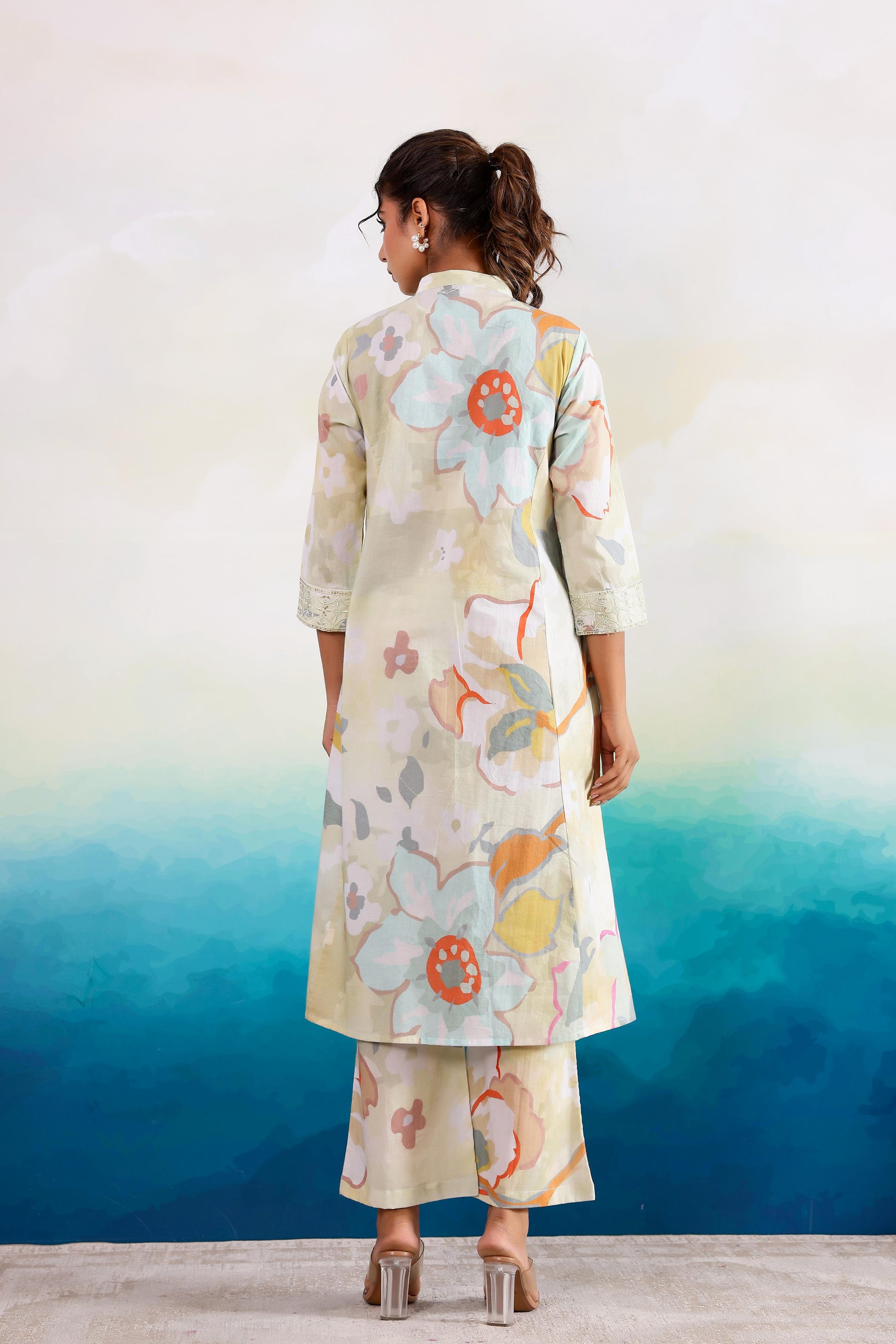 Add a refreshing charm to your wardrobe with this soft sage floral kurta set. Featuring a straight-fit kurta with subtle multicolor blooms and matching wide-leg pants, it’s perfect for summer brunches or elegant day wear. Designed in breathable cotton for all-day ease.