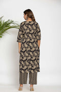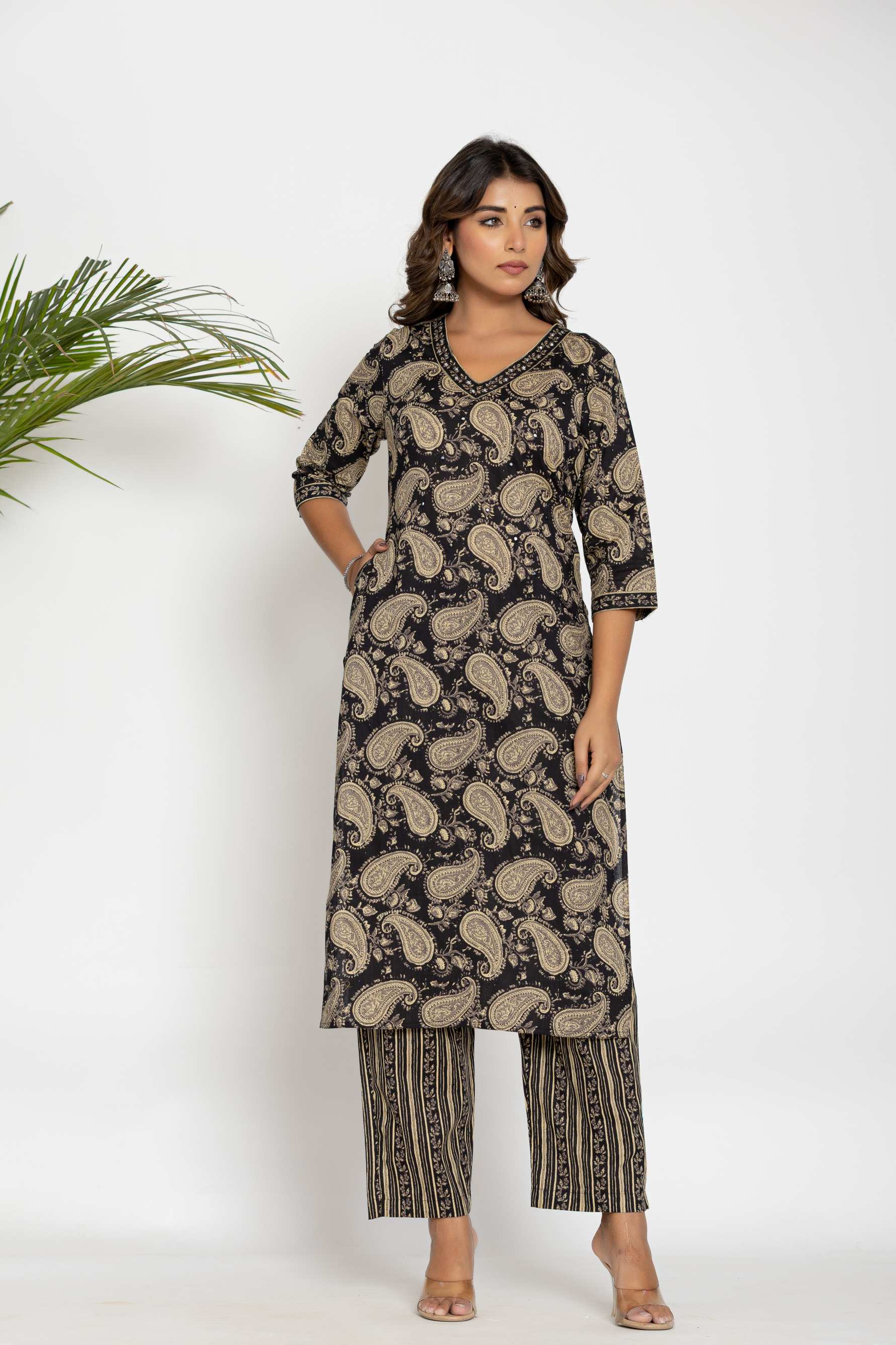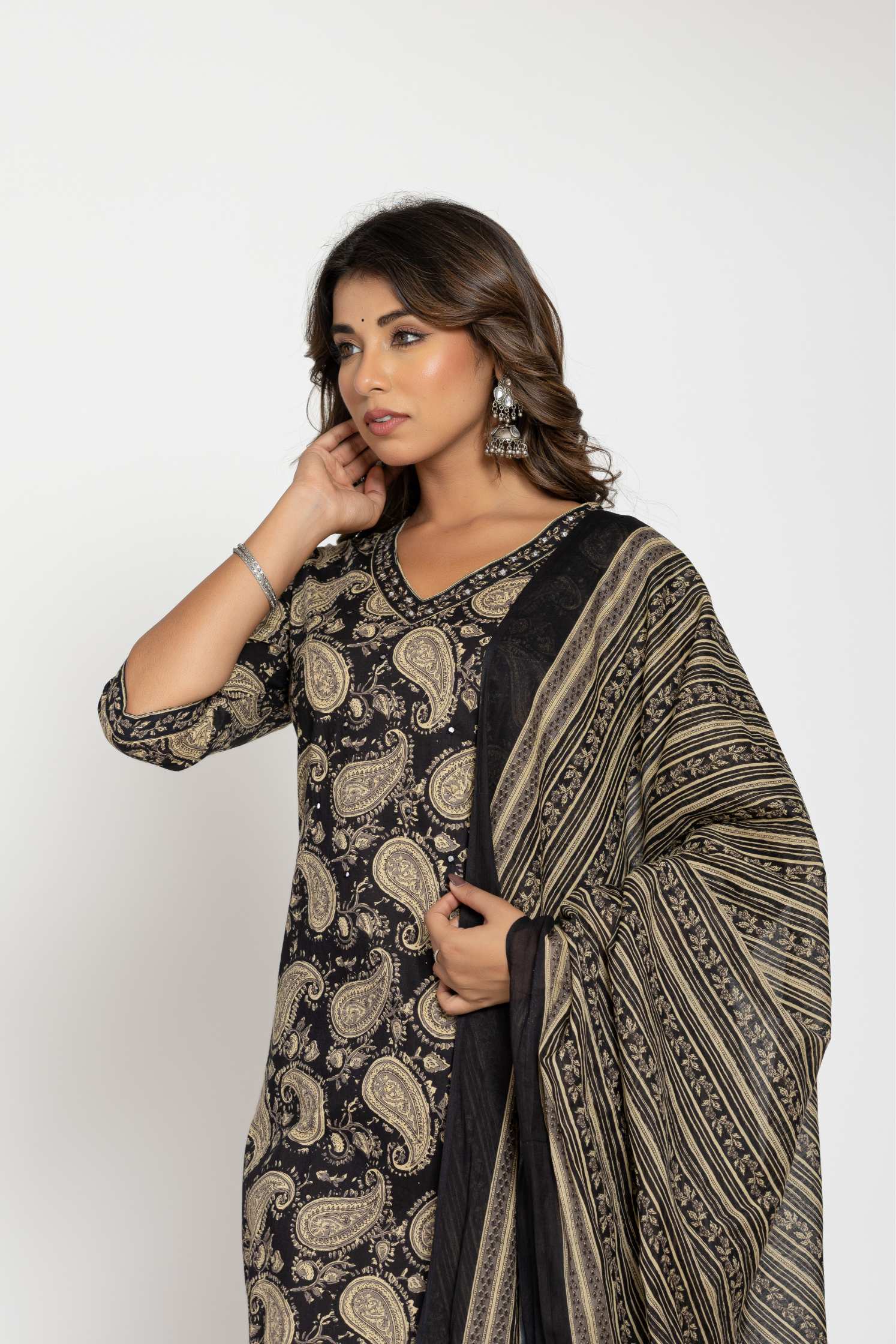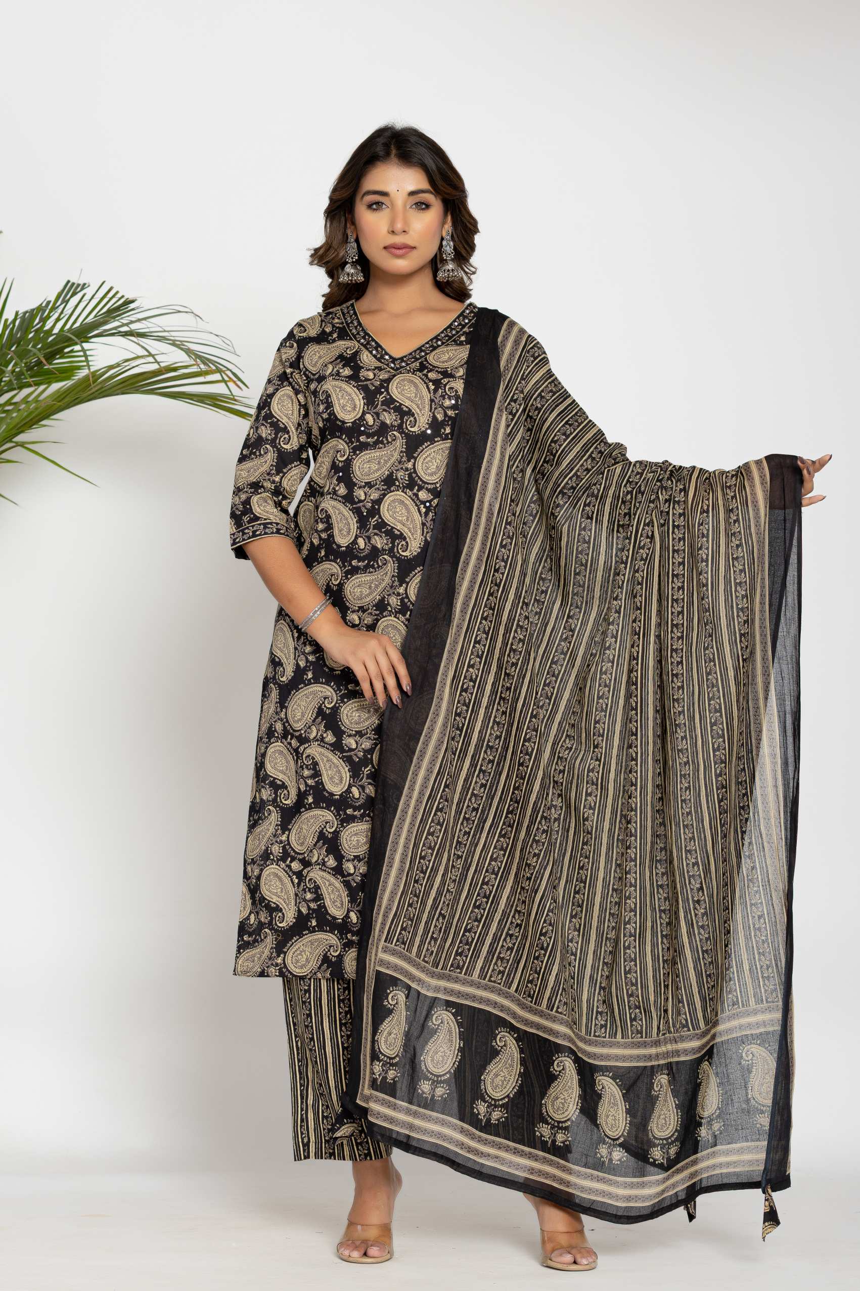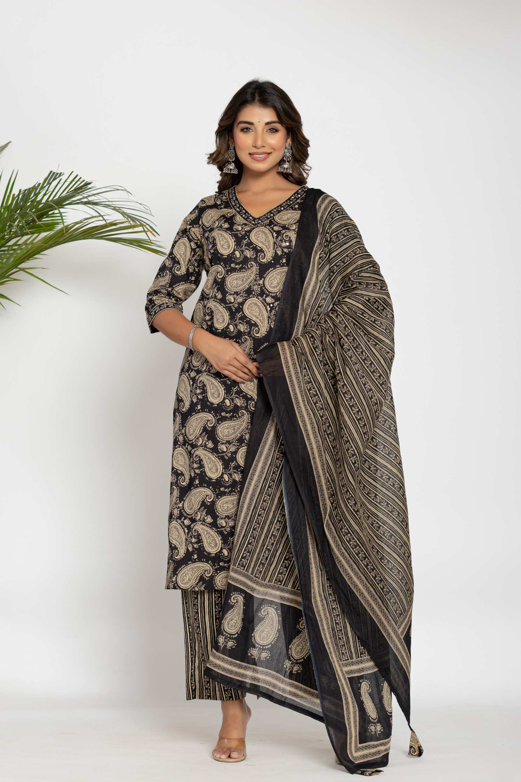 Black & Beige Paisley Printed Cotton Suit Set - Kurti, Pant & Dupatta