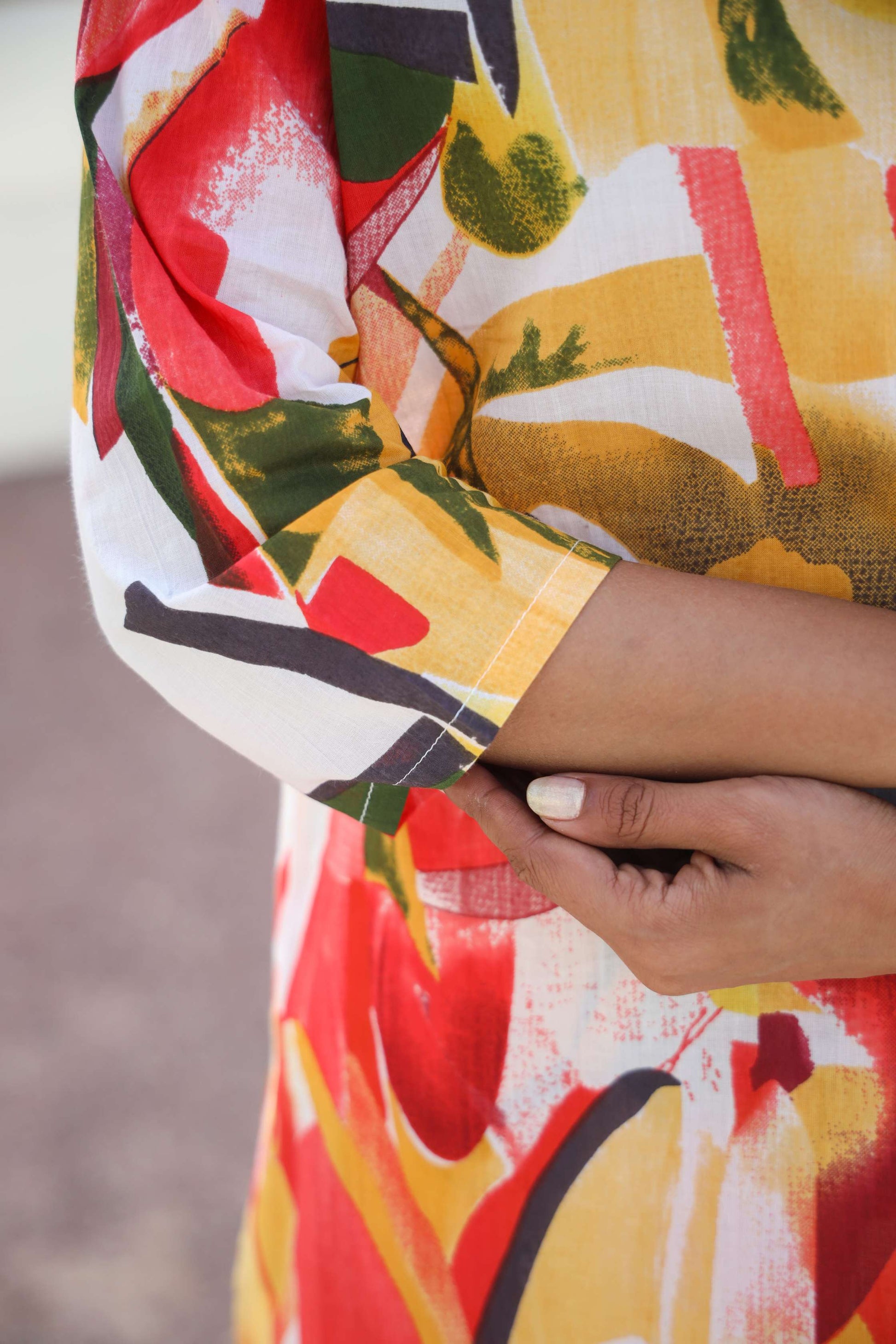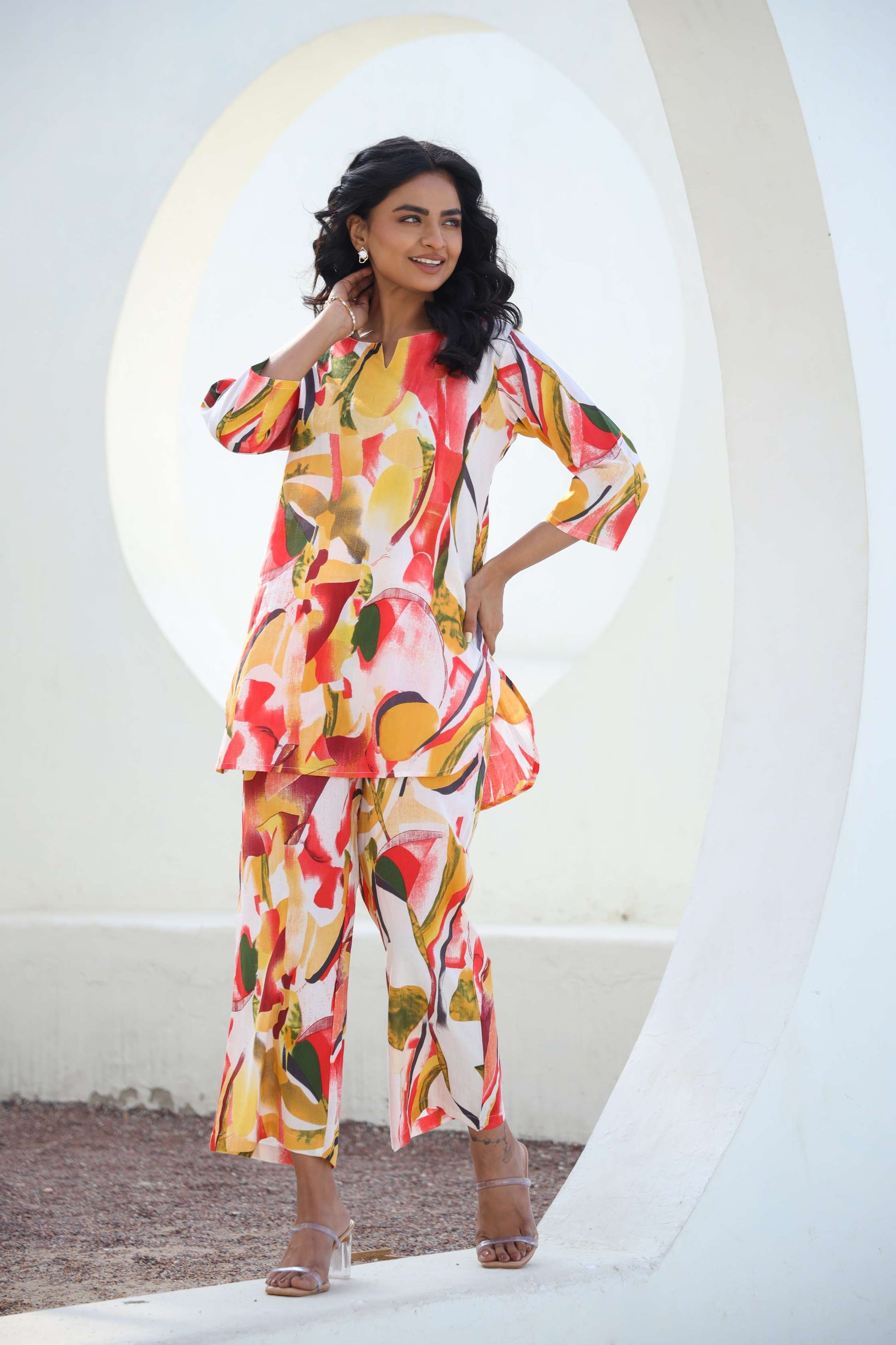 Step into a world of vibrant fashion with this Bold Abstract Cotton Cord Set, perfect for those who love to make a statement. Designed in breathable, soft cotton, this two-piece set features a relaxed-fit top and matching straight-leg pants, ideal for casual outings, brunch dates, or holidays. The art-inspired abstract print in red, yellow, and green hues brings an eye-catching flair to your wardrobe.