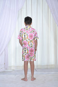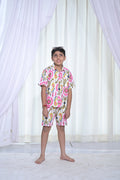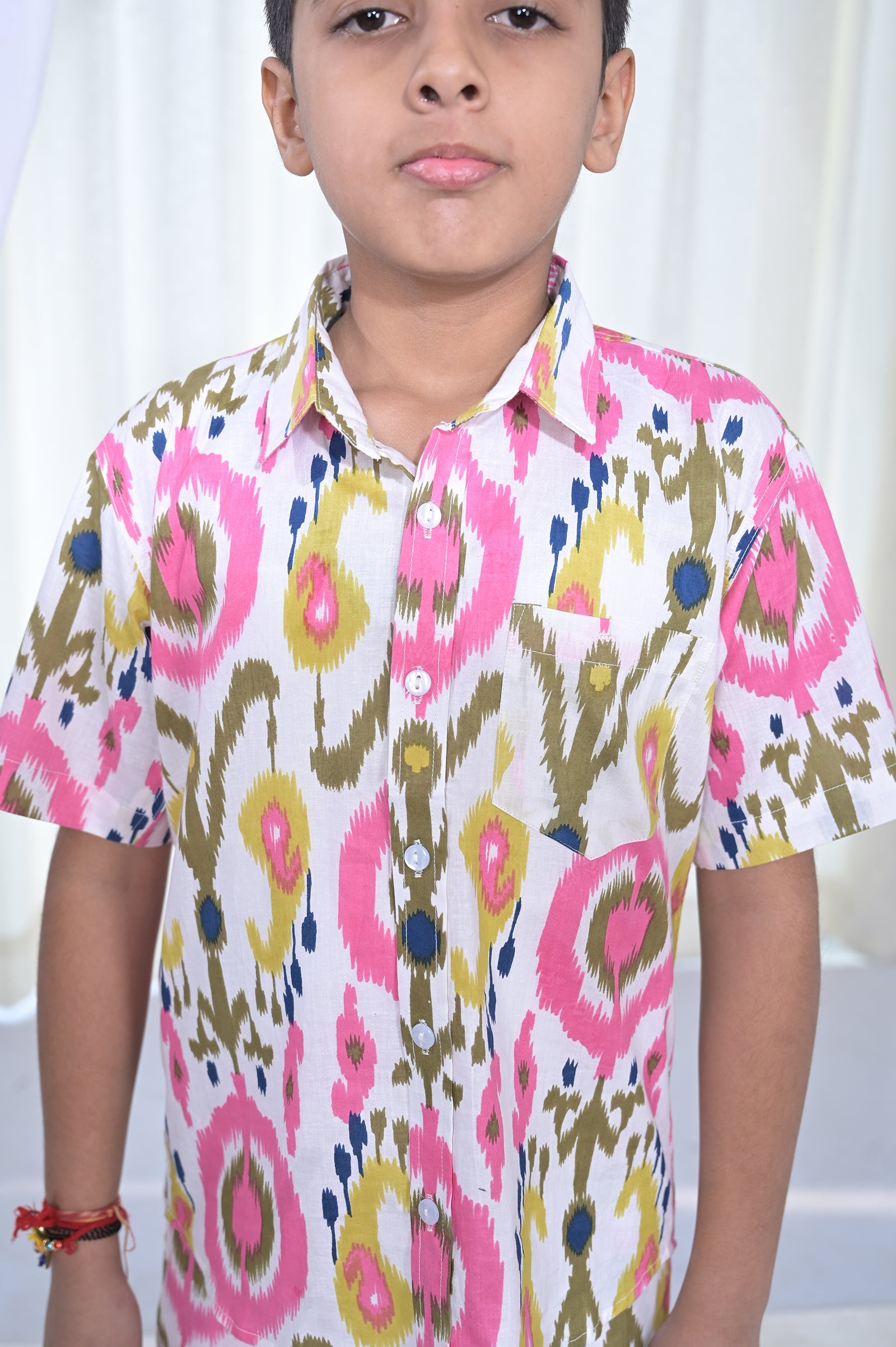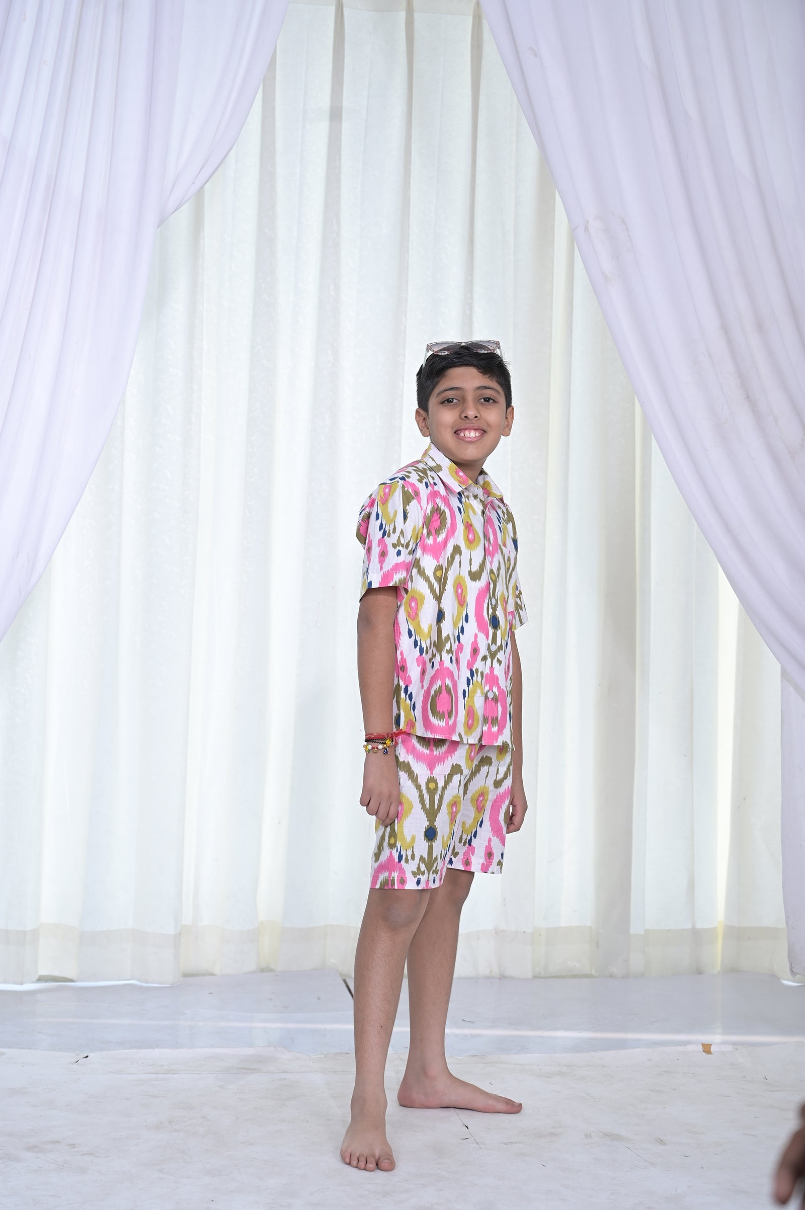 Bursting with color and personality, our Boys' Ikat Pop Print Co-Ord Set is made for boys who love to stand out. With a vibrant ikat-inspired print in shades of pink, olive green, and blue on a white base, this co-ord set blends tradition with trendy style. Made from soft, breathable cotton—perfect for summer days filled with fun and play.