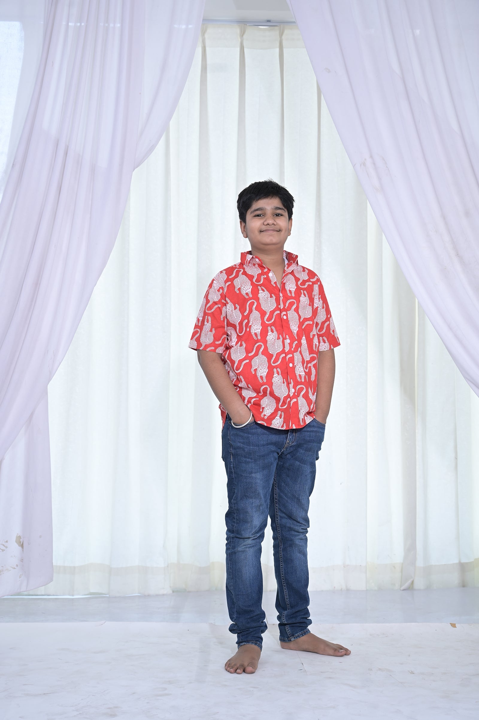 Add a pop of fun to your boy’s closet with this bold red shirt featuring a quirky white cat print. Designed with a relaxed fit and soft, breathable cotton, this shirt is perfect for casual wear, parties, and summer outings. The eye-catching print adds a playful edge to his everyday look.