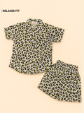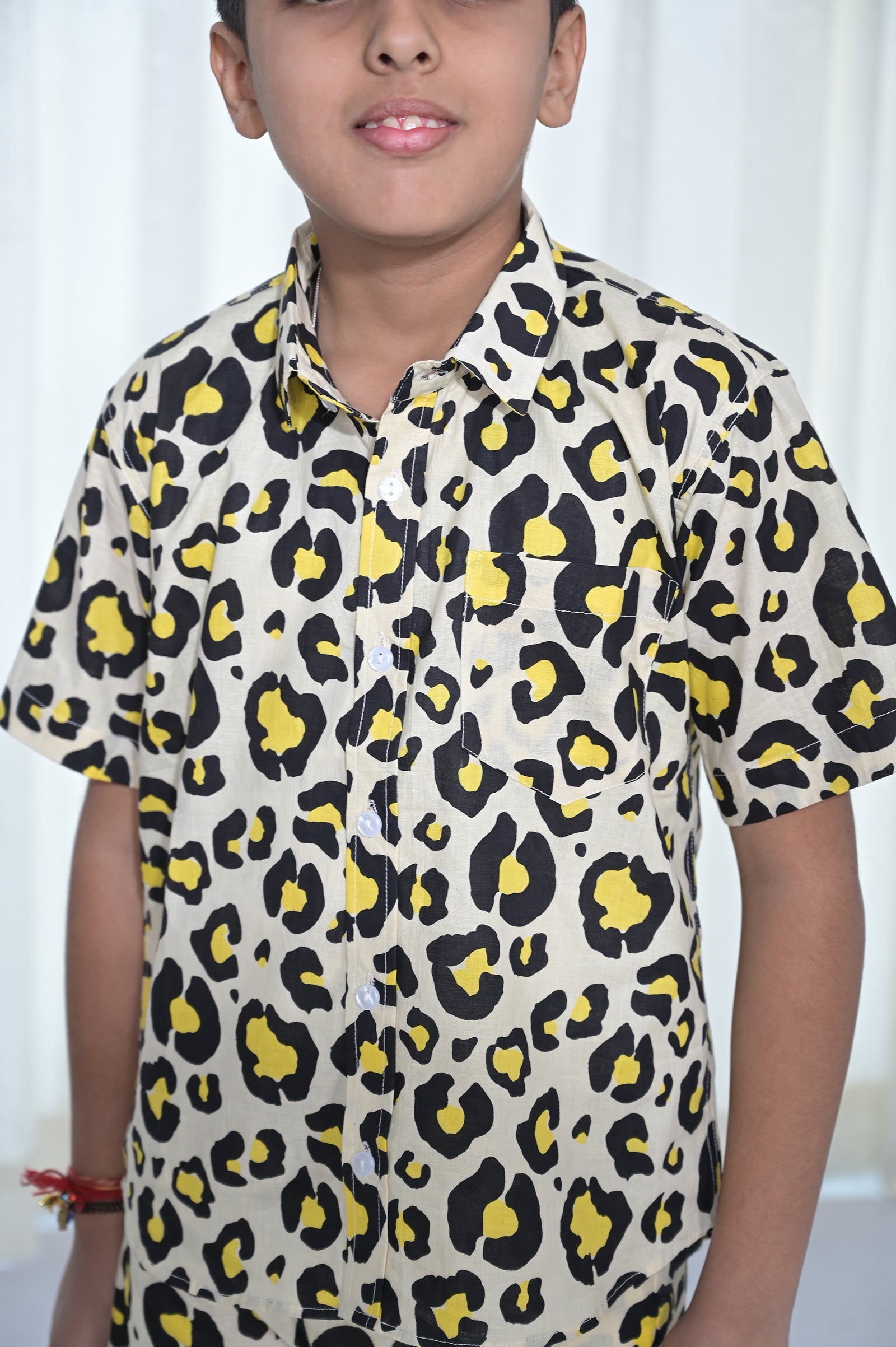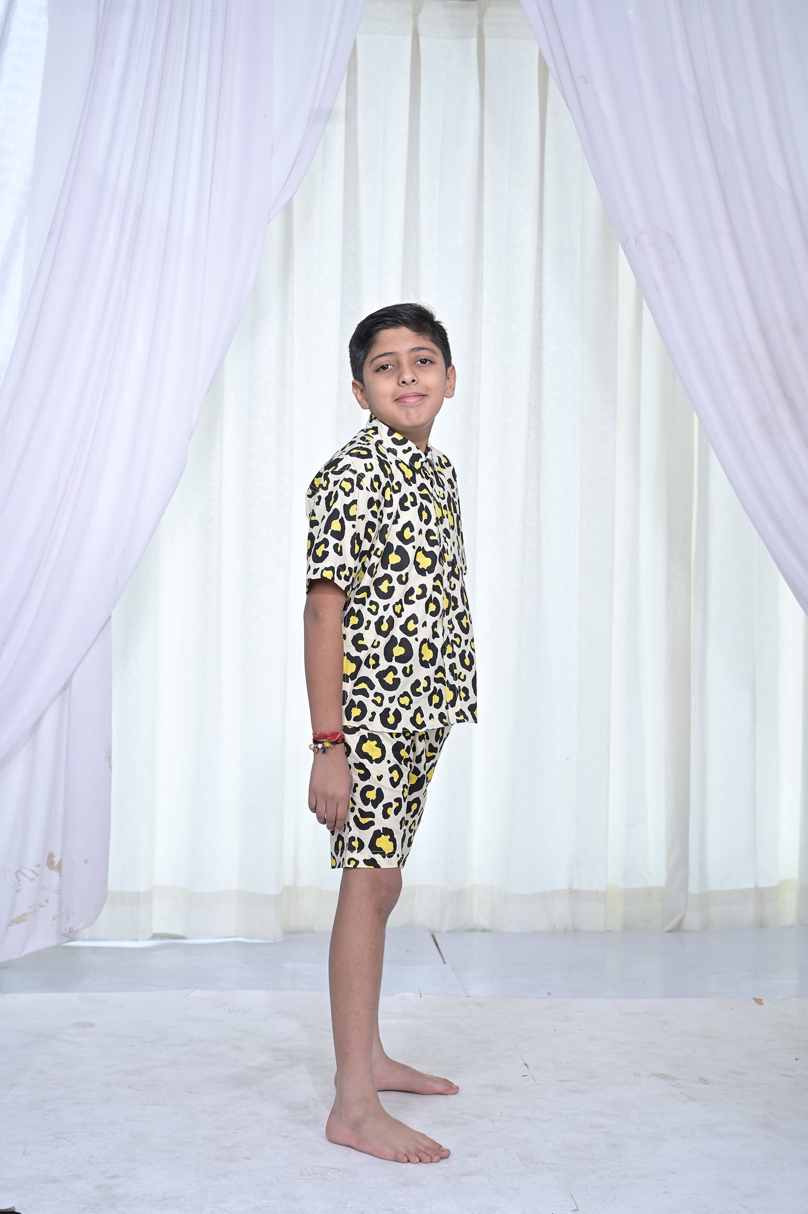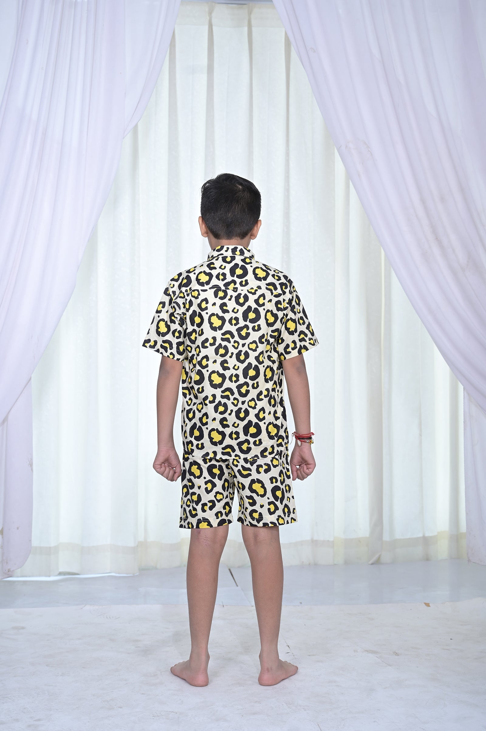 Make a bold fashion statement with our Boys' Wild Style Leopard Print Co-Ord Set. This eye-catching set features a matching short-sleeve shirt and shorts with a lively yellow, black, and cream leopard pattern. Perfect for fun summer outings, parties, or casual days, this outfit lets your child show off their adventurous side while staying comfortable all day.