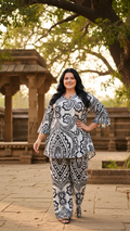 The set features a beautifully printed tunic top and coordinating wide-leg palazzo pants, both crafted from soft, breathable 100% cotton fabric. The intricate paisley (or medallion) print in classic black and white offers a sophisticated yet bohemian aesthetic, ensuring you look chic whether you're relaxing at home or stepping out for an event.
