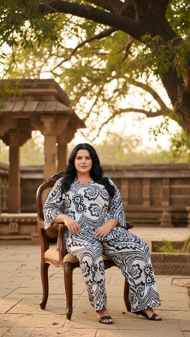 Discover the perfect blend of comfort and timeless elegance with our stunning Black & White Paisley Print Cotton Co-ord Set. This matching ensemble is designed for the modern woman who appreciates both style and ease, making it a versatile addition to any wardrobe.