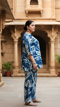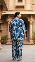 Elevate your casual ethnic style with this plus-size blue floral cotton co-ord set, crafted for all-day comfort and timeless elegance. The soft cotton fabric features a stunning white leaf handblock print on a rich indigo base, creating a beautiful blend of tradition and modernity.
