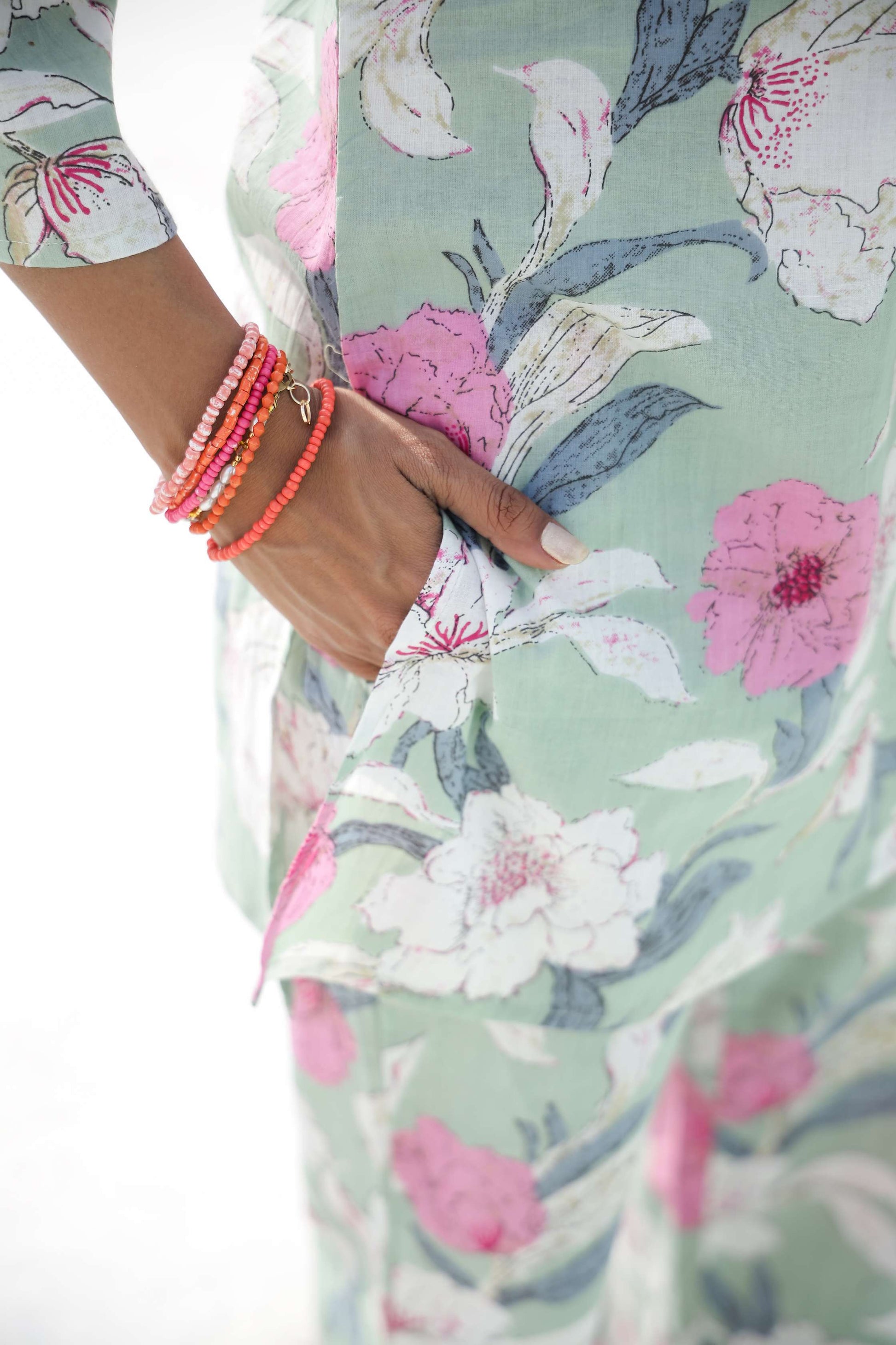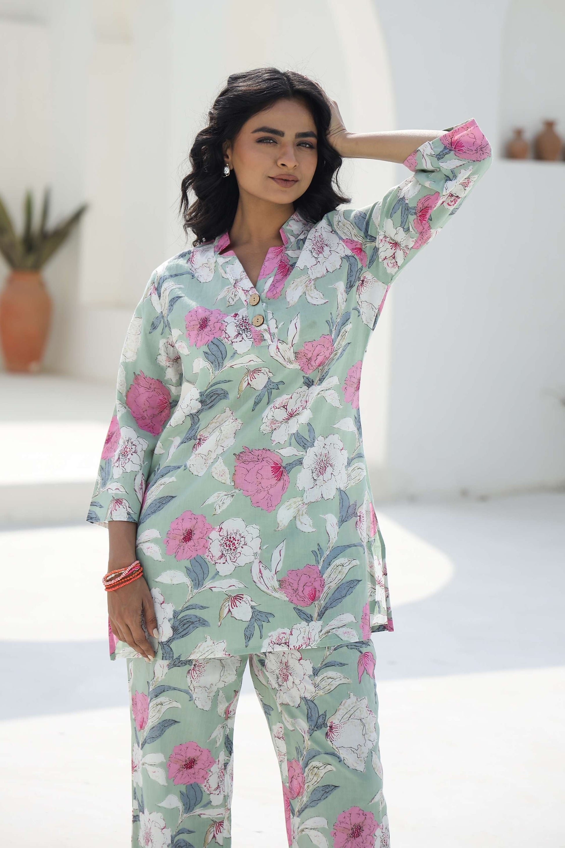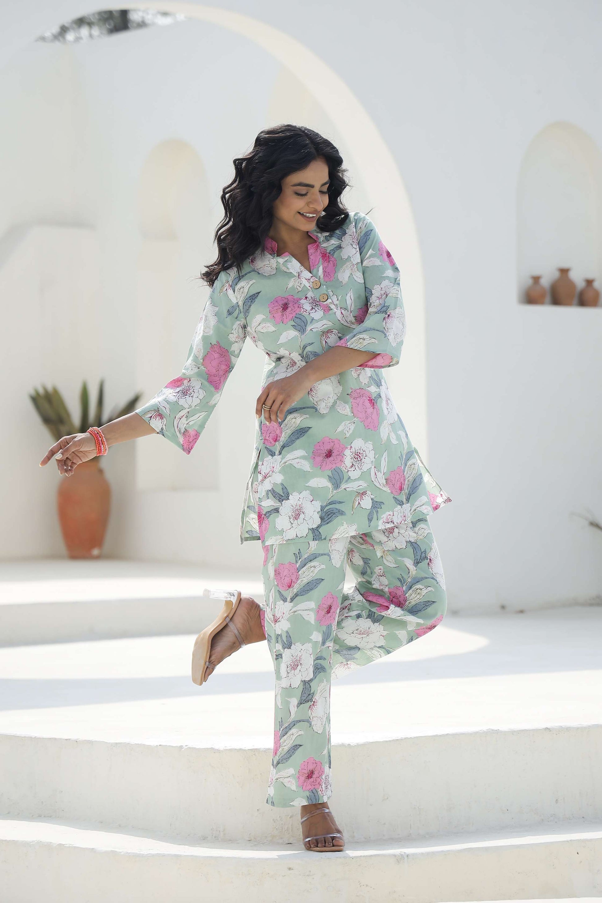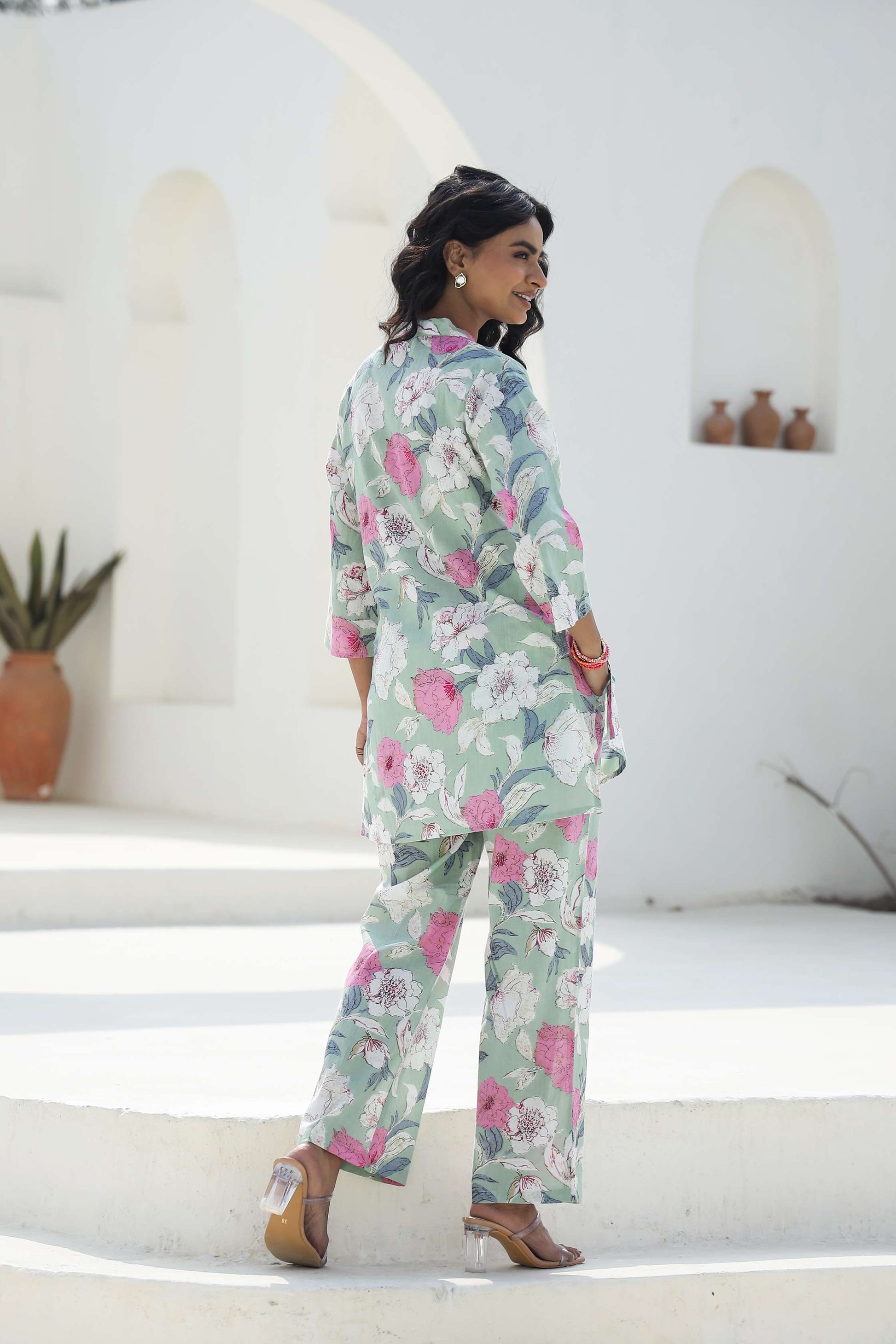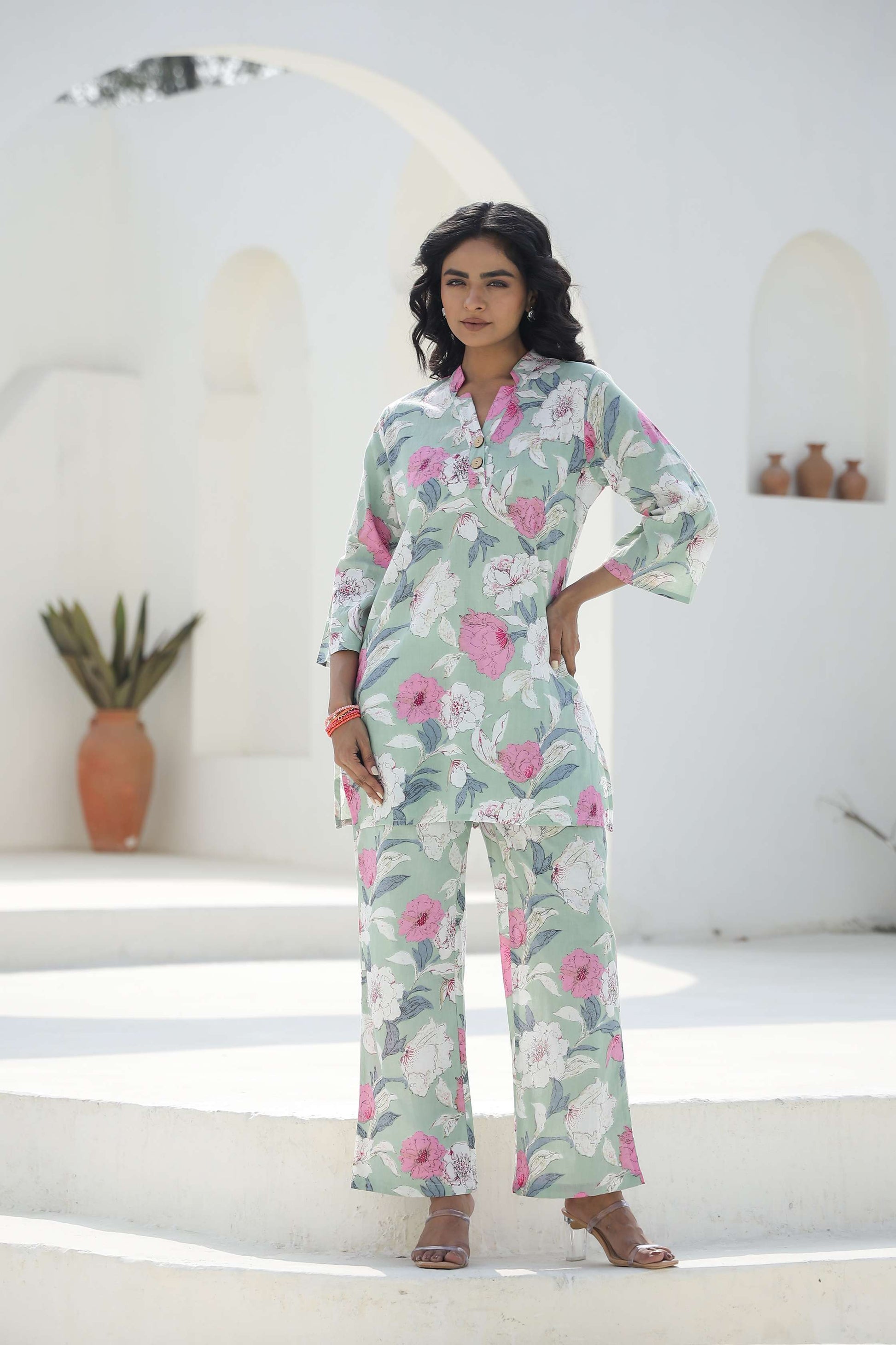 Step into effortless elegance with our Floral Print Co-Ord Set, designed to bring comfort and sophistication to your wardrobe. Featuring a breathable, lightweight fabric, this set includes a stylish tunic top with a relaxed fit and matching straight-leg pants. The soft floral print adds a refreshing touch, making it perfect for brunches, vacations, or casual outings.
