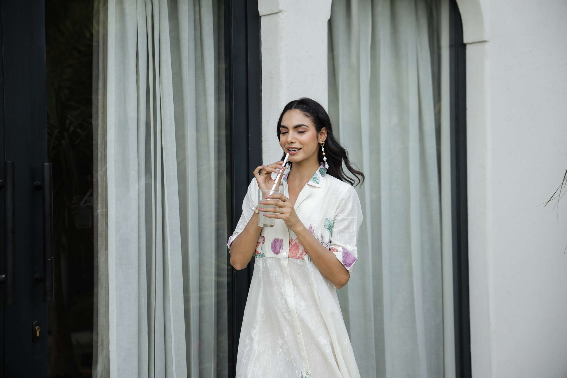 Elegant Lotus Floral Print Shirt Dress for Women – White Midi