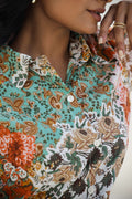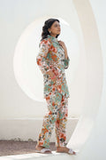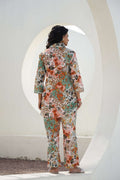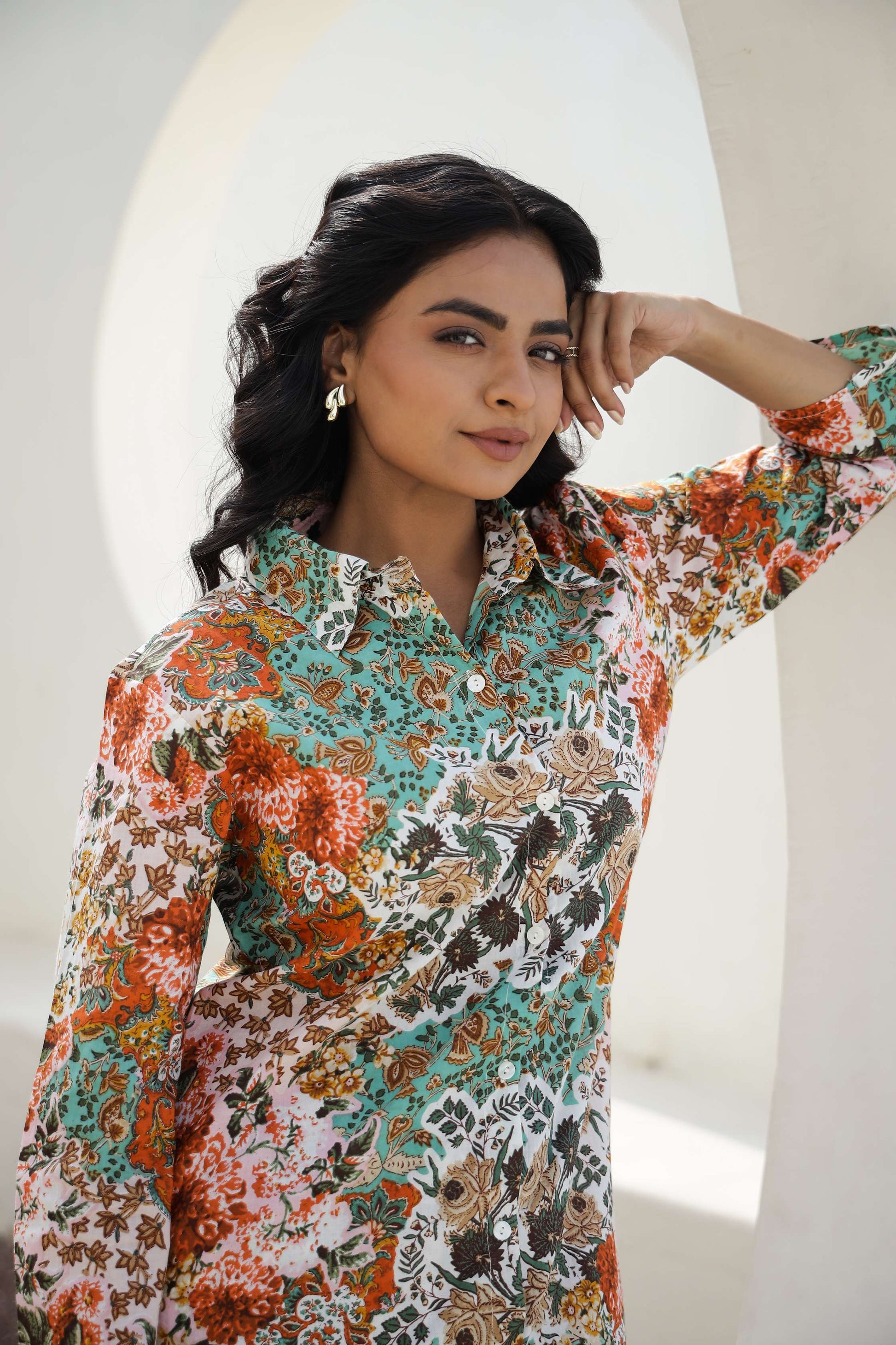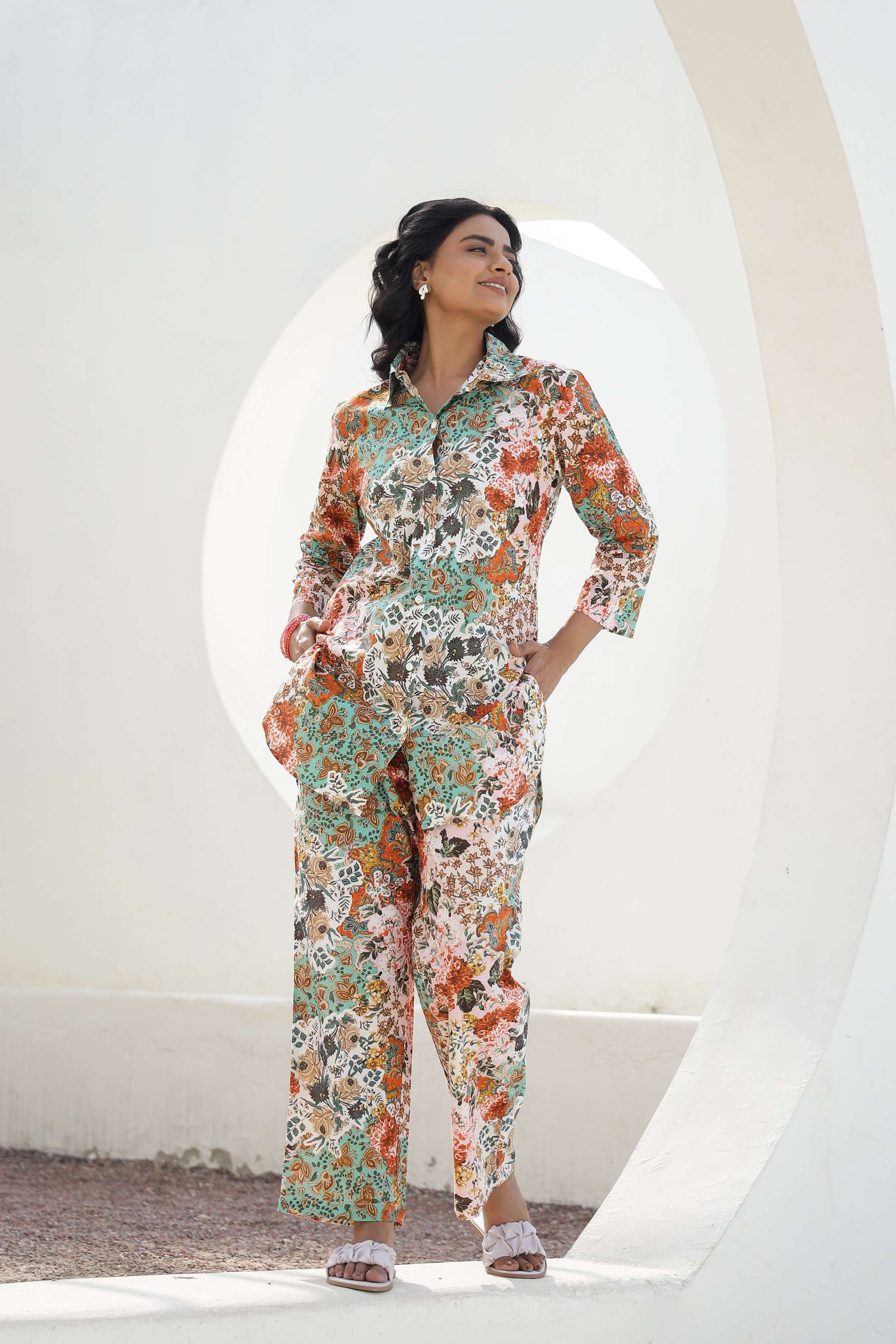 Step into effortless elegance with this Floral Fusion Collared Cotton Cord Set. Featuring a vibrant mix of floral prints in soft greens, rust, and earthy tones, this co-ord set brings together comfort and style. Crafted from premium cotton, the set includes a collared button-down top with 3/4th sleeves and matching straight-fit trousers — perfect for casual outings, brunch dates, or weekend getaways.
