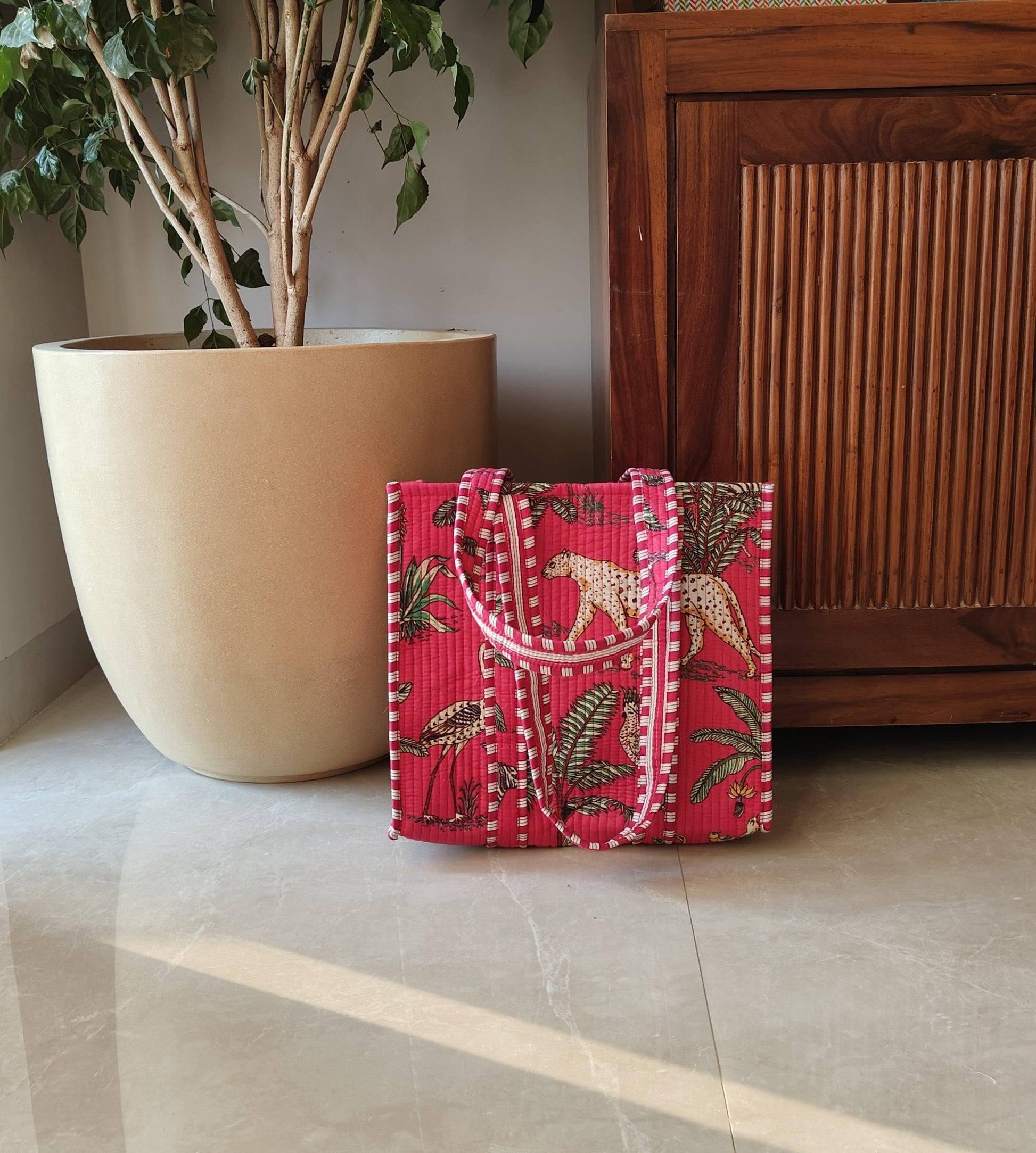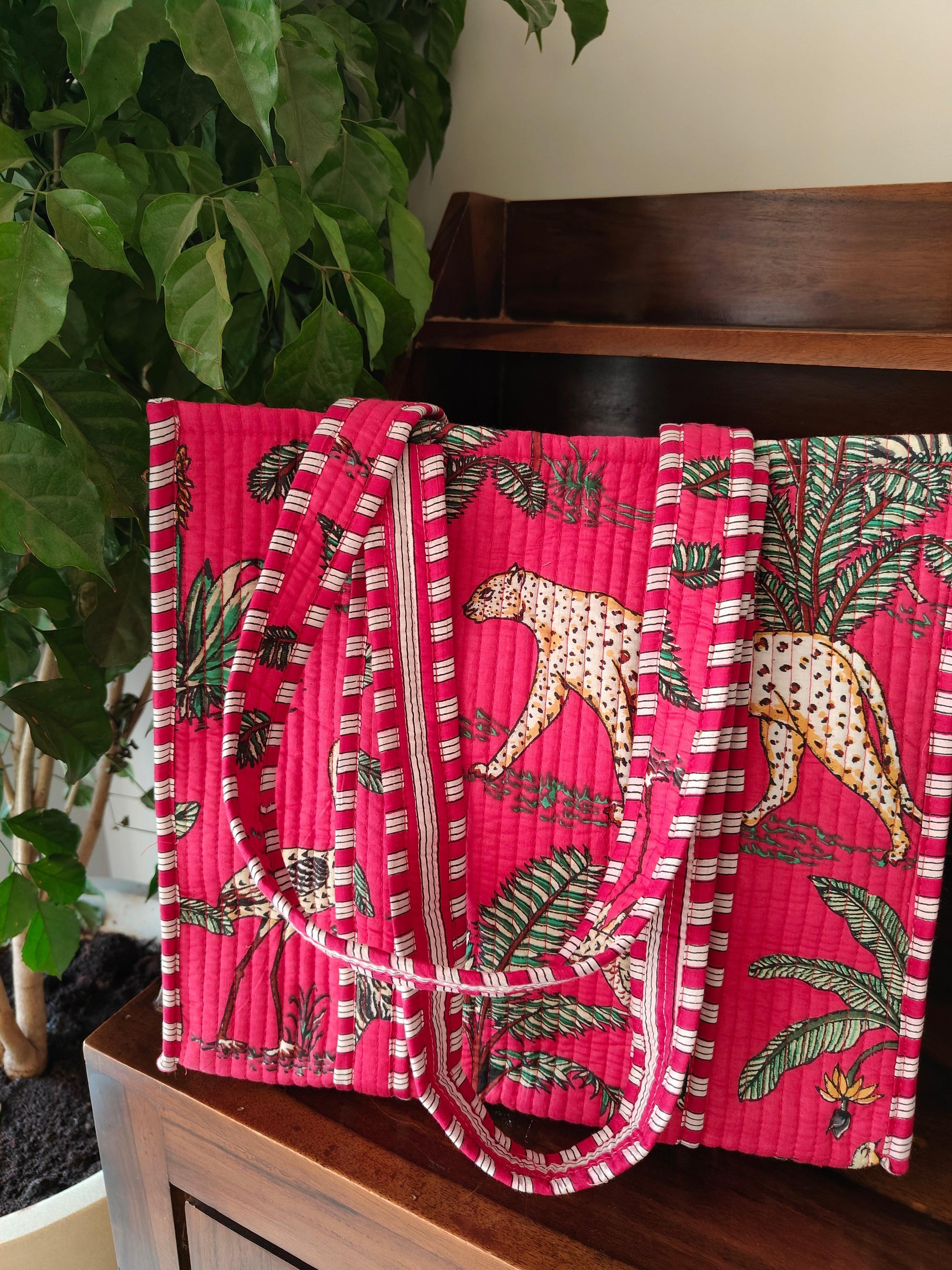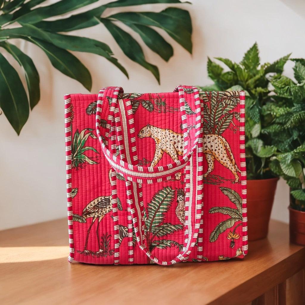 Handcrafted Jungle-Print Pink Tote Bag for Indian Women – Eco-Friendly, Spacious & Stylish
