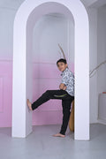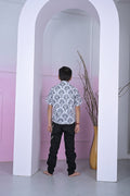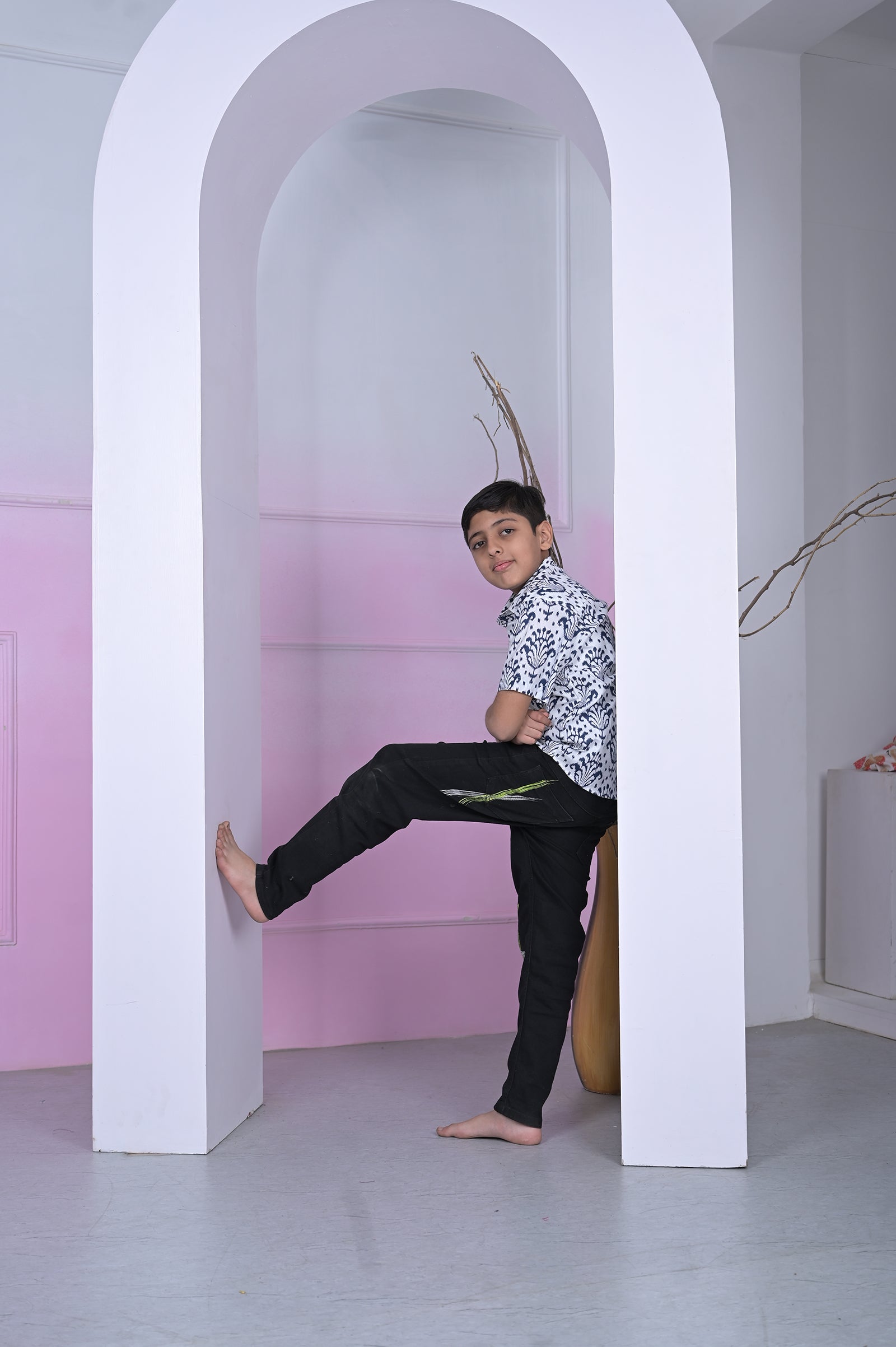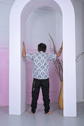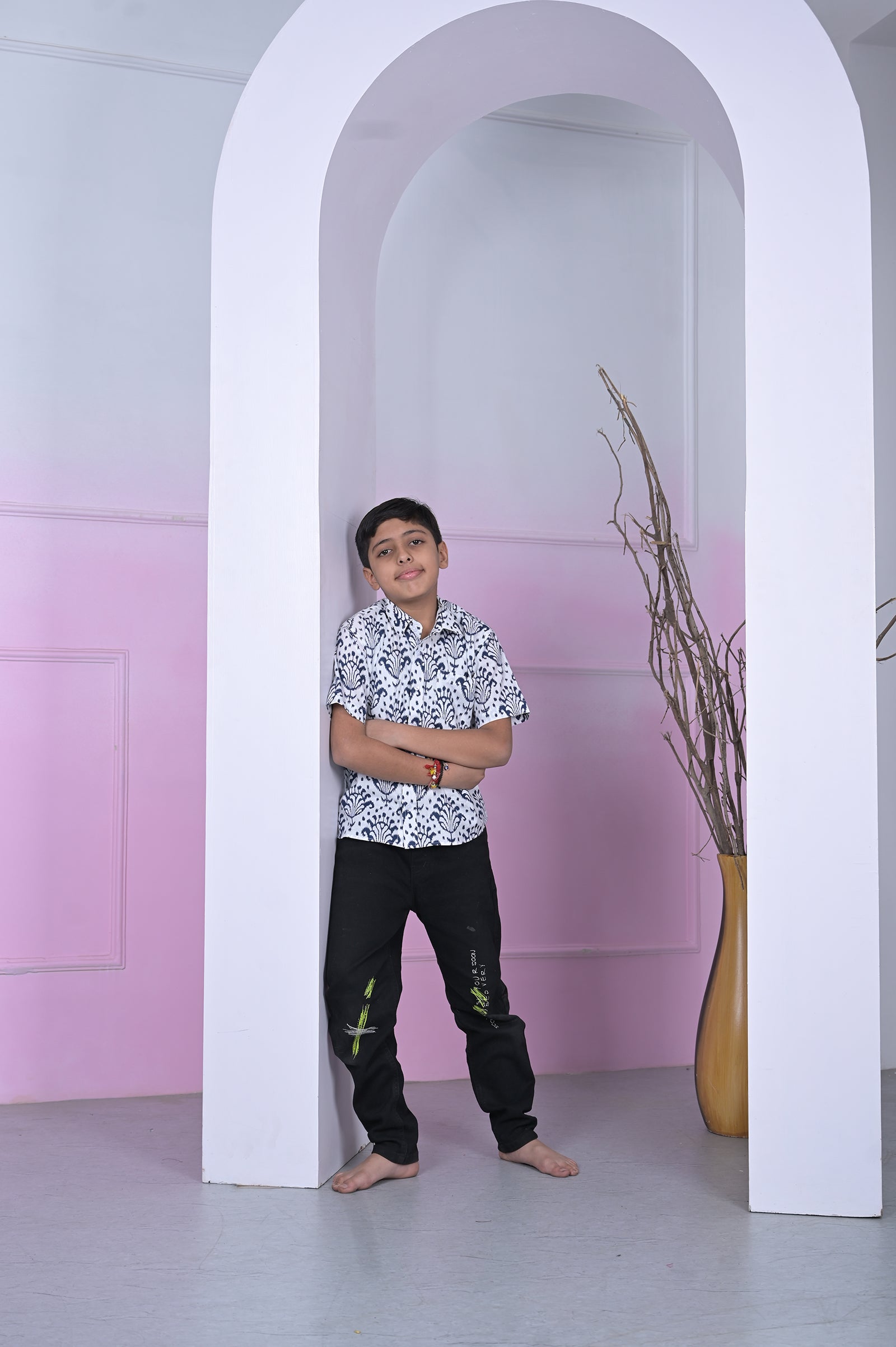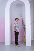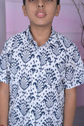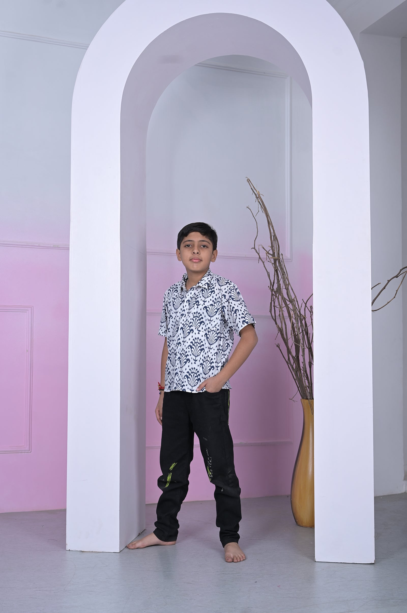 Blend traditional block-print artistry with modern style. This crisp white shirt features navy hand-inspired motifs for a sophisticated yet playful look that works for casual and semi-formal kids’ occasions.