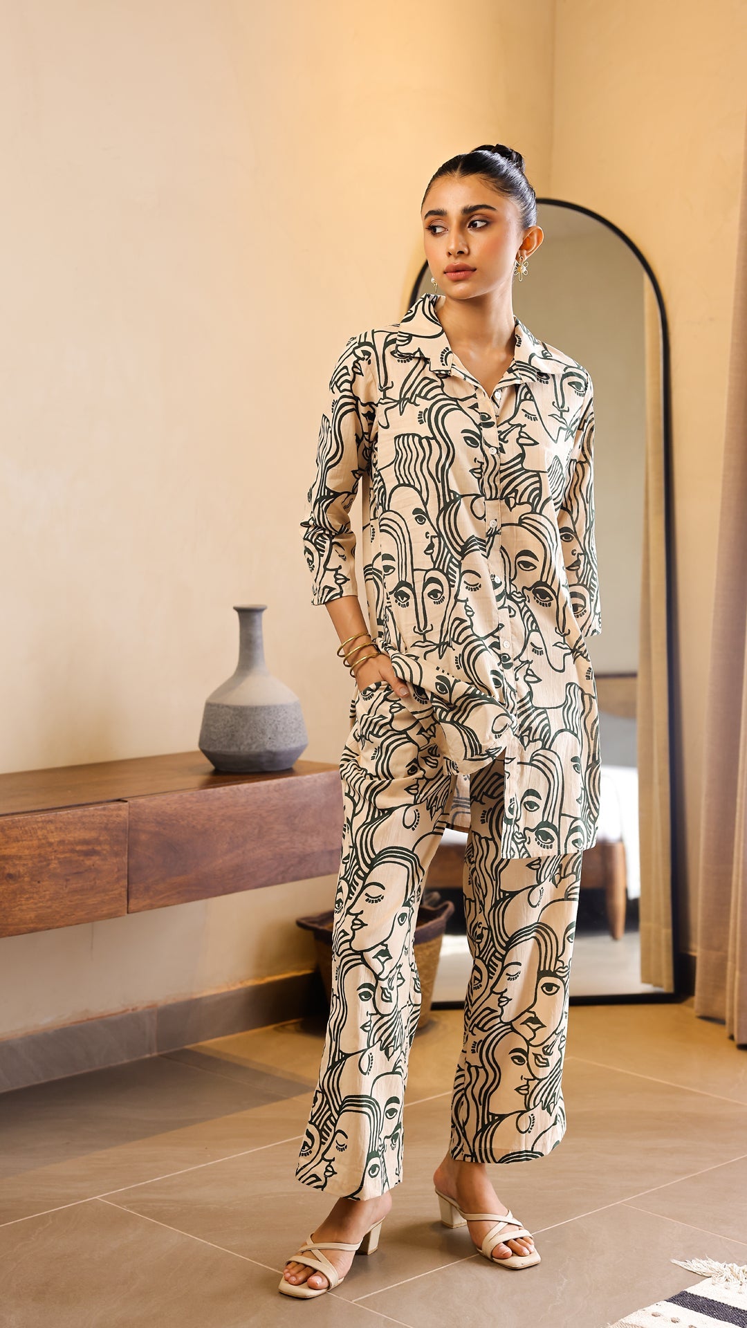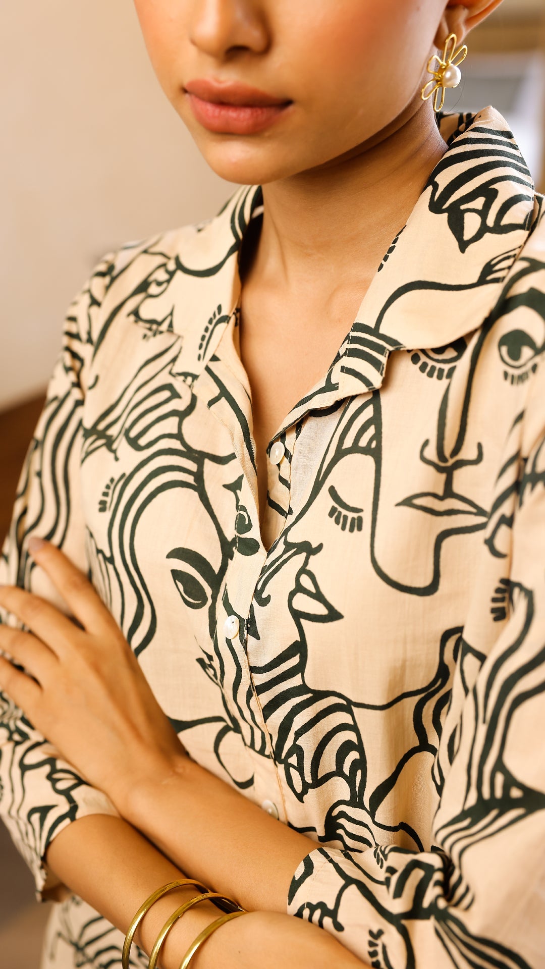 A bold yet elegant co-ord set in beige, adorned with abstract black face prints. Made from breathable cotton-linen, this kurta and pant combo is ideal for casual chic or workwear styling. Front button-down design adds modern structure to artistic charm.