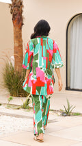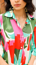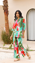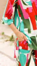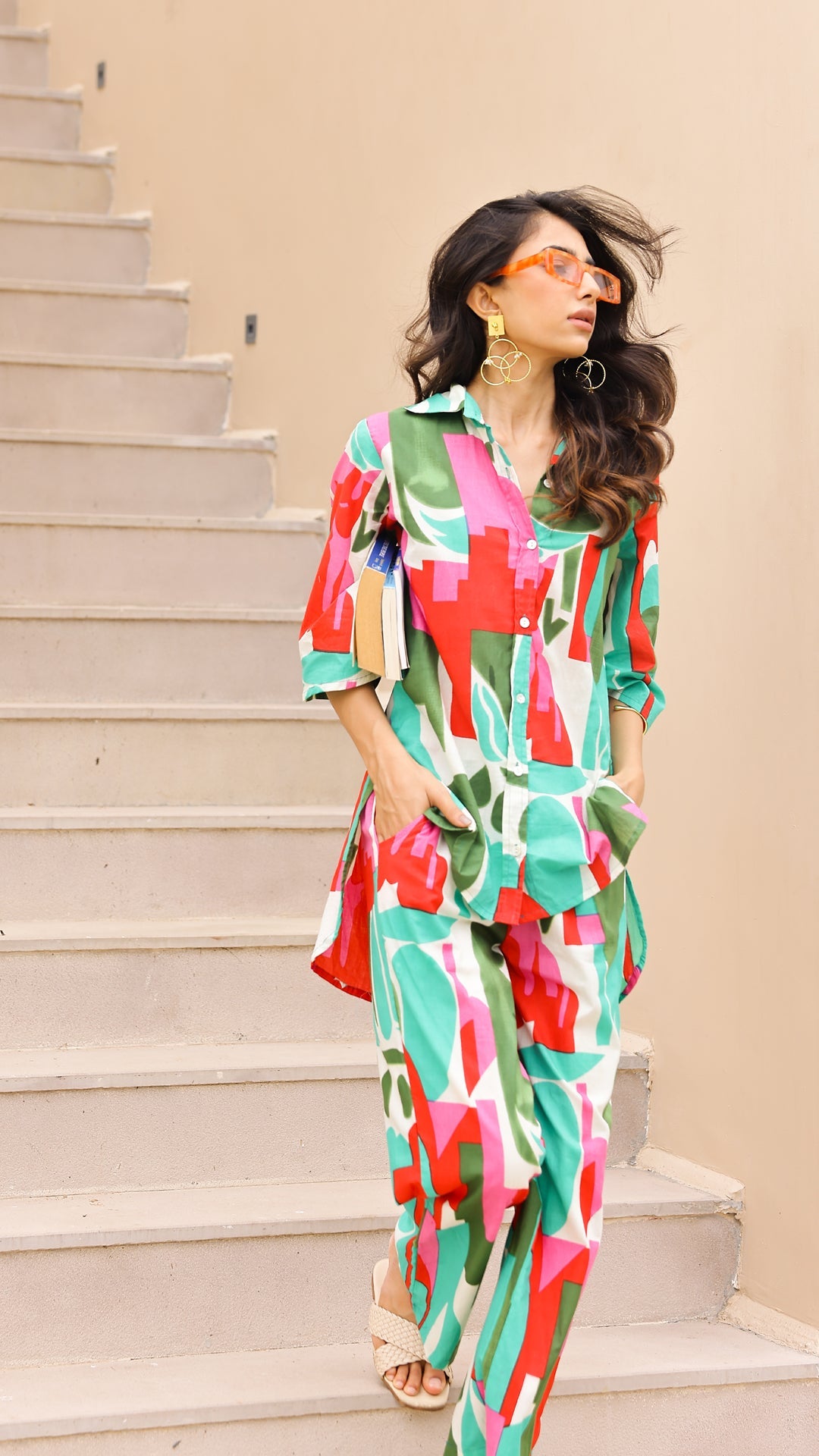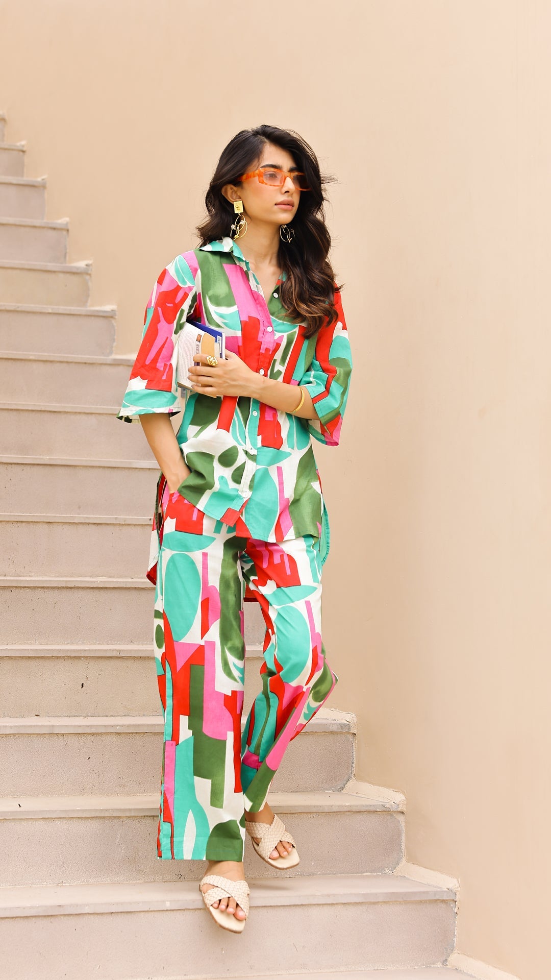 Bring the energy with this bold multicolor abstract co-ord set. Designed with a relaxed-fit button-down shirt and matching straight-leg pants, it’s made from soft, breathable fabric to keep you stylish and cool from day to night.