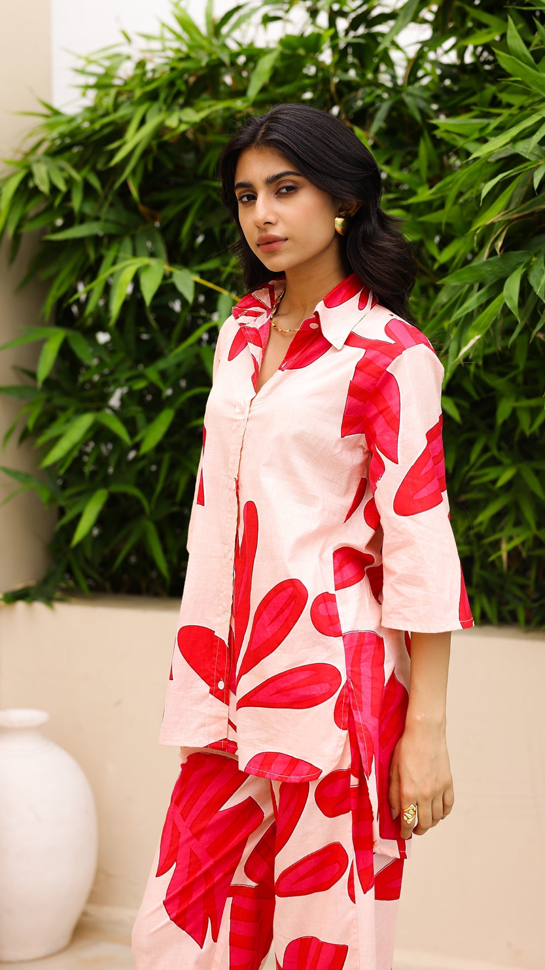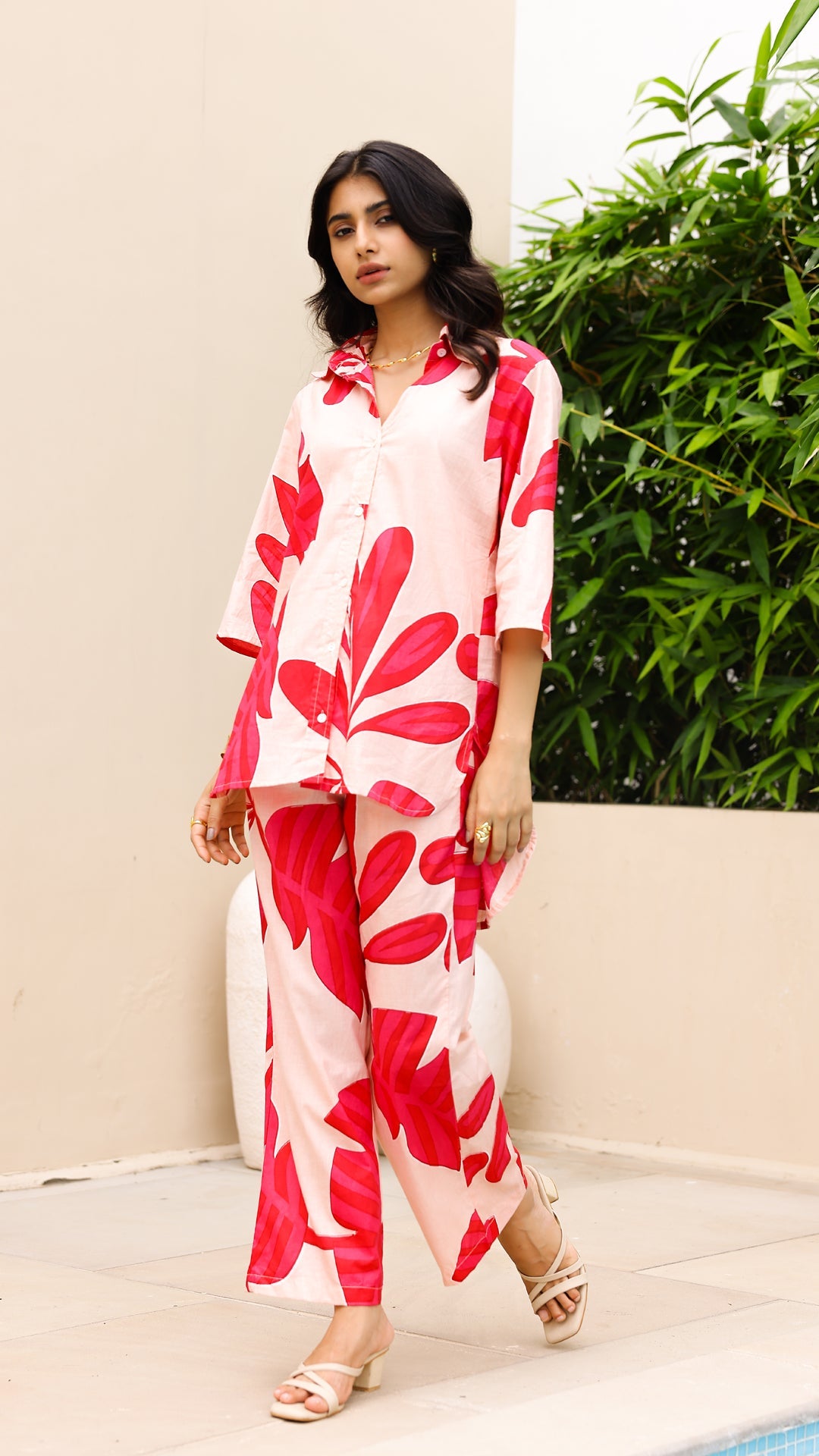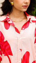 Fresh, bold, and perfect for summer – this blush pink co-ord set with oversized hot pink leaf print is your go-to for tropical flair. Crafted in soft cotton with a relaxed fit, it blends comfort with statement style.