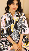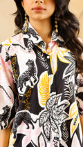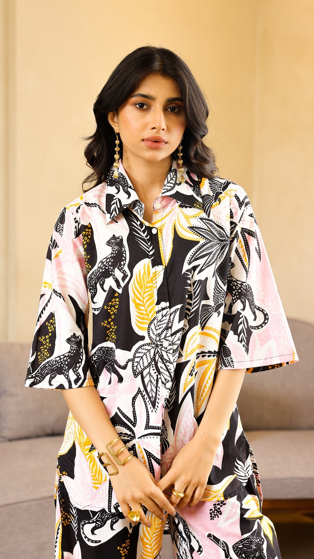 Stand out in this bold jungle-inspired co-ord set featuring leopards, palms, and abstract foliage in a unique black, blush, and yellow palette. Crafted in breathable cotton with a relaxed fit, it's your perfect statement outfit.