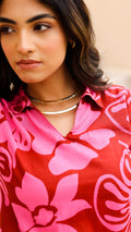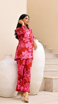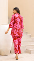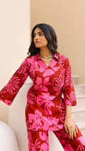 Stand out in this ruby red co-ord set, featuring bold pink floral prints. Made from soft cotton, it combines a relaxed fit with effortless elegance, perfect for casual chic days or statement evenings.