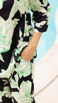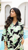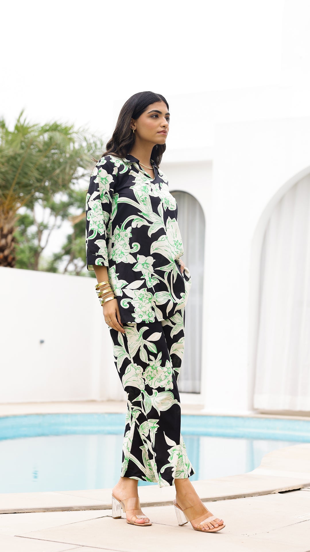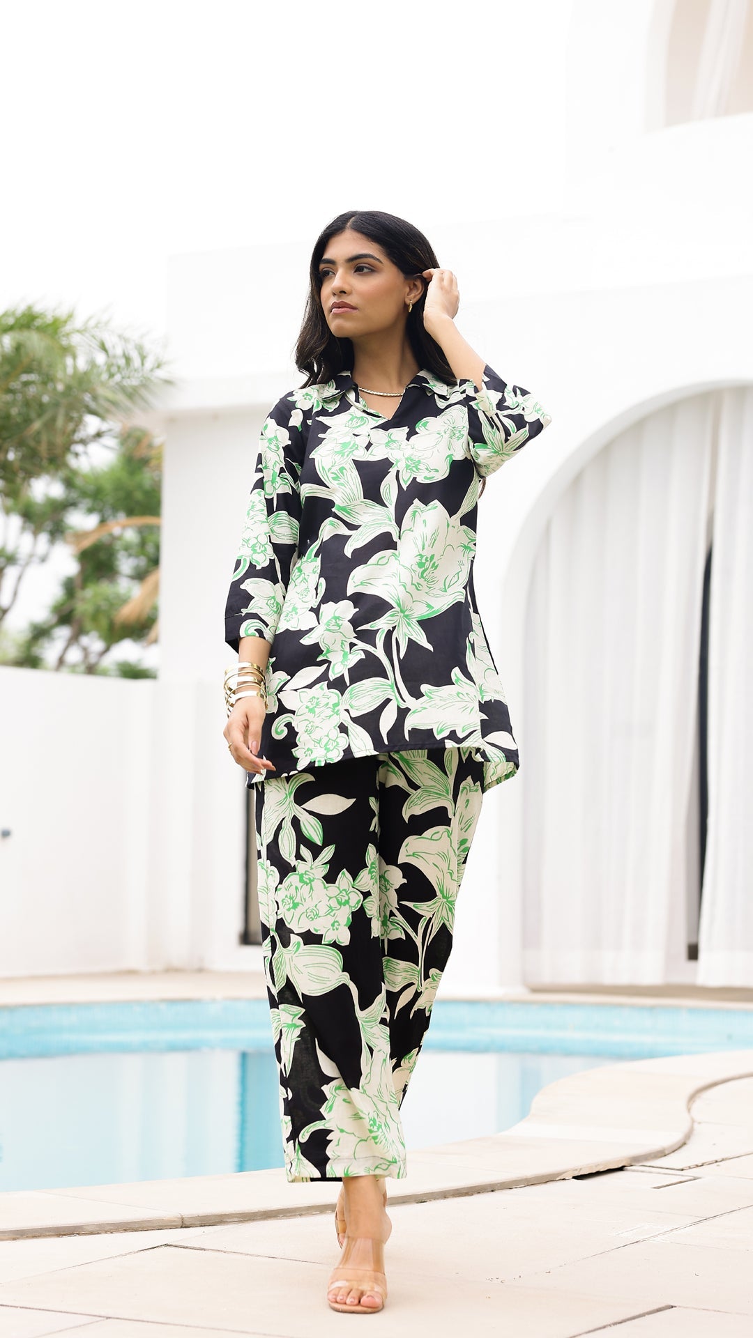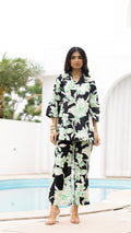 Turn heads in this statement floral co-ord set, designed for women who love to stand out. Featuring a relaxed-fit shirt with a notch collar and wide-leg pants, this black and mint green set is crafted in soft, breathable fabric – perfect for brunch dates, resort days, or bold everyday style.