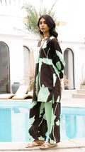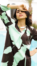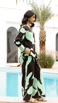 Make a bold style statement with the Mint Leaf Co-ord Set. Featuring an oversized mint-on-brown leaf print and a flattering V-neckline, this set blends modern elegance with breezy comfort. Perfect for tropical days and urban getaways.