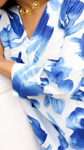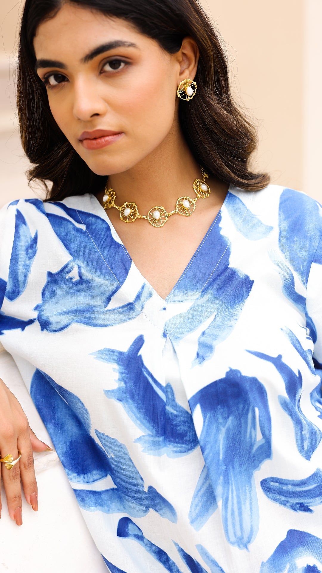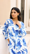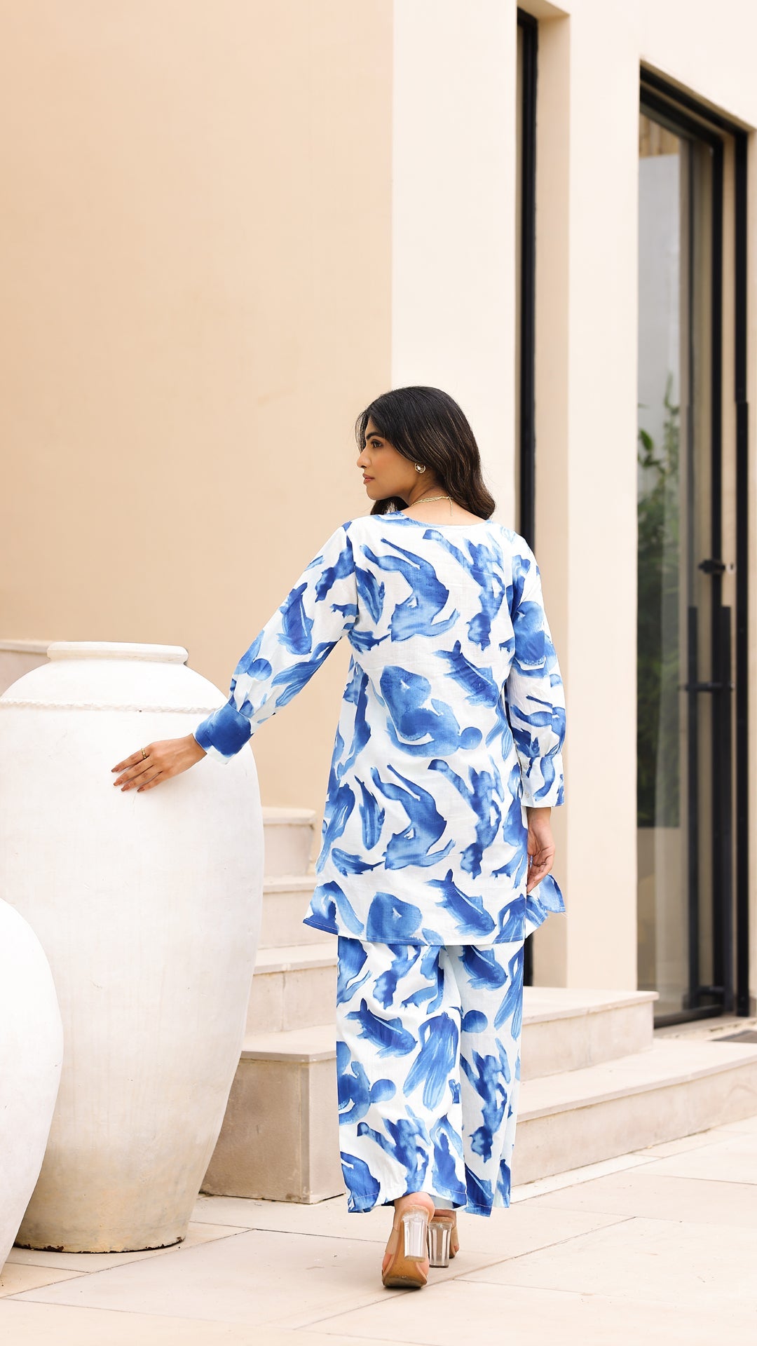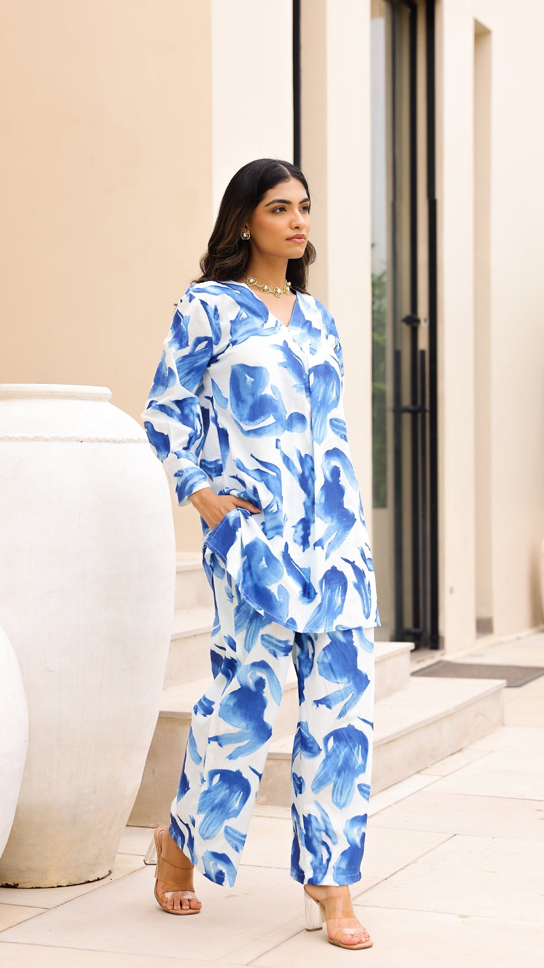 Make a statement in this breezy blue and white co-ord set featuring an abstract watercolor print. The flowy V-neck top and relaxed pants are crafted in ultra-soft fabric – perfect for summer getaways, casual brunches, or everyday elegance.