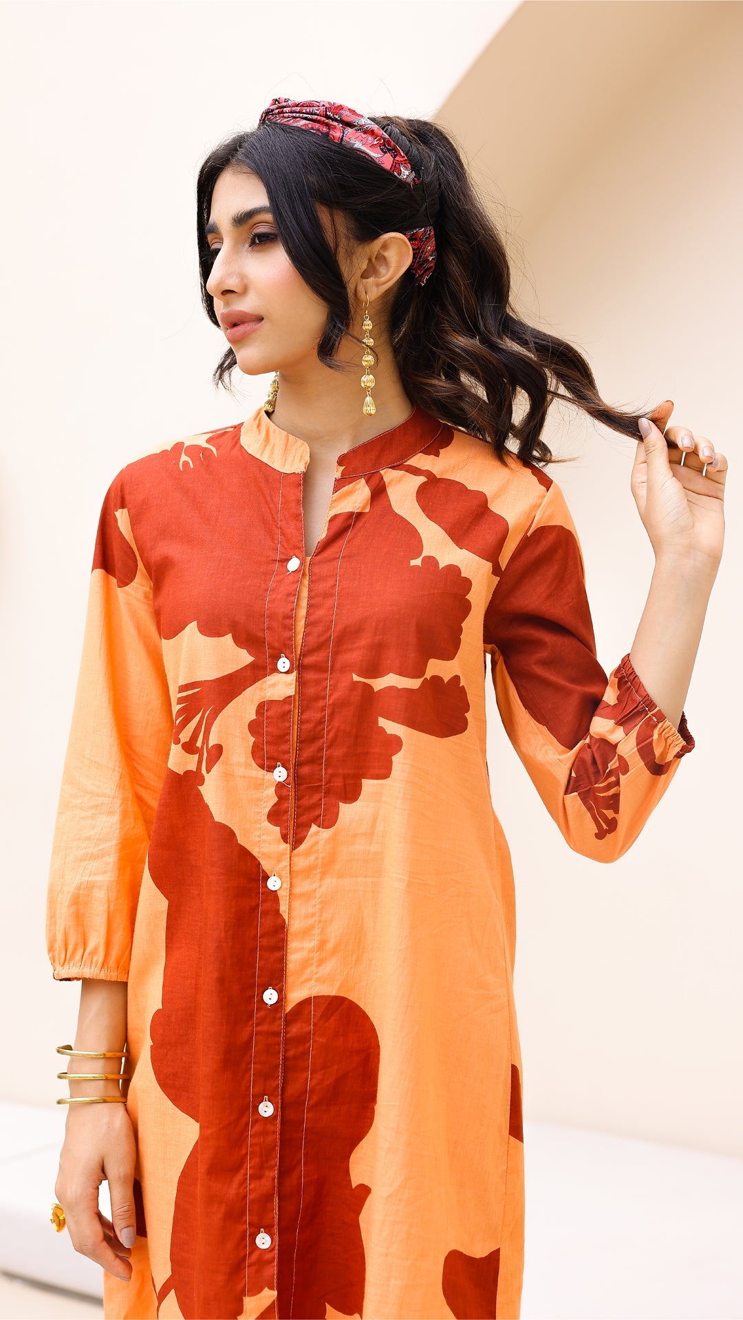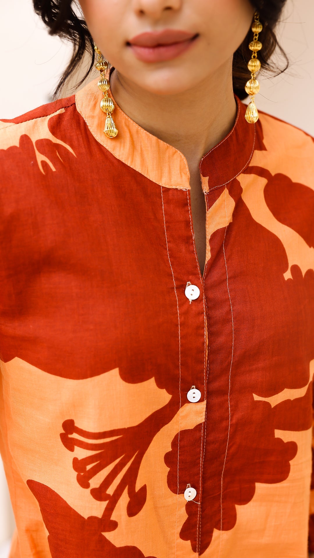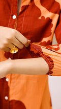Make a bold statement with this rust orange oversized floral co-ord set. Crafted from soft, breathable cotton-linen, it features a button-down kurta with balloon sleeves and straight-fit pants. The striking contrast floral print adds an artistic, elevated touch to casual or festive dressing.